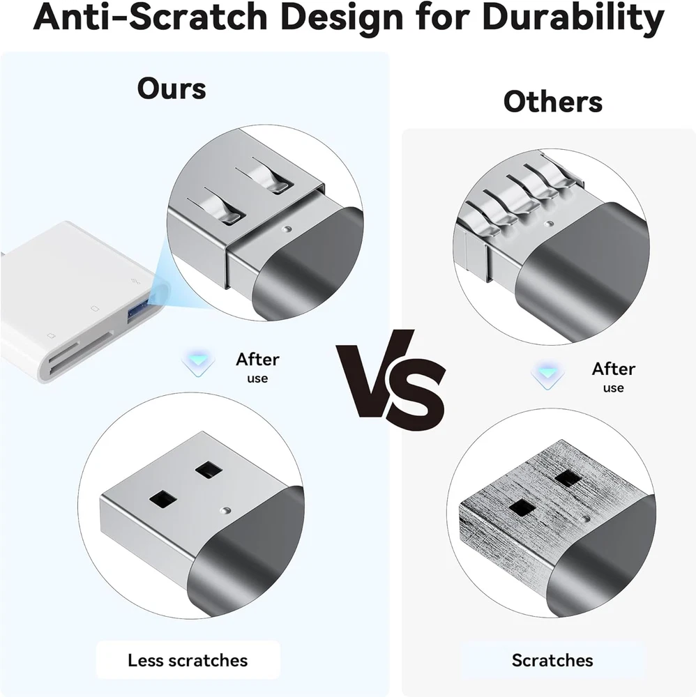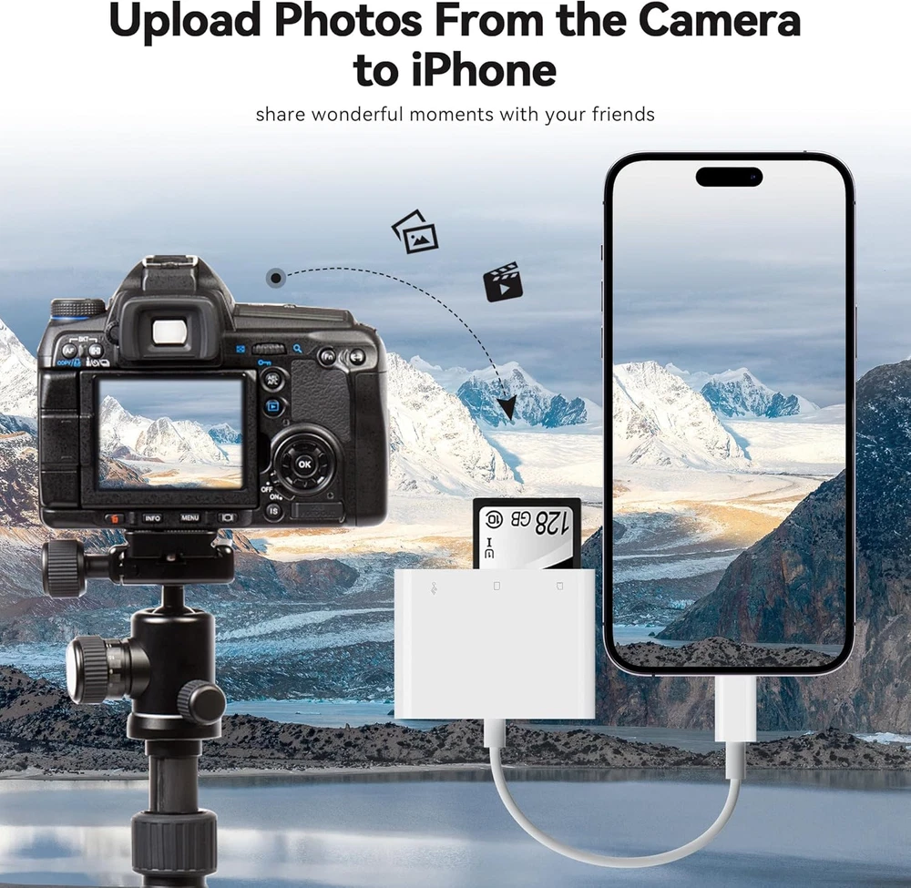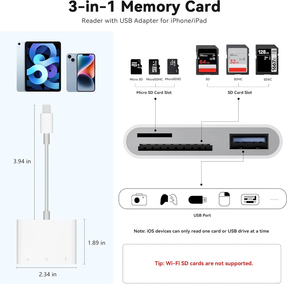 Store New Arrivals Add to Favorite View Feedback Contact SD Card Reader for Iphone Ipad, Micro SD Card Reader Memory Card Reader with USB Description Item model number reader-2SD Operating System iOS, iPad OS, Mac OS, Android Media Type microSDHC, microSDXC, SDHC, SDXC, SD Card Color white Series XHN-L+pro-USB Brand SUNTRSI Color white Item Weight 1.13 ounces Connectivity Technology USB Manufacturer SUNTRSI Special Feature Plug & Play Package Dimensions 3.7 x 2.87 x 0.55 inches Country of Origin China Size SD+TF+USB Ideal for Photographers: This sd card reader for iphone is perfect for photographers using Canon or Nikon SLR digital camera, easily transfer photos and videos to iPhone or iPad without any additional apps. After inserting card and connecting with iPhone for 5 seconds, click 'Photos' APP and find 'Import', then you can import video/photos from memory card to your iPhone/iPad. Dual Card Slots: Our camera adapter to iphone supports both SD and TF cards, enabling users to transfer data from Secure Digital (SD/SDHC) and Micro SD (TF) cards directly to their iOS devices. (Note: Does not support Wi-Fi SD memory cards.) Versatile USB Interface: The USB interface, as an OTG camera adapter to iPhone/iPad, supports various USB devices including digital cameras, flash drives, USB headphones, MIDI keyboards, and more. (Not compatible with printers or external hard drives). The USB camera adapter does not require any application, at the same time, it is no need to remove the camera's memory card. Two-Way Data Transfer: Suitable for iOS devices running iOS 13 to 16, this sd card reader allows for easy import and export of various file types, including photos, videos, music, and documents. (Note: For iOS 13 and below, the micro sd card reader can only import videos and photos.) Plug and play, no app required. Do the Best: Using the sd card reader, will bring you more convenience. Using the micro sd card reader, will bring you more interesting moments. With both an SD card reader for iPhone and a USB-C adapter included, enjoy compatibility across all your gadgets, from iPhone to USB-C iPad, MacBook, Laptop, or Android Devices. Product Description The video showcases the product in use. The video guides you through product setup. The video compares multiple products. The video shows the product being unpacked. Quick Media Sharing Effortlessly access and share photos or videos from your digital camera, dash cam, or trail camera with this card reader. Simply insert your SD or Micro SD card into the reader, and connect it to your iPhone or iPad to quickly view and transfer your media. Ideal for sharing memories with friends and family while on the go, this device ensures you can instantly access and distribute your captured moments. Perfect for outdoor adventures or quick media reviews, it makes sharing easy and efficient. USB Flash Drive With this adapter, you can directly read the contents of a USB flash drive on your iPhone without needing a computer. Simply open the "Files" APP to access and manage the files on your USB flash drive. Keyboard or Mouse This adapter also allows you to connect a keyboard or mouse to your iPhone or iPad, enabling easier typing. Connect with Another iPhone/iPad To share photos or other data with another iPhone or iPad, you can connect both devices using this adapter through an iPhone cable. Digital Camera The adapter can connect to your digital camera via a compatible cable, allowing you to directly access and view photos from the camera on your iPhone or iPad. ABOUT US We offer the best prices around on high quality products. Our E-store includes media such as books, movies, music and games while offering electronics, toys, sporting apparel, clothing, tools, general home, garden items and more. SHIPPING We are always working hard to ensure your package arrives as soon as possible. Please understand that some factors like weather, high postal traffic, and the performance of shipping companies are outside of our control. We offer free shipping to the lower 48 states and ship within 2 business days of payment, usually sooner. We do not accept P.O. Boxes. Please provide a physical address. For shipping outside of the continental USA, we only use eBay's Global Shipping Program.The item is shipped to KY and then sent to the rest of the world. International customers are responsible for all duties and taxes. Continue to check out in order to calculate costs for shipping the item to your country. Messages regarding eBay's Global Shipping Program MUST be directed at eBay EXCLUSIVELY. RETURNS We offer a 30-Day Return Policy on items which you are not completely satisfied with. You have the option for a full-refund or an exchange of the item. No returns are available on items shipped outside of the USA. PAYMENT We accept PayPal. CONTACT US This page content is yet to come Please ad us to your favorite seller and visit again later Thank You CUSTOMER SATISFACTION We try our very best to make sure every customer is completely satisfied. If there's a problem, message us! We're happy to help. WE ACCEPT Copyright © 2021 AutoDS. | All Rights Reserved