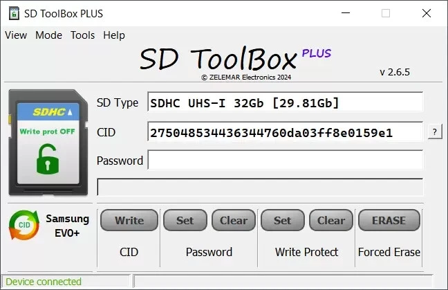 SD Card ToolBox PLUS. Read CID/CSD, Set/Remove Password and Write protection. The next-generation SD card management device, now powered by a high-performance ARM® Cortex®-M4F microcontroller (MCU), and featuring a USB-C connector, retains all the powerful functions of its predecessor while adding enhanced performance and future-ready upgradeability. Enjoy comprehensive SD card management, including CID and CSD reading and decoding, locking and unlocking with a password, setting and removing write protection, and securely erasing data, all with support for future feature upgrades. KEY FEATURES: Compatibility: Supports SD, SDHC, and SDXC card formats. Card Information Management: Read SD card type and size. Detect CID changeable cards Read and decode CID (Card Identification) register. Samsung EVO CID change Write CID to supported cards * CID decoder without the physical SD card present. Read and decode CSD (Card-Specific Data) register. Enhanced Security Control: Lock and unlock cards using a password Set and remove temporary write protection Advanced Partition Management: Hide FAT32/exFAT partitions to enhance data privacy and protection. Comprehensive Data Erasure: Erase cards completely and remove all protections, restoring them to a factory state (except permanent write protection) Specialized Navigation System Support: Unlock and lock fixed-password SD cards used in various automotive navigation systems, including: Mitsubishi/Peugeot/Citroen MMCS Mitsubishi NR-MZxx Toyota/Lexus/Nissan Mazda Denso Online SD Card Password Calculation: Provides an online tool for calculating SD card passwords for VW, Škoda, and Seat RNS315 navigation systems from the CID number. This device ensures all the functionalities of the previous SD Card Toolbox while adding the power and flexibility of an ARM-based MCU, enabling faster operations and easy future upgrades. More information on zelemar.eu website *Please note that the CID change option is not included in the base price, pai d Premium Access is r equired. Hardware specifications: Software Compatibility: Supports Windows 7, 8, 10, and 11. Connectivity: USB-C connector for fast and reliable connections. Card Slots: Two independent slots—one for microSD and one for standard SD cards, with simultaneous operation capability*. LED Indicator: Provides visual status updates and device activity. Case Material: Durable 3D-printed plastic case. Dimensions: 48mm x 41mm x 11mm. Weight: 20g PACKAGE CONTENTS: ‘SD Card ToolBox PLUS’ adapter USB cable SHIPPING: Priority Air Mail with tracking – FREE. Delivery time varies. (5 - 30 business days for most countries) Express Shipping (DHL,UPS, FedEx) - 39.99 USD. Delivery time 2-4 business days (To get exactly delivery time please send me a message with your postal code, city and Country.) Please provide your phone number, it is necessary for DHL/UPS courier. Item is shipped from Lithuania (EU) -No import tax to EU countries. FEEDBACK: Please give me a FIVE star ratings. If for some reason You are unhappy, please contact me first. Please do not give neutral or negative feedback. RETURNS: Returns are accepted within 30 days. Restocking fee of 10% may be applied.