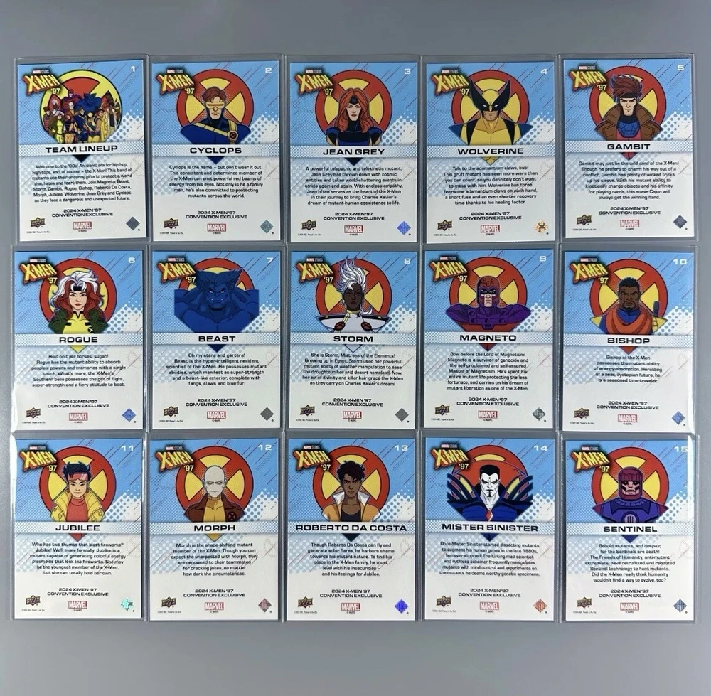 San Diego Comic Con (SDCC) 2024 SOLD OUT EXCLUSIVE. Each card will be shipped in a penny sleeve and top loader. Upper Deck X-MEN ‘97 base set 1-15 trading cards. The cards feature beloved characters such as Magneto, Storm, Cyclops, Wolverine, Gambit, and Beast. No foil card is included in this purchase. Manufactured by Upper Deck and part of a pack configuration.