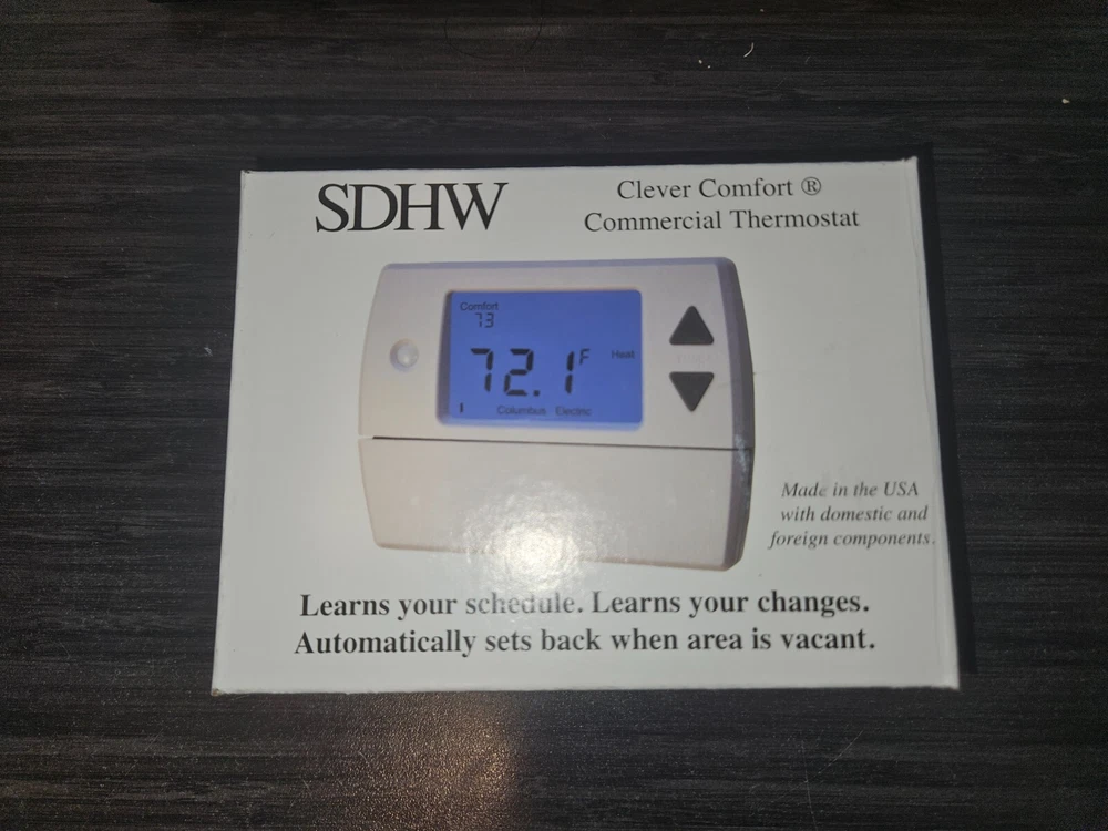 The SDHW Clever Comfort Commercial Thermostat is a non-programmable thermostat designed for controlling heating systems that run on gas, oil, or electric power sources. Featuring a digital control style, this thermostat allows for precise temperature adjustments in commercial settings. It is suitable for businesses looking to efficiently manage their heating systems without the need for programming capabilities. Perfect for maintaining comfortable indoor temperatures in commercial spaces, this thermostat offers a convenient and user-friendly solution for controlling heating systems.