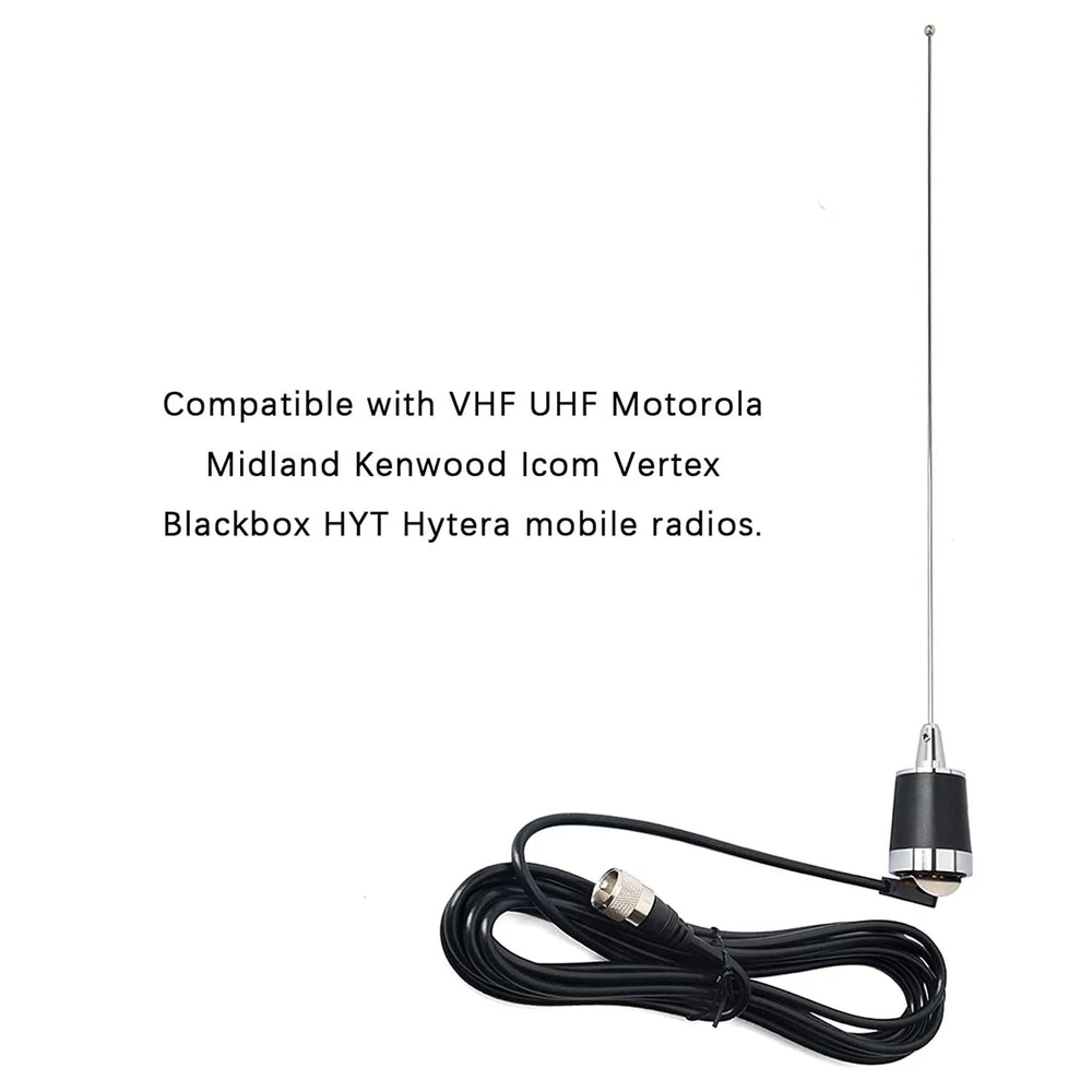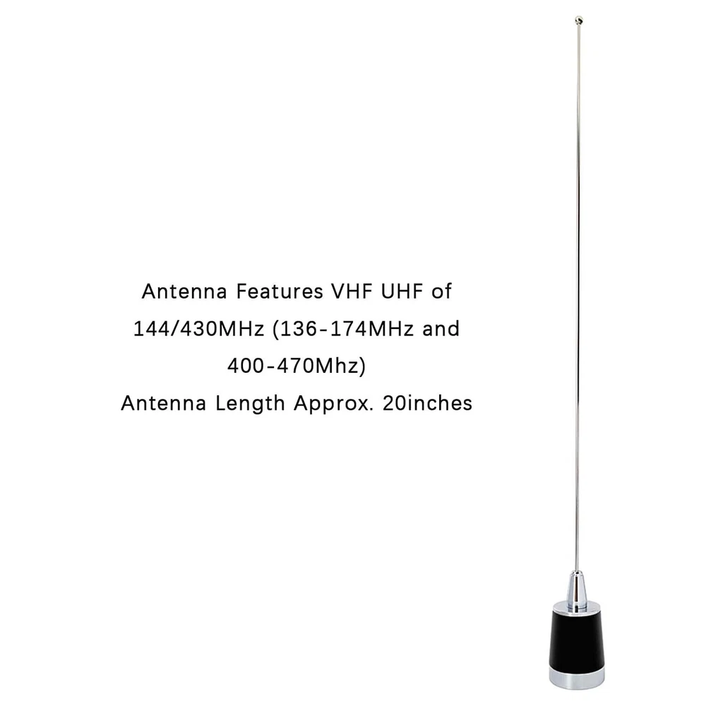 Maswell Dual Band NMO Antenna Compatible with Motorola Midland 2Meter/70cm Transceiver About this item [Mobile Radio Antenna Frequency] The antenna features VHF UHF of 144/430 MHz (136-174MHz and 400-470Mhz) with VSWR:<= 1.5. [Great Specifications] The antenna features great specifications with vertical polarization and gain: 144MHz (3.0dBi), 430MHz(5.0dBi) for better TX and RX. The maximum power input is 100W along with impedance ranging 50Ω and omni radiation. [Premium Material] This 20inch or 51cm tall antenna is composed of stainless steel making it durable and lightweight with a weight of 160g. The NMO mobile transceiver antenna requires no tuning. [Compatibility] The two-way antenna is compatible with VHF UHF Motorola Kenwood Icom Vertex Blackbox HYT Hytera mobile radios. [What You Get] The MASWELL package contains 1*dual band NMO antenna that is professionally tested and 1*small L-type installation tool. Please note that the NMO magnetic base in not included. If you run across any problems or issues, please feel free to contact us. The Maswell antenna features a frequency range of 144/430 MHz (136-174MHz VHF and 400-470Mhz UHF) with VSWR:< 1.5 which is carefully planned and developed to make sure, you receive great transmission over many uses. The Maswell dual band NMO antenna is compatible with VHF UHF Motorola Kenwood Icom Vertex Blackbox HYT Hytera mobile radios. NMO Connector Inner diameter is approximately 1.1 inches, outer diameter is approximately 1.5 inches. Premium Material This antenna is composed of stainless steel making it durable and lightweight with a weight of 160g. Antenna requires no tuning. Easy Installation Easy installation by rotating the two screws of the antenna base with the L-type installation tool. Compatibility The antenna is suitable for mounts or coaxial cables with NMO connector. Electrical Specifications Frequency Range 144/430 MHz Maximum Power Input 100W Gain 144MHz (3.0dBi) 430MHz (5.0dBi) Impedance 50 Ω VSWR <1.5 Polarization Vertical Radiation Omni Lighting Protection Direct Ground Mechanical Specifications Height 20 inches Antenna Connector NMO Weight 160g Radiating Element Material Stainless Steel