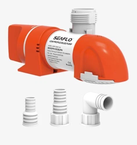 SEAFLO 1100GPH low profile automatic bilge pump designed to fit in narrow and hard to get at bilges. Compact horizontal or vertical mounting, with 360 degree discharge outlet. Supplied complete with 3/4" (19mm), 1" (25mm) and 1 1/8" (29mm) straight hose barb and 3/4"(19mm) 90 degree elbow. Powerful 12V motor with low power consumption for extended life. Easy clean extremely low profile strainer provides maximum water extraction from the bilge. FEATURES: Low narrow design for tight/awkward bilge spaces Easy installation - outlet and pump body 360 degree rotate to suit your installation High performance - Flow up to 1100 US gals per hour Efficient operation - Very low power consumption Low profile strainer - Leaves the bilge almost dry Easy to clean - unique clever strainer design with 360 degree rotation function Non-return valve included - to prevent backflow High or low water sensing automatic mode, pump starts or shut off when water rise and down. CE, RoHS, ISO 8846, ISO8849 standards SPECIFICATIONS: Model: SFBP1-G1100-14A Maximum Flow: 1100GPH Voltage: 12V Current: 4.2A Lift 4.0m/13" Operation Mode: Automatic CONTENT: 1x Pump 1100GPH