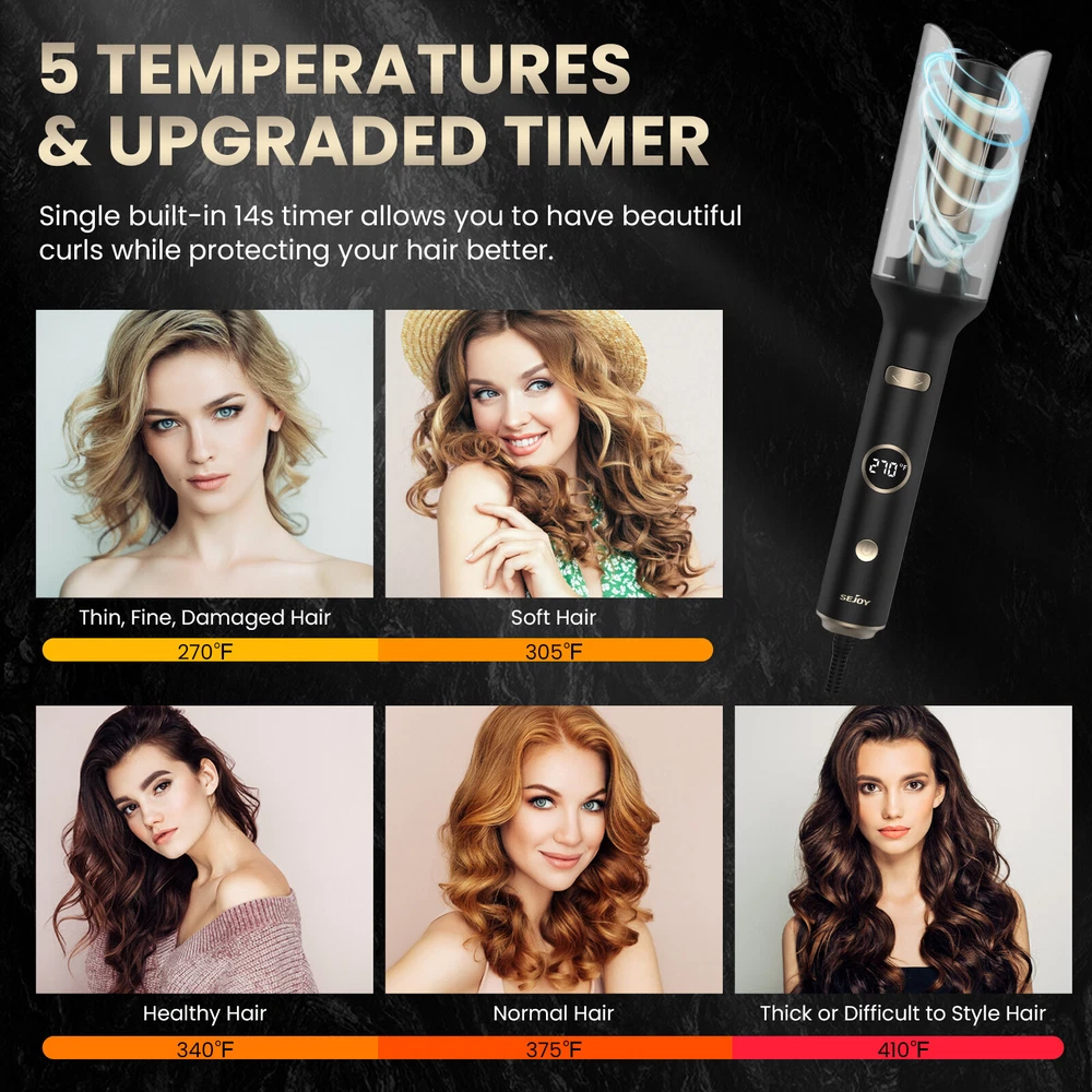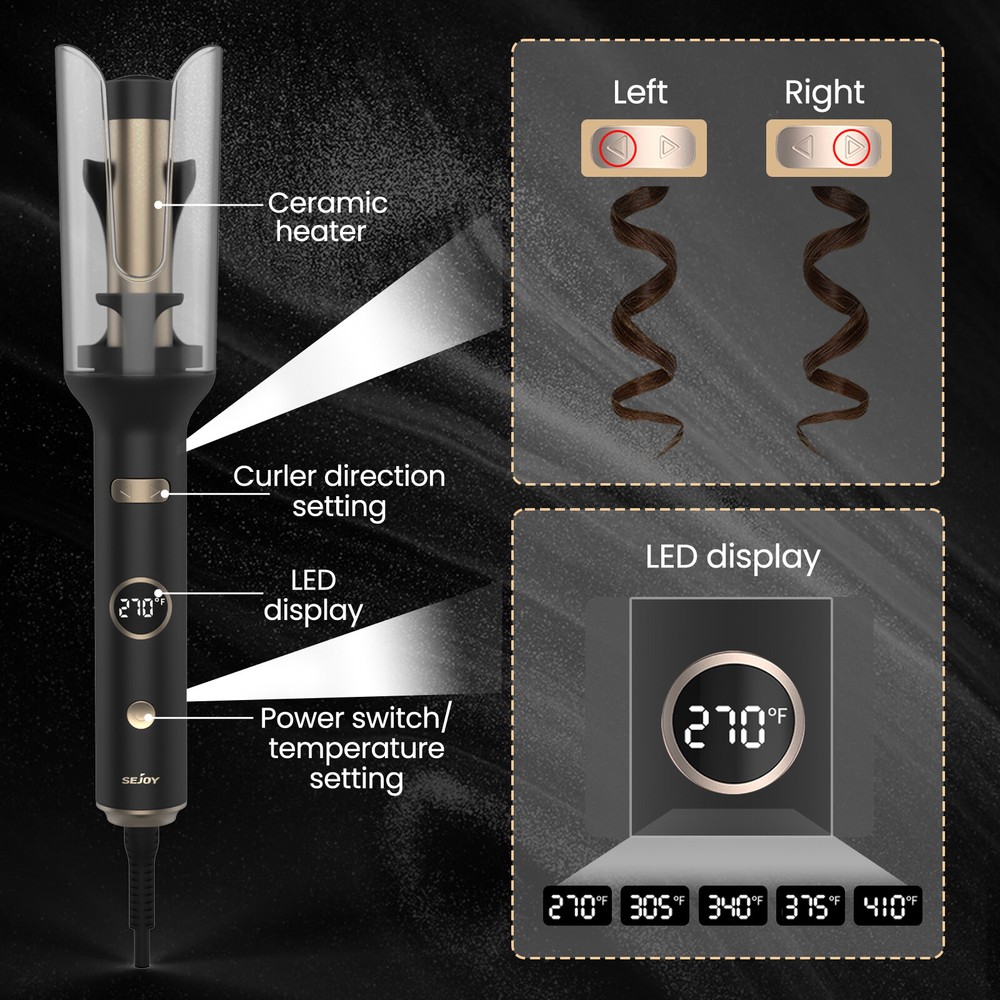 Product Description Automatic curling Simple and easy to operate This curling iron features automatic curling, easy to operate and easy to curl hair. There are left and right directions to choose from, so you can curl your hair differently. Long press and short press control the operation time, you can curl at any length, suitable for anyone to use. There are 5 temperatures to choose from and the LED display shows the selected temperature. Anti-tangle and anti-scald 60 Minutes auto shut-off Automatic beep Left and right styling LED display 5 temperatures Qaulity Products For A Healthy Life SEJOY is a high-tech enterprise specializing in the research, development, production, sales and customer service of home electronic medical products. Since its establishment in 2002, SEJOY has developed and produced electronic thermometers, electronic blood pressure meters and blood glucose meters and other series of products. Focusing on medical health and personal protection field. At present, we have established sales channels in many countries around the world and sold tens of thousands of products, making us one of your best choices. Why SEJOY choosen? Premium Quality Lower Price Faster & Safer 30 Days Free Return Specifications Name: Hair curling Iron Model:CI-202 Rated power: 33w Rated voltage: 110-230V Power cord length: 1.8m Five-speed temperature control: 270℉, 305℉, 340℉, 375℉, 410℉ Department:Women Material:Ceramic Color:Black Package content 1 x Hair curling Iron 2 x hair clip 1 x User Manual Funktionen & Details ANTI-TANGLE AND ANTI-SCALD: This curling iron is ceramic and has a shielded outer layer to prevent burns when curling. When curling hair automatically, take a strand of hair and put it into the curling iron to curl your hair in an organized way without snagging it. 60 MINUTES AUTOMATIC SHUT-OFF : This product has an automatic shut-off function, even if you have curled your hair and forget to turn off the machine, there is no danger because it will turn off the machine by itself. RIGHT AND LEFT CURLING SWITCH: This curling iron comes with left and right switches that allow your hair to curl to the left or to the right. You can get any personalized hairstyle. LED DISPLAY: With LED display, let you always know the temperature used, you can control the temperature according to their own situation. 5 TEMPERATURES : The automatic curling iron has 5 temperatures to choose from, suitable for beginners to learn how to curl hair, you can choose any one of them, suitable for all lengths. We can be contacted at any time through eBay messages if you have any questions, comments or product requests. We will respond to you within 24 hours and do our best to help you out! We encourage our customers to contact us with any questions or concerns! We'd like to be sure you are completely satisfied with your purchase. This item comes with 12 months Manufacturer's Warranty from the date of customers purchased it. Special circumstances will be listed clearly in the listing. If your item has been damaged in transit or become faulty in warranty period, please email us with pictures or video to show the problem. Please do check everything carefully after you received the parcel, any the damage except DOA (Dead-On-Arrival) would not be covered if it's your fault. Replacement products are provided with the same warranty as the returned products.