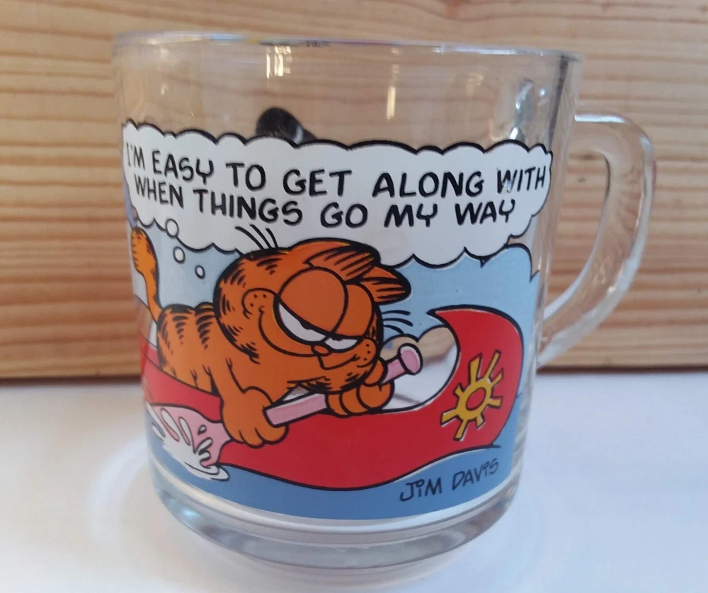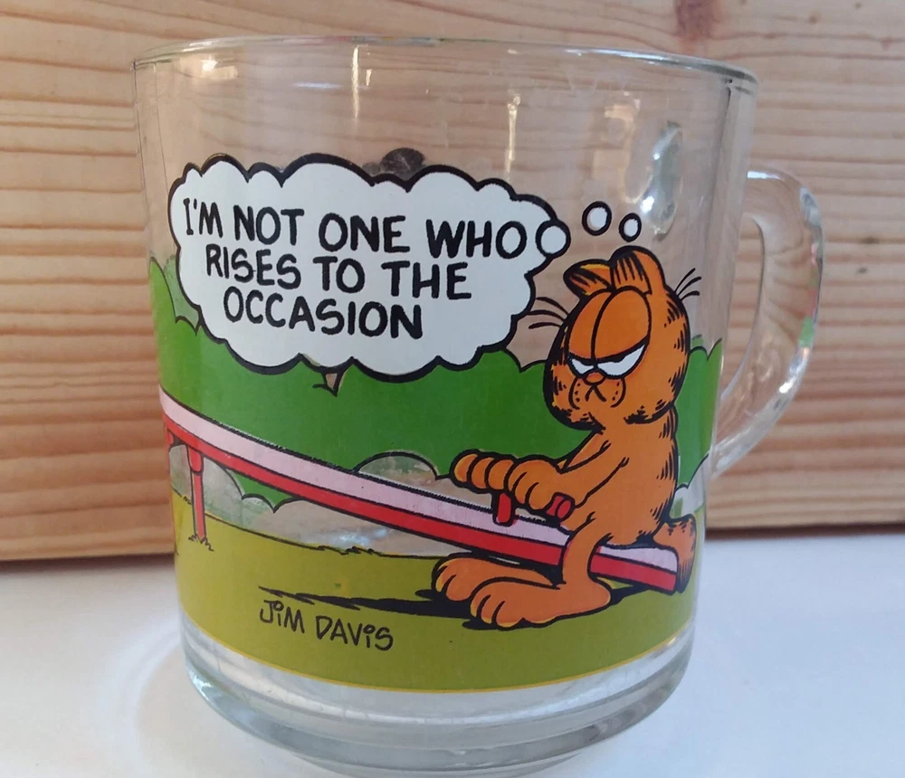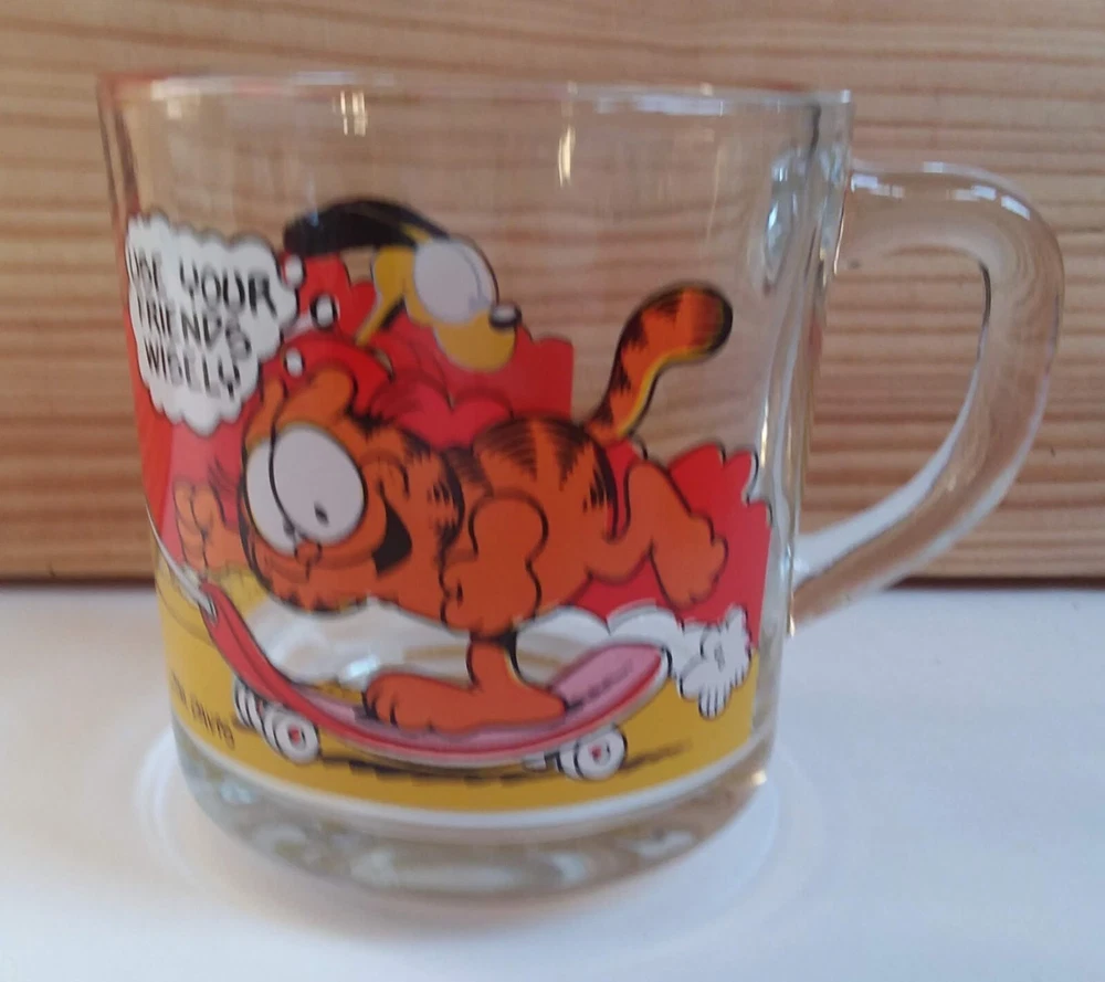 SELECT any/all 1980's McDonald's GARFIELD Characters Glass Cups Mugs Jim Davis listed: Garfield & Odie in Canoe, Odie pulling Garfield on Skateboard and/or Garfield & Odie on playground teeter totter. excellent graphics look unused like new. Discount price for multiple purchase