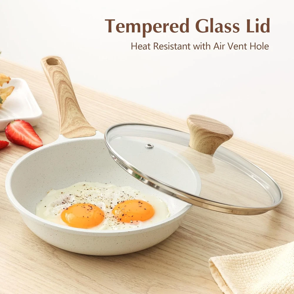 SENSARTE Nonstick Ceramic Frying Pan with Lid 8 Inch, White Product Details Brand: SENSARTE Material: Aluminium Special Feature: Electric Stovetop Compatible, Ergonomic Handle, Includes Lid, Induction Stovetop Compatible, Non Stick Color: White Ceramic Capacity: 1.5 Quarts Compatible Devices: Smooth Surface Induction Product Care Instructions: Hand Wash Only Handle Material: Plastic Item Weight: 2 Pounds Is Oven Safe: Yes Has Nonstick Coating: Yes Is Dishwasher Safe: Yes Recommended Uses For Product: Versatile cooking Specific Uses For Product: Sautéing, frying, searing, griddling Shape: Disc Product Dimensions: 14.9 x 8.2 x 2.7 inches Item Weight: 2 pounds Manufacturer: SENSARTE Item model number: SA7 Special Feature: Electric Stovetop Compatible, Ergonomic Handle, Includes Lid, Induction Stovetop Compatible, Non Stick Electric Stovetop Compatible, Ergonomic Handle, Includes Lid, Induction Stovetop Compatible, Non StickElectric Stovetop Compatible, Ergonomic Handle, Includes Lid, Induction Stovetop Compatible, Non Stick See more HEALTHY CERAMIC SKILLET - Made of natural ceramic coating, free of intentionally added PFOA, PTFE, PFAS, lead and cadmium, safe and healthy. No toxic substances will be produced even overheated. No coating to come off into your food. SUPER NONSTICK - The surface of this ceramic frying pan is smooth and super nonstick, pancakes just slide right off the pan effortless, which makes cooking easier and the food much more flavorful with less oil! INDUCTION COMPATIBLE - The nonstick frying pan with lid is made of heavy-duty cast aluminum to prevent it from warping and wobbling. Its induction base is suitable for all stovetops, including induction cooktop, and it heats fast and evenly. HEAT RESISTANT HANDLE AND TEMPERED GLASS LID - The bakelite handle of the small skillet with lid features woodgrain design, and it is comfortable to grip and stays cool while cooking. The tempered glass lid can prevent the oil from splashing onto your stovetop. EASE OF CLEANING - Its slippery, nonstick surface and no rivets design make the of the ceramic non toxic frying pan skillet with lid easy to clean in seconds with a towel, soap and warm water. Dishwasher safe, but recommend hand washing to extend its lifespan.