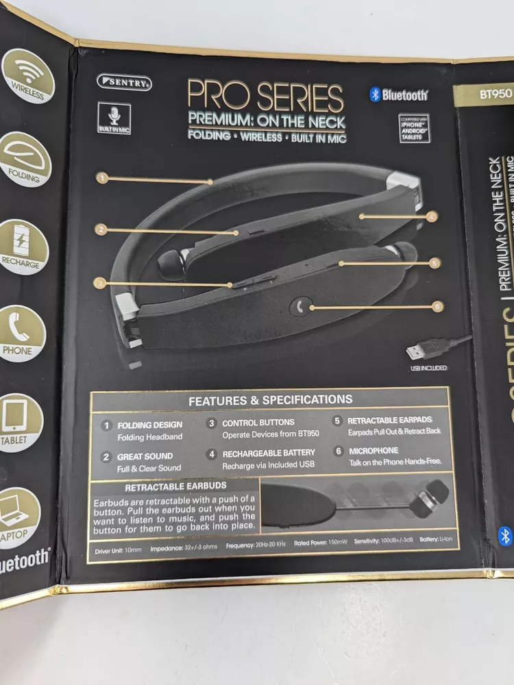 gtin13:080068549505Suitable For:ListeningBrand:SentryFeatures:Built-in Microphone, Foldable, WirelessMicrophone Type:Built-InConnectivity:BluetoothColor:BlackUPC:080068549505Number of Earpieces:DoubleForm Factor:NeckbandWireless Technology:BluetoothMPN:BT950Year Manufactured:2010sModel:BT950Type:Earbud (In Ear)Country/Region of Manufacture:China