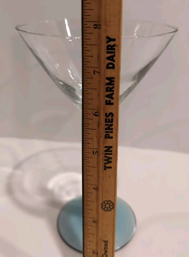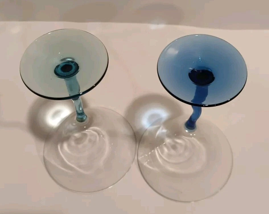 These whimsical stemmed martini glasses will add a special flair to your next party. The curved stems (1 light blue and 1 dark blue) have a unique look that will stand out. They stand just under 8 inches tall and are free of chips and scratches.