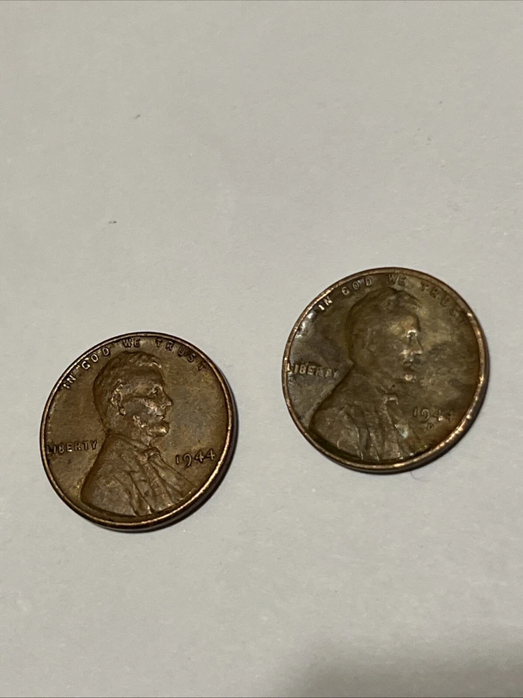 The product is a set of two circulated 1944 Lincoln Wheat Cent pennies, including one from the Philadelphia mint and one from the Denver mint. These copper coins have a composition of 95% copper and are classified as Small Cents. They feature the familiar portrait of President Abraham Lincoln on the obverse and wheat stalks on the reverse. These coins were minted during World War II and are a part of US coinage history. The coins come uncertified and are suitable for collectors interested in vintage American currency.