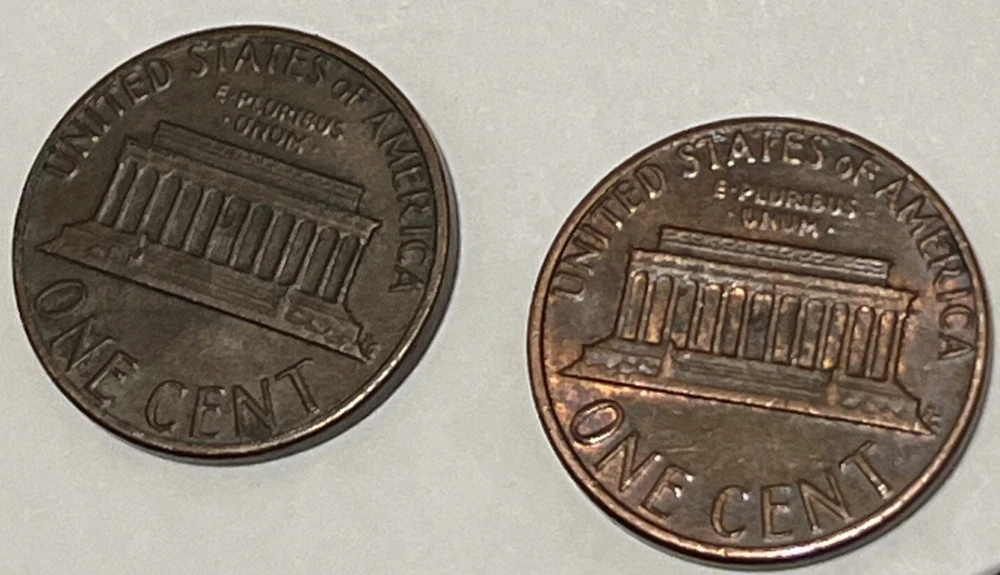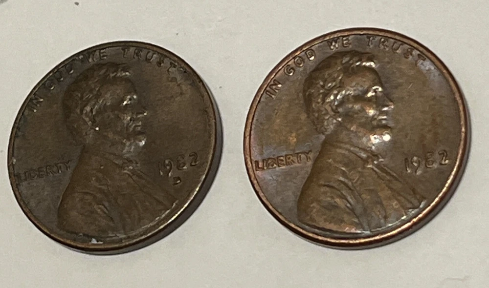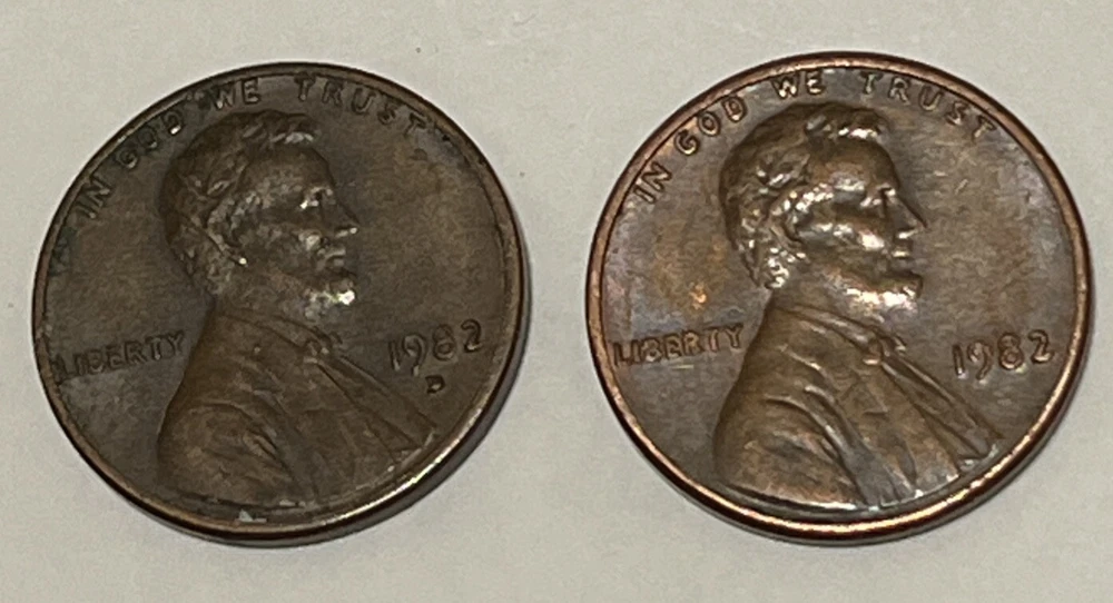 Herder to come by: a set of two rare Lincoln Memorial cents, specifically from the year 1982. These coins are composed of zinc (97.5%) and copper (2.5%) and feature a large date variety. Both coins are of the small cent denomination and are from the United States. They are uncirculated and ungraded, making them a desirable addition to any coin collection. The set includes both the 1982 and 1982D versions of the coin, providing collectors with a unique opportunity to own these sought-after pieces. In 1982 some pennies were made from a majority of zinc, as opposed to the copper heavy coins. Each coin weighs 2.5 grams, due to zinc being lighter.