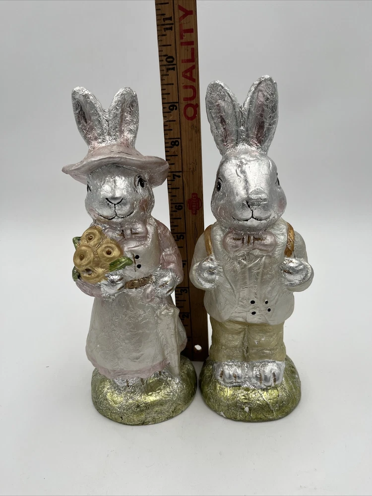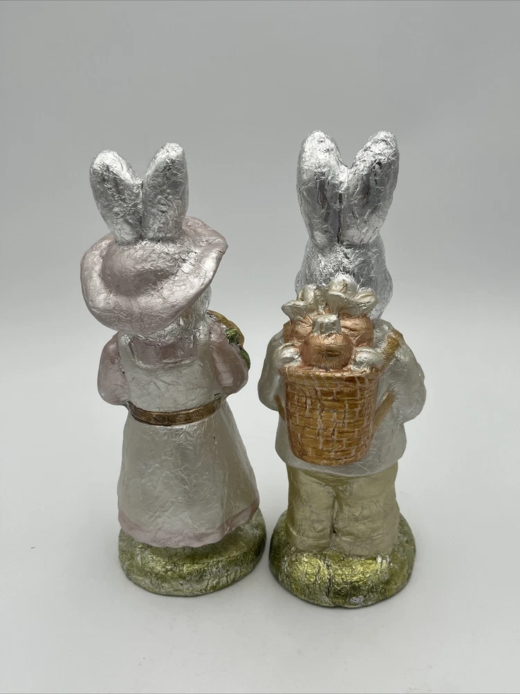 Absolutely Adorable Pair of GANZ Easter Figurines. each measures approximately 9.5" Tall and has a faux finish that makes them look like foil wrapped. light pastel colors are beautiful. Please View all Photos as they are the most important part of any description. My home is smoke free and one minimally shedding Goldendoodle Friendly. Blue the Goldendoodle is not allowed in my office where items are stored. with that said. Most of my items are sourced second hand. I always take care to make sure I buy things in good to excellent condition and dont notice any odors or stains. HOWEVER since these items are not from my personal home or collection I cannot guarantee habbits of previous owners nor what kind of pets they may or may not have had.
