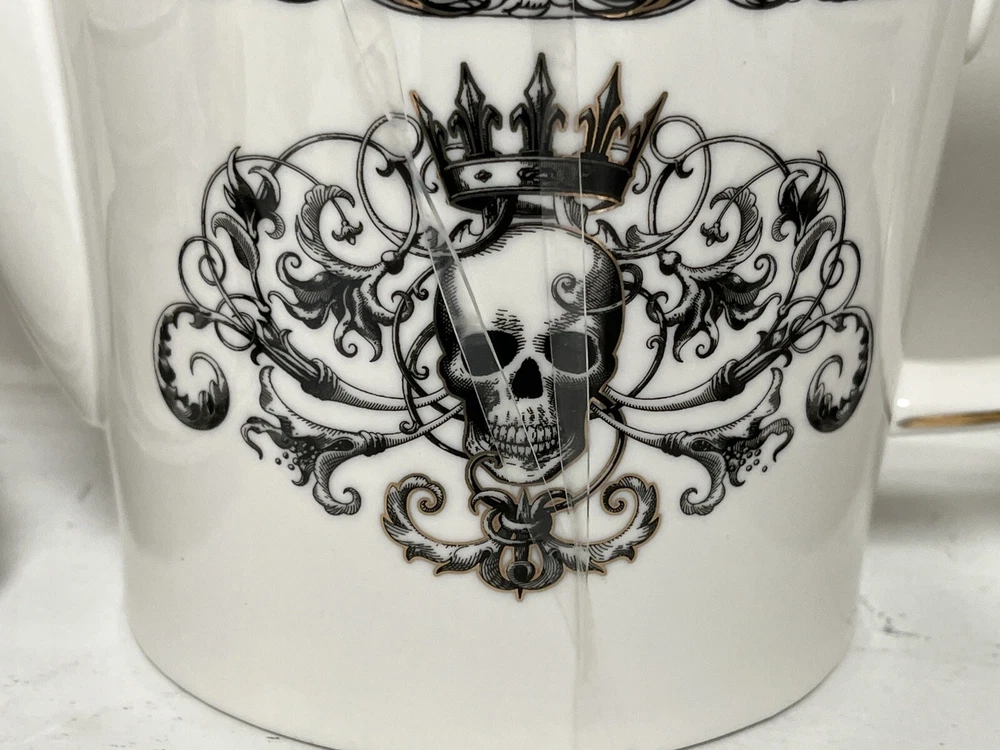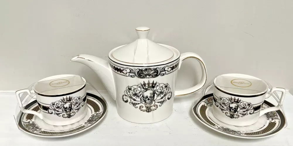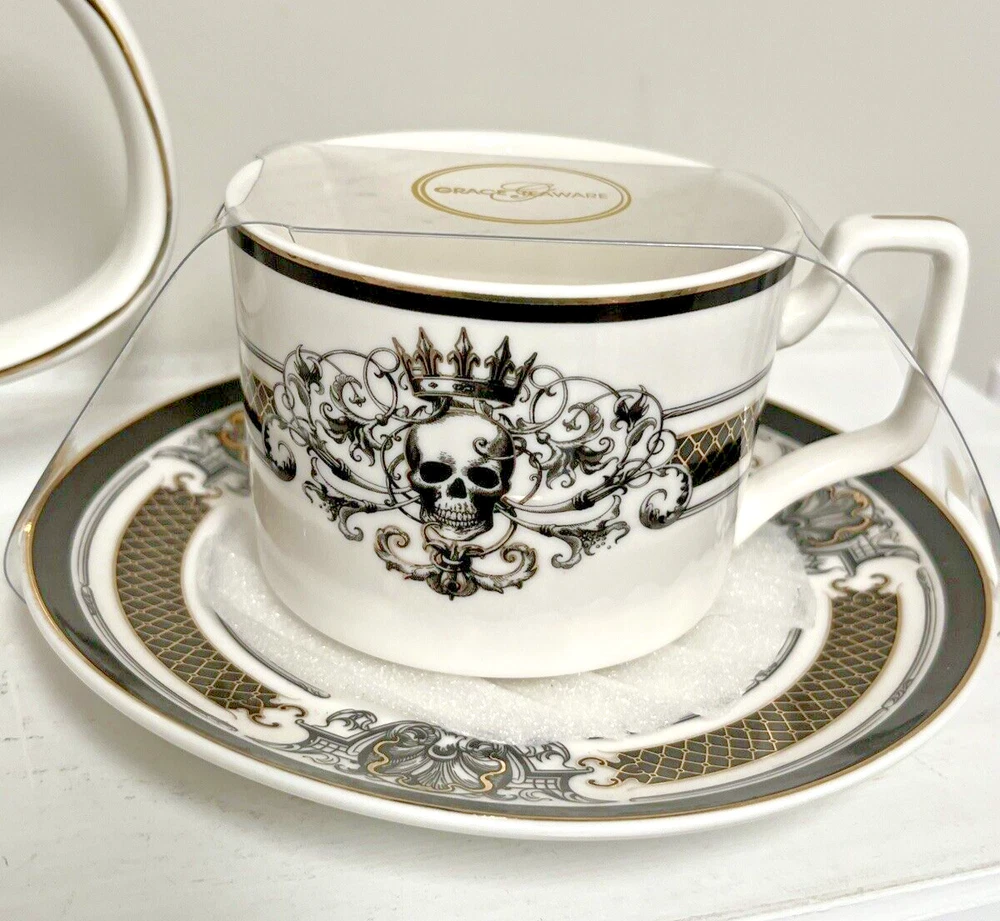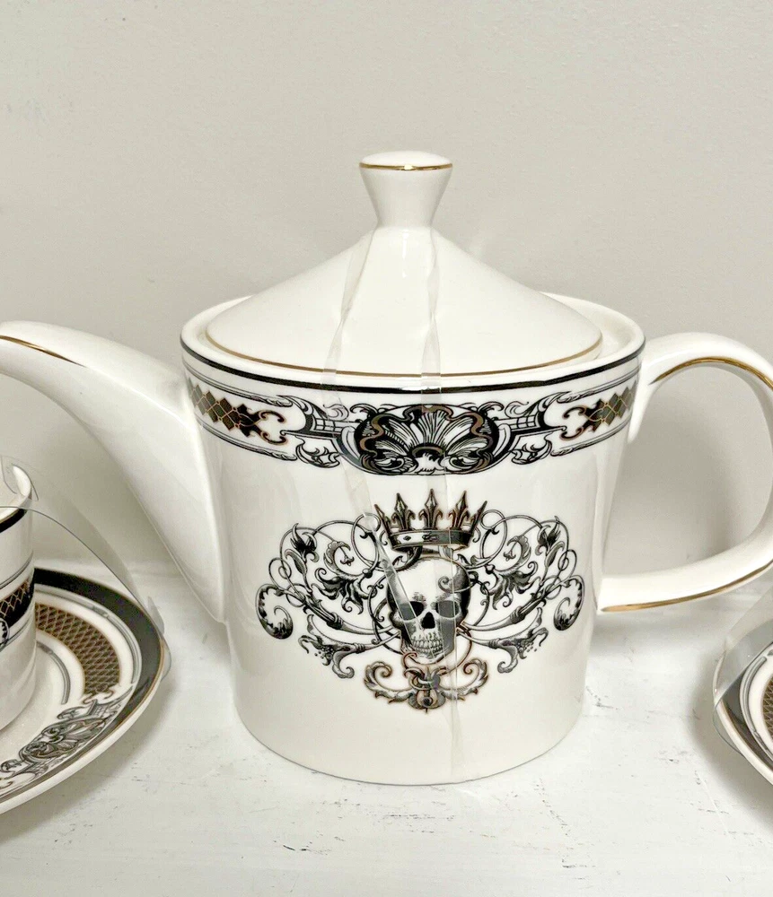 This Grace Teaware custom bundle includes a teapot with lid, two matching teacups, and saucers. The set features a Gothic style with a skull pattern and gold accents. The teapot stands at approximately 6.5 inches tall and has one compartment. The set is perfect for Halloween or any multipurpose occasion. The porcelain material and glossy finish make this set a great addition to any collection. The set is hand wash only and comes unboxed. The Grace Teaware brand is original and not a licensed reproduction. This tea set is a must-have for any Gothic themed collector or tea lover. Be sure to look at my other listings for more pieces that match this Halloween pattern.