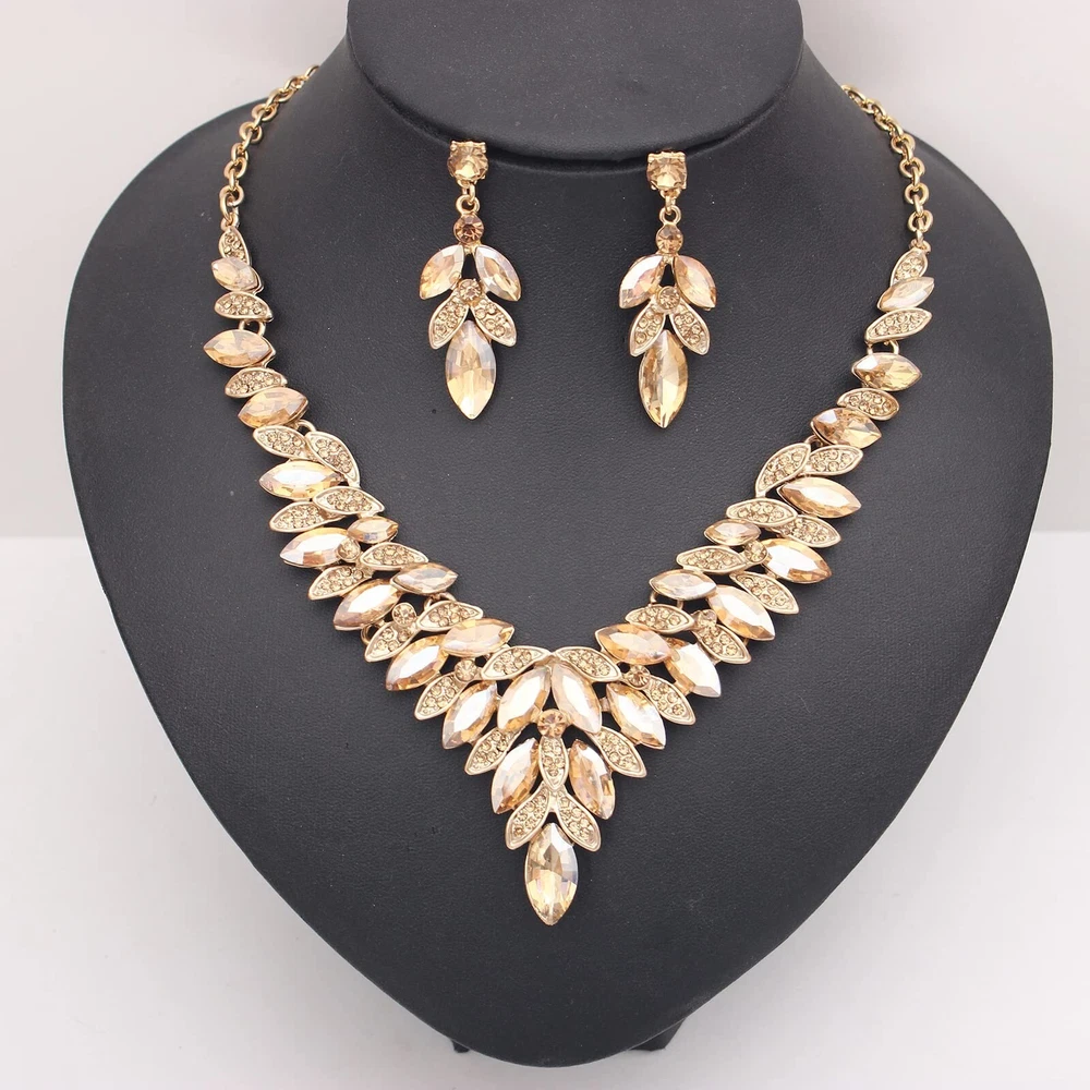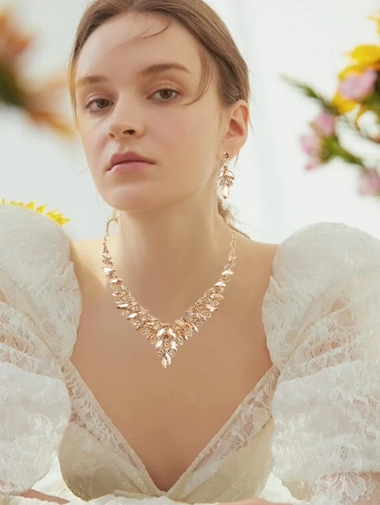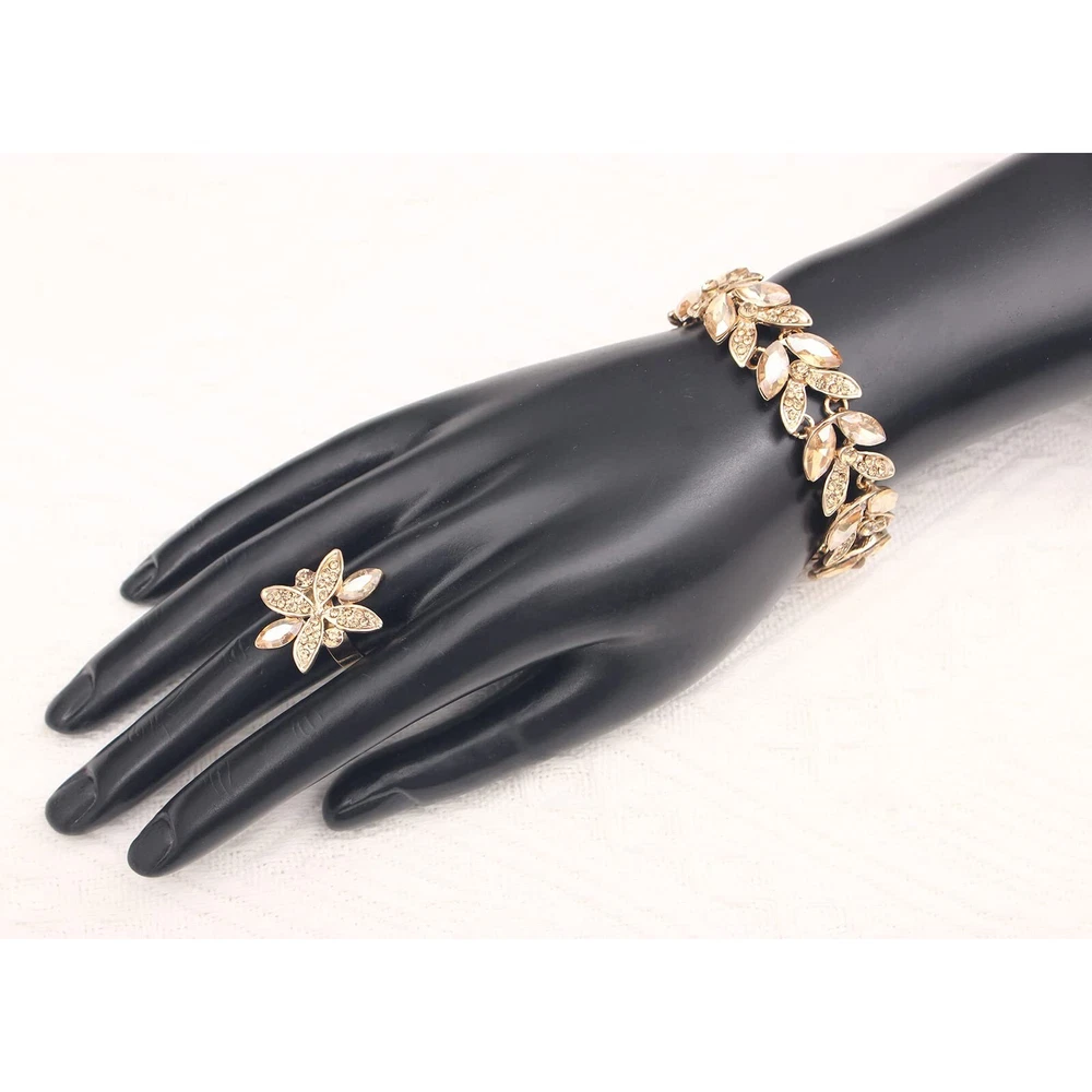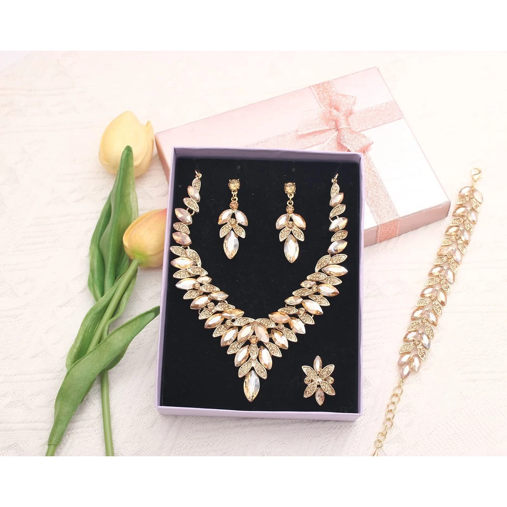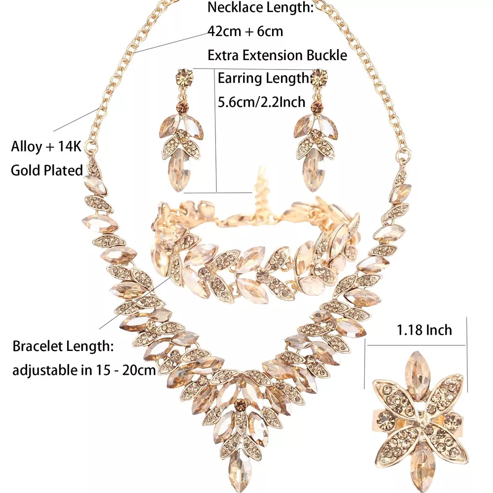 SFE Jewelry set for Women Rhinestone Austrian Crystal Statement Necklace Dangle Earrings Link Bracelet Ring Wedding Party Jewelry Set for Bridal Bridesmaid Product Details Color: Champagne-Gold Plated Brand: SFE MPN: Does not apply UPC: Does not apply EAN: Does not apply Department : womens Date First Available : April 26, 2022 Brand, Seller, or Collection Name: SFE Metal: gold plated Material: Metal Gem Type: Crystal Clasp: Lobster Clasp Ring size: 1.2 Number of stones: 30 SFE Brands: This Jewelry Sets could be Birthday Gifts, Anniversary Gifts, Christmas Gifts, Graduation Gifts,Valentine's Day Gifts,Bridal Wedding,Bridesmaid,Party,Birthday, Prom,etc. Never outmoded design, elegant and stylish, you will never regret for this choice. The earrings skin test grants allergy free, nickel-free and lead-free, wear it rest assured. About SFE Brands: We have a strong design team, we will launch different styles every season, follow us! We will give you a different surprise. Tips: 1.Wipe your earrings up with wipes: they perform miracles on jewelry. Avoid contact with water, no baths, pools, sea water, etc. If it gets wet that can leave dark water spots which are difficult to remove 2.Then wipe with a clean dry soft cotton cloth to bring back the shine. Please don't wear it when sleeping. To keep your gorgeous jewelry looking like new, take it off at the end of the day and give it a quick wipe down with a microfiber cloth 3.Put it inside a soft cloth pocket or fabric swath, avoid it from rubbing against other jewelry.