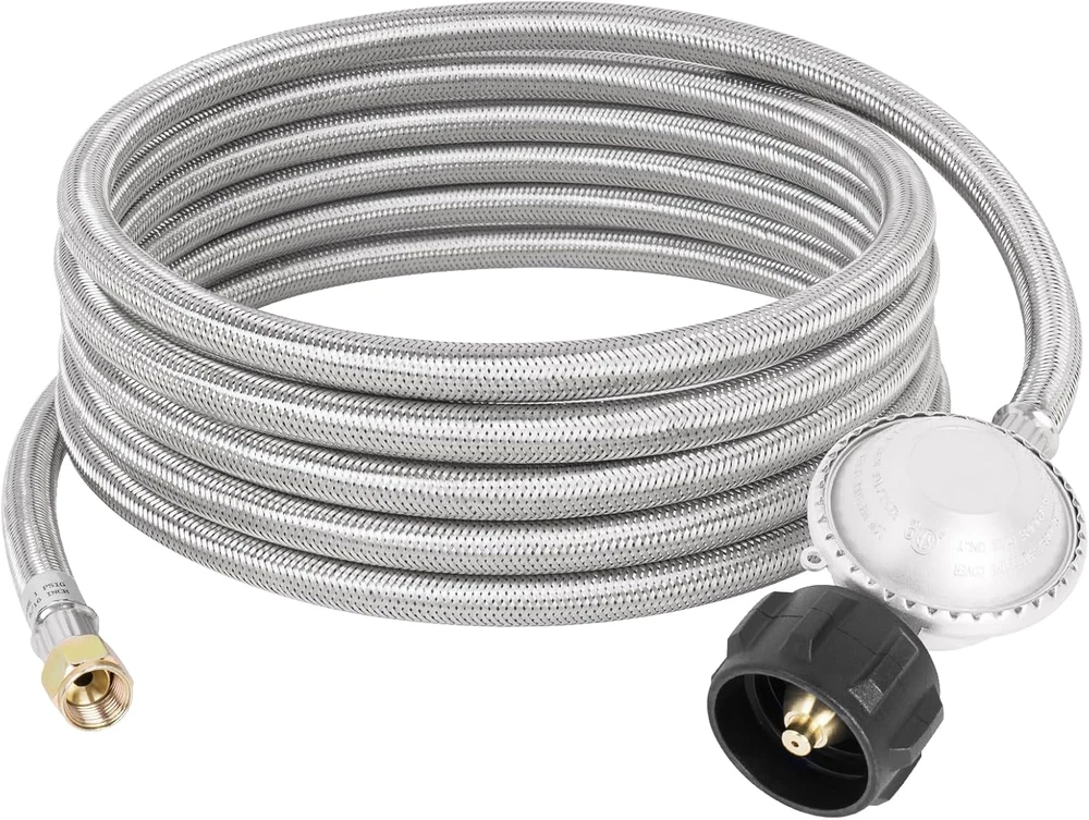 Store New Arrivals Add to Favorite View Feedback Contact SHINESTAR 15 Feet Propane Hose with Regulator for Propane Fire Pit, Patio Heater, Gas Grill, 3/8 Inch Female Flare, Sturdy Stainless Braided Description Maximum Pressure 11 Inches of Mercury Color Silver Brand SHINESTAR Material Stainless Braided Item Weight 1.16 Kilograms Item Length 180 Inches Manufacturer SHINESTAR Product Dimensions 180"L x 0.31"W Size 15ft More Sturdy: Stainless braided hose prevents whatever animals from chewing through your hose Standard Connector: QCC-1 propane cylinder adapter x 3/8″ female flare fitting. 5/16" diameter LP hose Multi-Purpose: Fits for propane grill, camp stove, fire pit, heater, water heater, and more low pressure device Control Gas Flow: The regulator Outlet Pressure is 11"W.C(1/2 PSI). Keeping flow stably and at appropriate levels, your grill will works like new once again Enough Length: Gives you plenty of length, allowing for flexible configurations Product Description Built to Last 4 layers of sturdy materials: PVC, nylon sewing thread, rubber, and braided stainless steel. High Flexibility The hoses can be easily bent into any shape, flexible for outdoor camping or cooking. No Leakage 100% solid brass connectors create tight connection- making it safe to use. Compatible with Outland Living fire pit, Char-broil gas grill, Blackstone 28''/36'' griddle, Camp Chef stove, water heater, etc.. Specifications: Length: 15 Feet Inlet: QCC-1 Outlet: 3/8'' Female Flare Fitting Gas Type: Propane Tips: 1. Please check if the power value of your device is 0-80K Btu/h. 2. If connected to a device with more than 80,000 Btu/h, it will trigger the overcurrent protection, resulting in low airflow or no ventilation. ABOUT US We offer the best prices around on high quality products. Our E-store includes media such as books, movies, music and games while offering electronics, toys, sporting apparel, clothing, tools, general home, garden items and more. SHIPPING We are always working hard to ensure your package arrives as soon as possible. Please understand that some factors like weather, high postal traffic, and the performance of shipping companies are outside of our control. We offer free shipping to the lower 48 states and ship within 2 business days of payment, usually sooner. We do not accept P.O. Boxes. Please provide a physical address. RETURNS We offer a 30-Day Return Policy on items which you are not completely satisfied with. You have the option for a full-refund or an exchange of the item. No returns are available on items shipped outside of the USA. PAYMENT We accept PayPal. CONTACT US This page content is yet to come Please ad us to your favorite seller and visit again later Thank You CUSTOMER SATISFACTION We try our very best to make sure every customer is completely satisfied. If there's a problem, message us! We're happy to help.