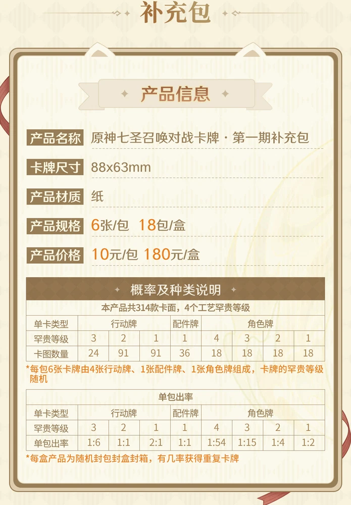 SHININGSOUL GENSHIN IMPACT Official TCG Booster Box Anime Game Card Specifications: Product specifications: 18packs Main material: Paper Features: Exquisite card surface: Exquisite card textures depict details and high-end texture Rounded corner design: The rounded corners around the design are safe and will not scratch your hands Safe and environmentally friendly: using new paper materials, the cards are more delicate Notes: All packages will be sent within 1-5 business days. Delivery times will vary depending on the destination. All tracking numbers can be tracked online. Since the items are placed on the shelves, some items may have some slight wear and tear. If you have any other questions, please feel free to contact us and we will reply as soon as possible.