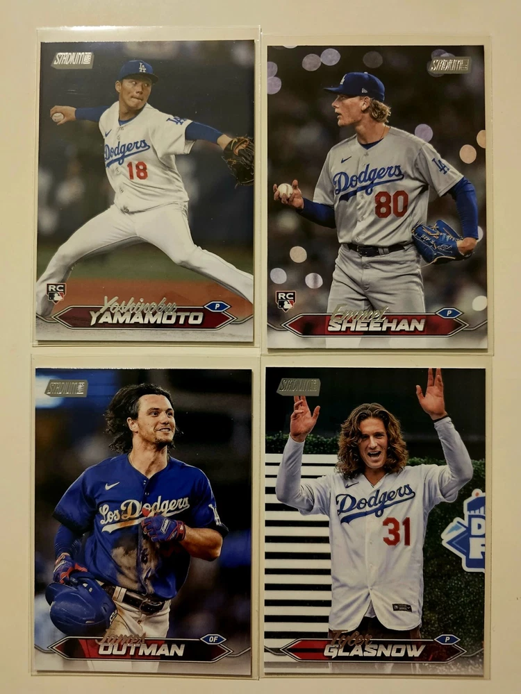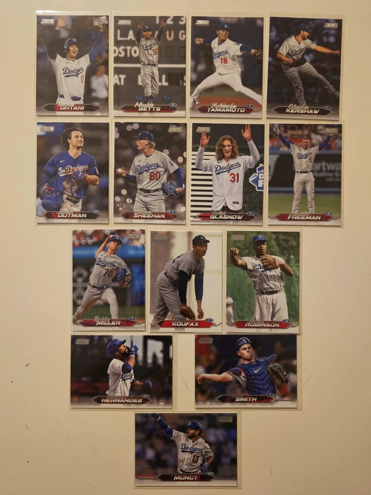 This lot includes 14 cards from the 2024 Topps Stadium Club baseball set featuring players from the Los Angeles Dodgers including Shohei Ohtani, Mookie Betts, Freddie Freeman, and Clayton Kershaw. The cards are made of high-quality card stock and are original, not licensed reprints. The set includes both base cards and rookie cards, making it a great addition to any collection. The cards are in standard size and were manufactured in the United States in 2024. This lot is perfect for any Major League (MLB) baseball fan and is a must-have for collectors.
