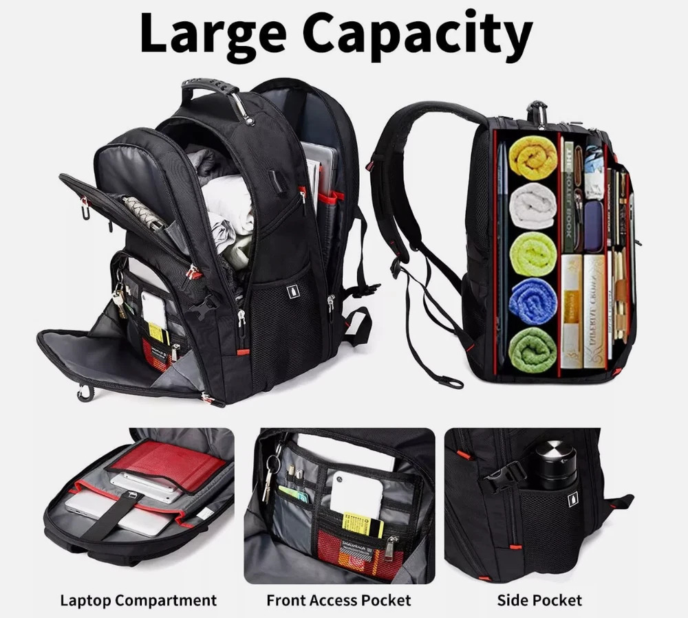 LARGE CAPACITY AND ORGANIZED: men travel backpack owns 20 independent pockets for large storage and organization for small items. 3 spacious main multi compartments with many hidden pockets can accommodate lots of stuffs like college supplies, travel accessories, clothes, stationery, notebook, cord organizer, side deep Zipper pocket for Easy access essentials, side Elastic net pockets conveniently hold travel gear umbrellas or water bottles. EXTRA LARGE and DURABLE MATERIAL: Size of extra large travel laptop backpack: 19.5x15x11 (inches), Capacity: 50L, separate padded laptop compartment hold for 13 inch MacBook, 14, 15, 15. 6 and up to 17inch Laptop backpack/computers for women men . The scan smart laptop backpack made from high quality material with nylon lining for better WATER RESISTANT and heavy duty backpack Large laptop backpack for the City MULTIPURPOSE: unfolds the extra large backpack freely 90-180 degree, exclusive designed for airplane traveling. The big backpack is perfect for indoor/outdoor activities. Served as durable large backpack business work bag, large laptop bag or spacious college backpack, you can use it at anywhere for International travel, camping, hiking and overnight trip PRACTICAL AND CONVENIENT: external USB port with set-in charging cable offers convenient charging your cellphone. A hole for headphone outside gives easy access to Earphone usage. Also, the backpack with a sturdy rugged handle with steel cable on the top for carrying, side compression straps keep the exclusive backpack at whatever size you requires. As a men's/women's backpack, you will enjoy It's fashionable, comfortable and convenient everywhere COMFORTABLES: Tech backpack with back U shaped three dimensional ventilation design, comfortable wide breathable mesh shoulder straps with plentiful sponge pad help relieve the stress from your shoulder. Both sides of the shoulder strap with lanyard design, can hang sunglasses and other small pendants. Premium Book bags for men Also computer backpack for women.This item is not intended for use by people 12 years old and under Product Details: Product Dimensions: 15 x 11 x 19.5 inches Item Weight: 2.8 pounds Department: mens Manufacturer: SHRRADOO Country of Origin: China Item model number: 983035 Is Discontinued By Manufacturer: No Age Range Description: Adult Item Weight: 2.8 Pounds Number Of Items: 1 Capacity Total: 52 Liters