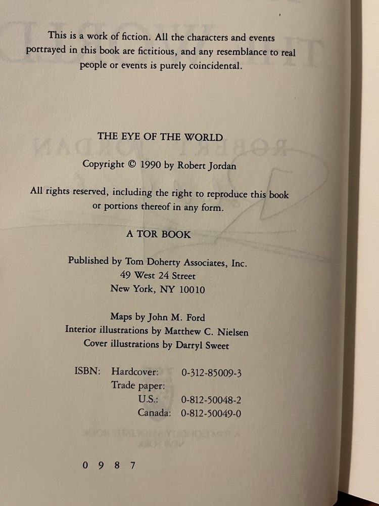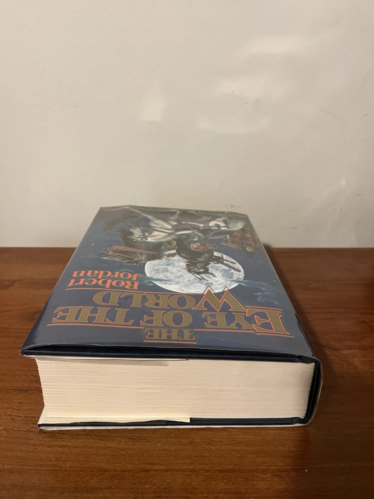 This is the first edition, seventh printing of The Eye of the World, signed on the title page by Robert Jordan. This copy is in very good to near excellent condition. The first two pages and last page have some creasing on it, as seen in the last three pictures. Otherwise, the dust jacket is in excellent condition and the book has strong binding and clean pages. This is a very nice copy.