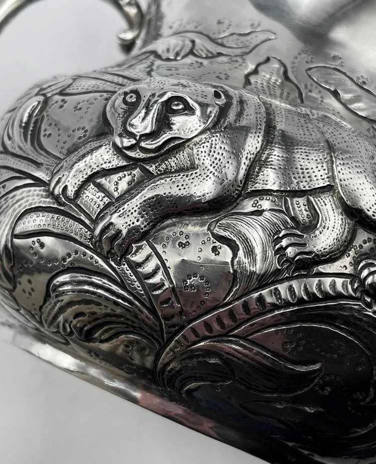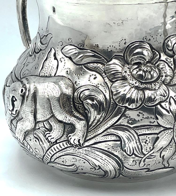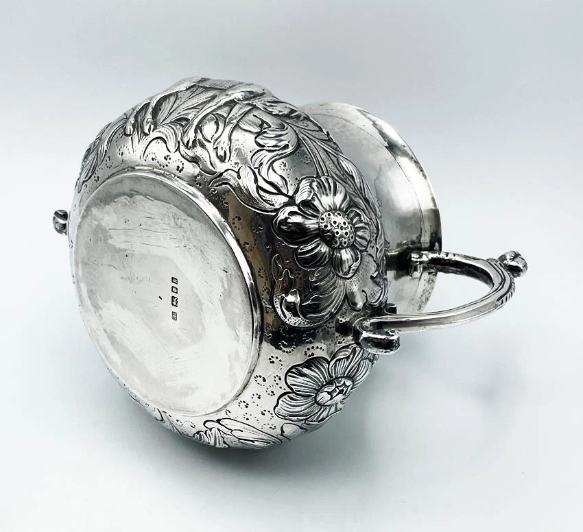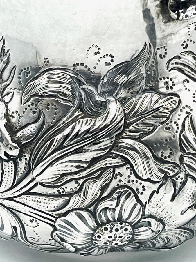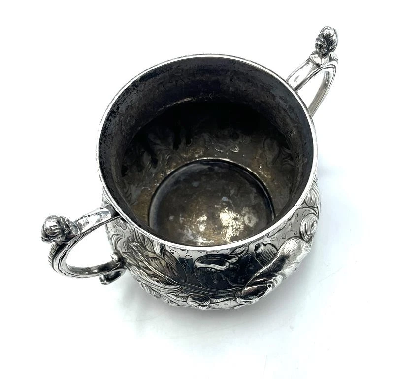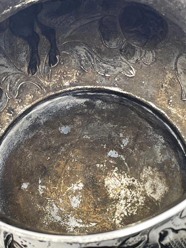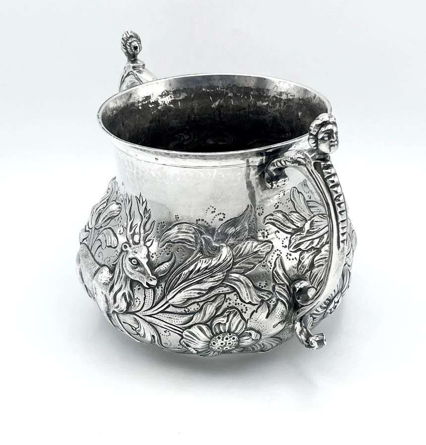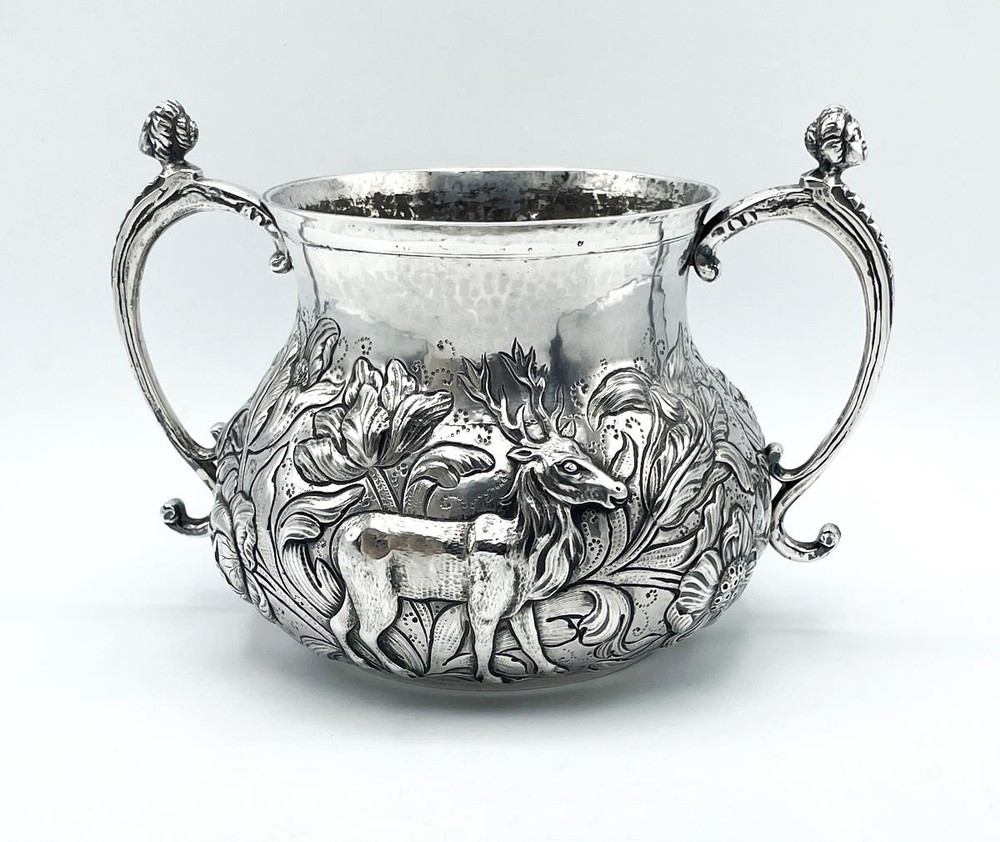 SILVER PORRINGER BOWL 23oz LONDON 1925 CHARLES II STAG & BEAR DESIGN Description SILVER PORRINGER BOWL 23oz LONDON 1925 CHARLES II STAG & BEAR DESIGN Fabulous large scale silver porringer by Pairpoint Brothers, London 1925. A copy of a King Charles II silver original. Bold repousse floral decoration featuring a stag & a bear. Marks: maker mark AP FP AP (Pairpoint Brothers); lion silver mark rubbed; London assay office mark; date letter k for the year 1925. Dimensions: approx 6½ inches dimater. Approximately 9¼ inches across the handles. Weight: approx 23.6 troy oz (734g) The interior is heavily tarnished. A few minor dings & dents but overall lovely condition. Pictures sell! Auctiva offers Free Image Hosting and Editing. 300+ Listing Templates! Auctiva gets you noticed! The complete eBay Selling Solution. Track Page Views With Auctiva's Counter