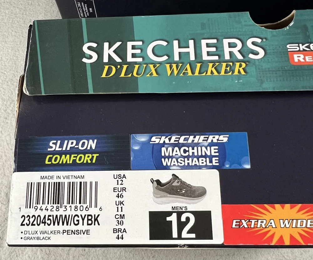 SKECHERS Men's D'Lux Walker Pensive Grey/Black Slip-On Sneakers X-WIDE Sz 12 NIB