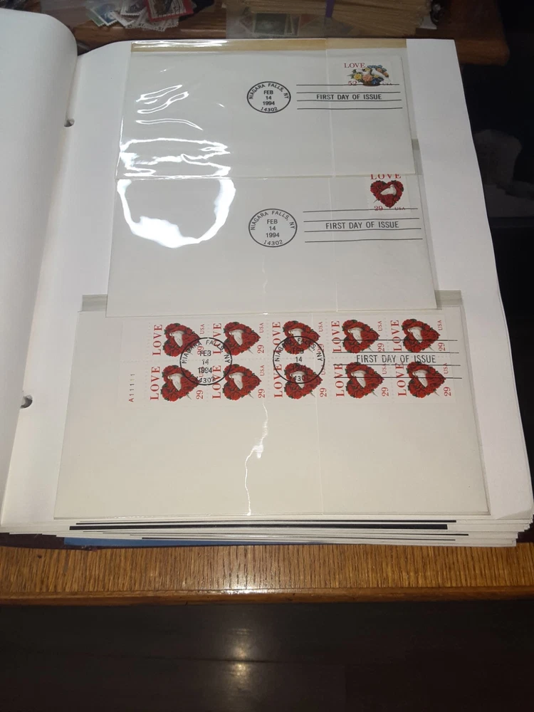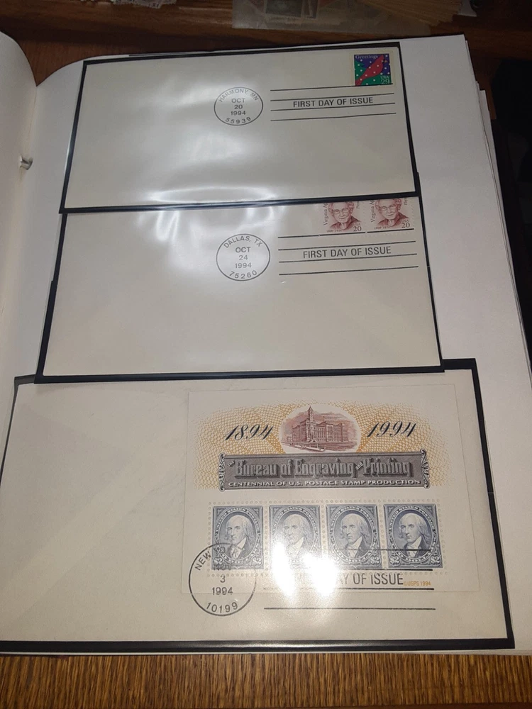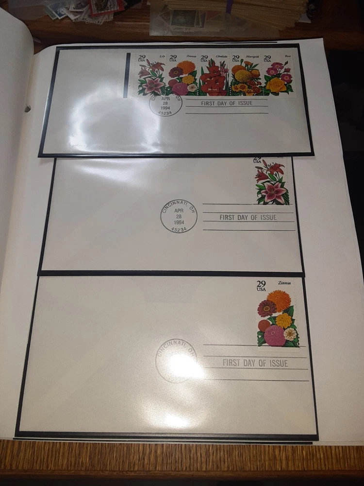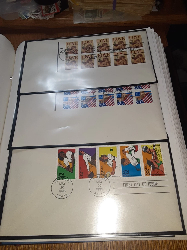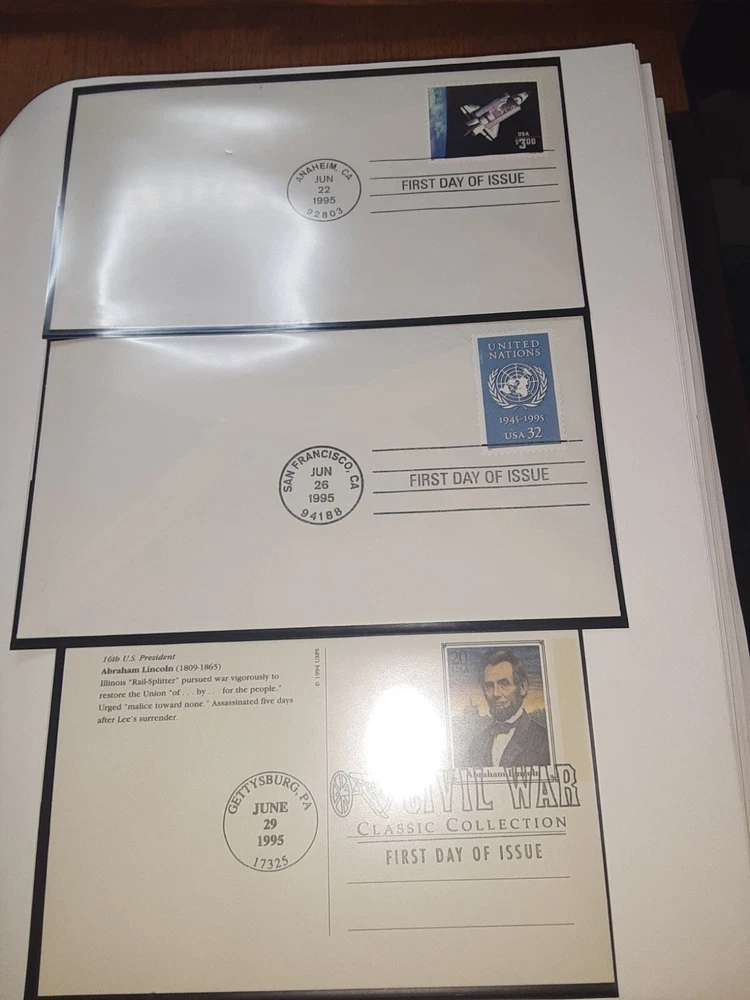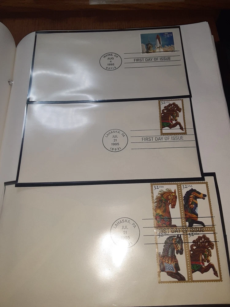 This is an older album that the cover is starting to separate. There are approx..300 covers, maybe a few more or a few less. Counted like 5 times and lost track every time. Covers are in nice shape. There is a 1.00, 5.00, 9.95, 2.00 with 4 stamps, and a 3.00 covers and many multiple stamp covers.