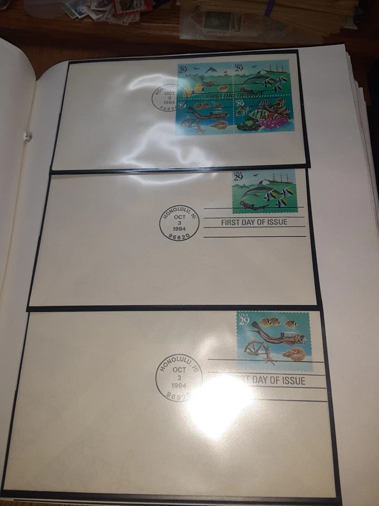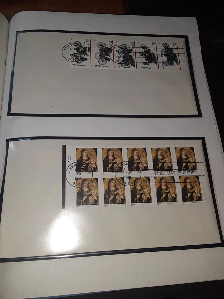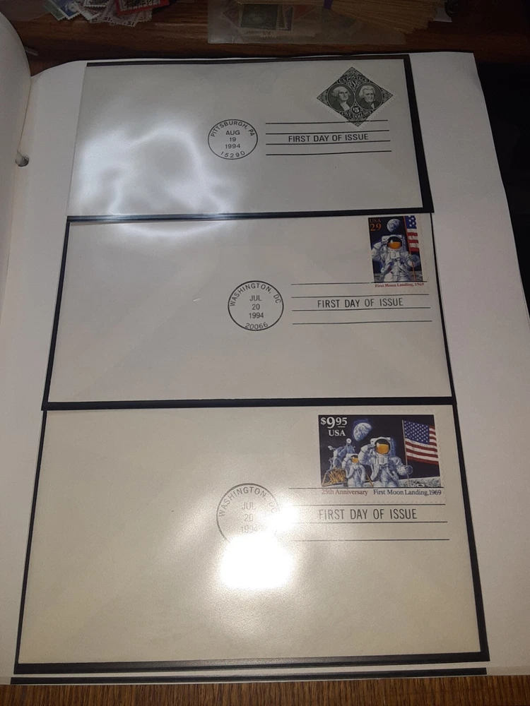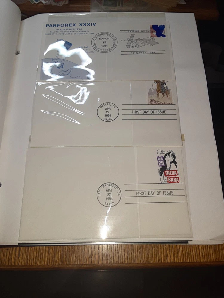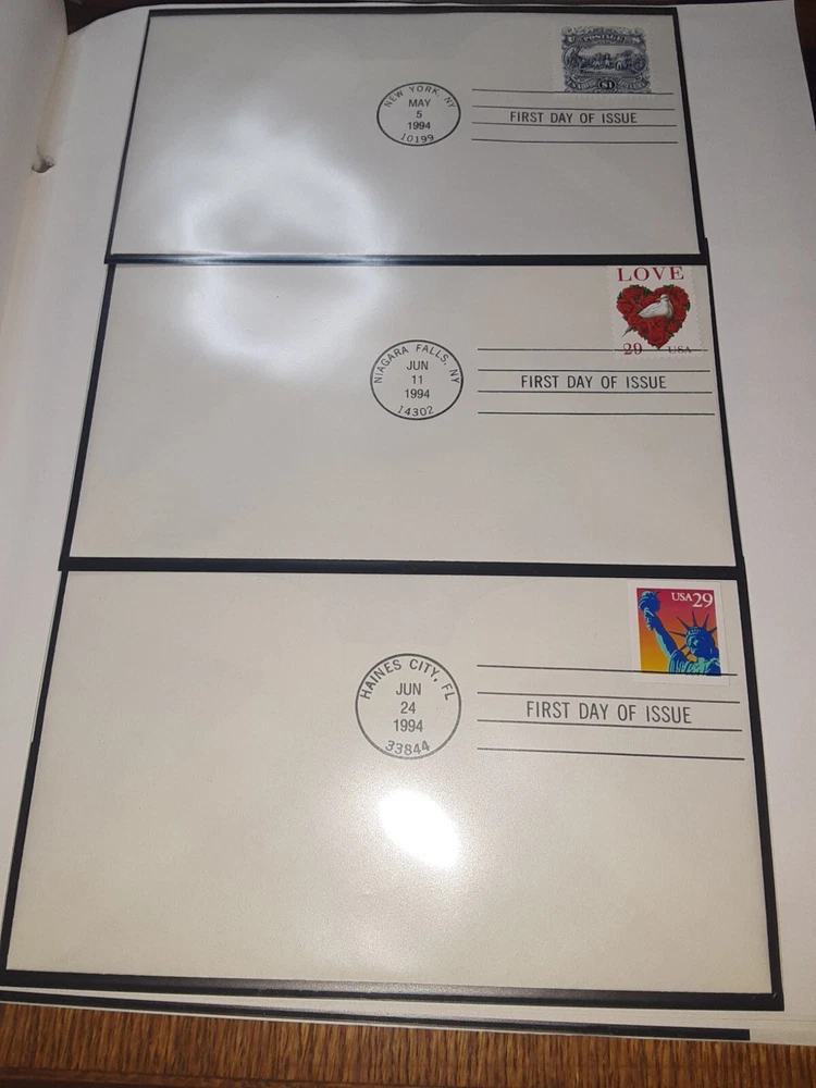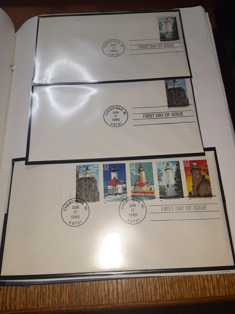 This is an older album that the cover is starting to separate. There are approx..300 covers, maybe a few more or a few less. Counted like 5 times and lost track every time. Covers are in nice shape. There is a 1.00, 5.00, 9.95, 2.00 with 4 stamps, and a 3.00 covers and many multiple stamp covers.