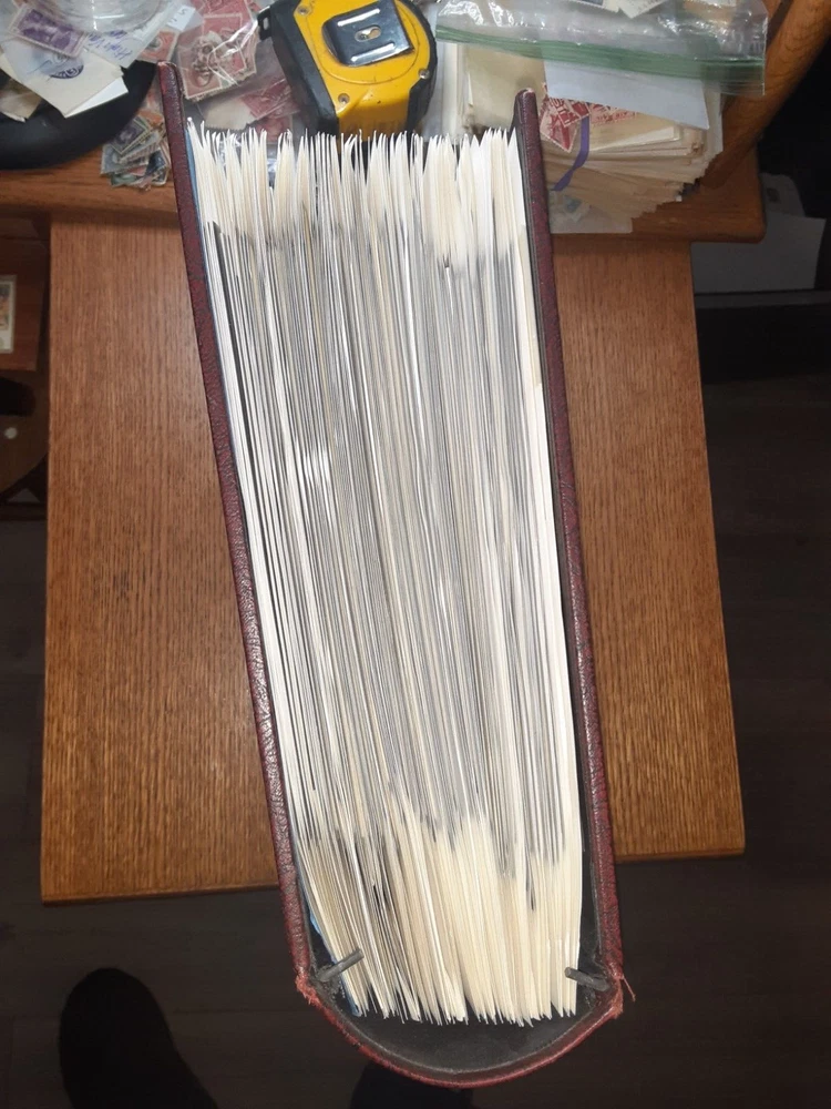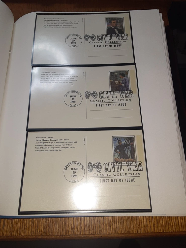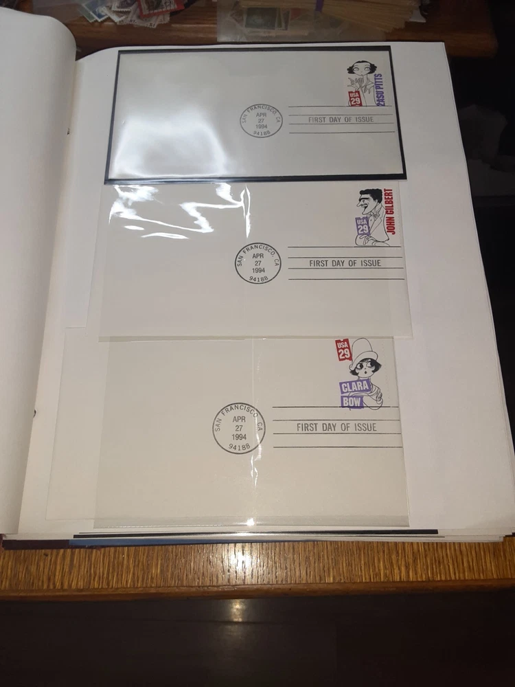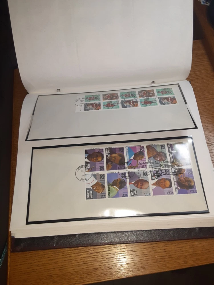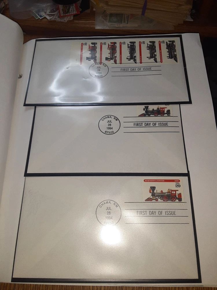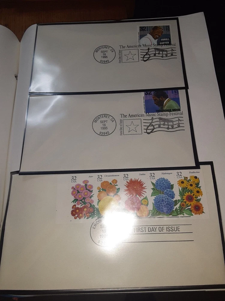 This is an older album that the cover is starting to separate. There are approx..300 covers, maybe a few more or a few less. Counted like 5 times and lost track every time. Covers are in nice shape. There is a 1.00, 5.00, 9.95, 2.00 with 4 stamps, and a 3.00 covers and many multiple stamp covers.