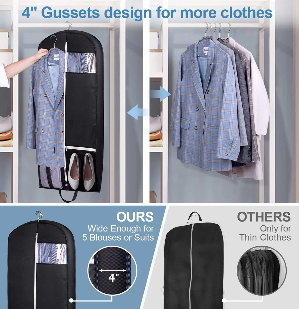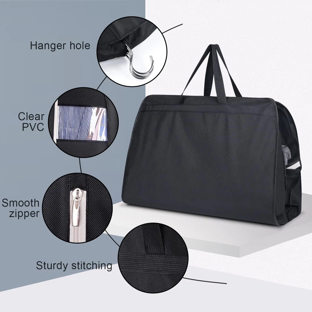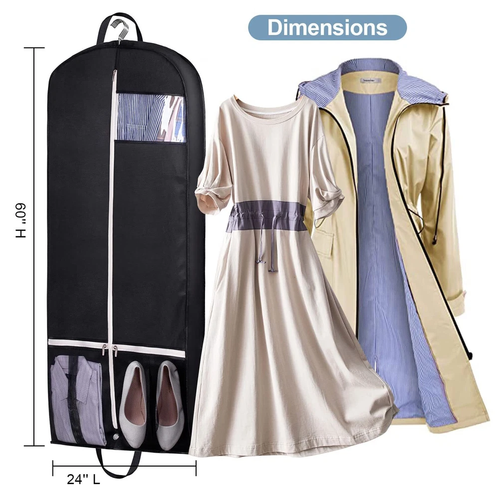 Large Capacity: Dress garment bag comes with 4" gussets, suit for holding 4 men suits or 6 dresses inside there's still room for more, provide more space than others bags and helps keep clothes wrinkle-free. Easy for Travel: Dress cover bag has two handles at both ends, so it can be trifolded and easy to carry without dragging your garments on the ground, suit for travel and bussiness trip. Extra Space: Two mesh pockets provide more space to store shoes, shirts, tie, socks, underwear, hanging clothes bag for travel helps save your time when search the matched accessories. Easy to Access: There is a clear plastic window makes it a breeze to find the clothing you want without having to zip open the garment bags for hanging clothes travel, zipper works smoothly without snags and the small hole at the top of the bag comes in handy. Versatile Usage: Garmet traveler bag measured by 60" x 24" x 4", great size for dress, gown, garment, coat, sweaters, outfit, shirts, jackets, tuxedos and military uniform, not only for travel but suitable for home storage.
