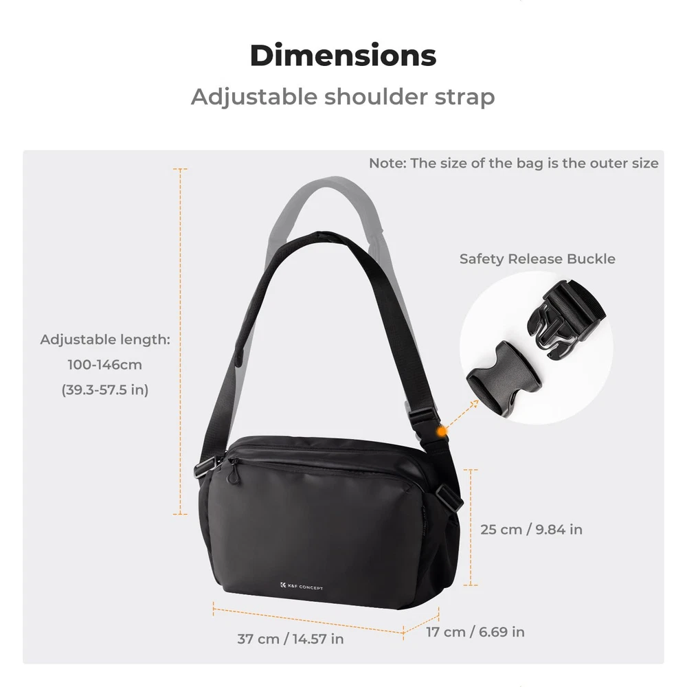 【Upgrade Version & Large Capacity 】Max Capacity:12L. External Size:14.6"*6.7"*9.8"; Internal Size:13"L*4.7"W*9.45"H.The camera sling bag main compartment for 1 DSLR/SLR/Mirrorless and 2-4 exchange lenses. (Note: You will receive a camera bag, the tripod is not included.) 【Removable Individual Dividers】This camera bag Comes with 4 individual removable dividers give brilliantly customizable and protective internal organization while allowing maximal use of the available space. you can adjust the space at will according to your camera equipment. 【Camera Protection】External material are abrasion-resistant thread, Splash-proof. The camera shoulder bag is padded with thickened foam around the bag and lined with soft velvet to protect camera gear from bumps and shocks, effectively protects equipment in all directions. 【Upgrade Multiple Storage Pockets】In addition to the main compartment, the exterior of this camera case features 1 front zipper pocket with built-in batteries Insert Pouch, Filter Insert Pouch, mesh pocket to organize batteries, filter,and other accessories. 2 side pockets for carrying an umbrella or small water bottle. 1 back small zipper pocket for organizing powerbank, phone, etc.1 back large zipper pocket for up to 13" ipad. 【User-friendly Design】The SLR/DSLR Camera bag Soft Padded shoulder strap varied from 39.3 to maximum 57.4 inch can be adjusted personal preference. Bottom external carry straps allow camera tripods to be attached to the underside of the bag. 【Simple and Stylish】It can be a camera bag for photographers, or as an everyday shoulder bag or fanny pack when the dividers is removed.An ideal gifts for friends,family. Any problem, contact for help.