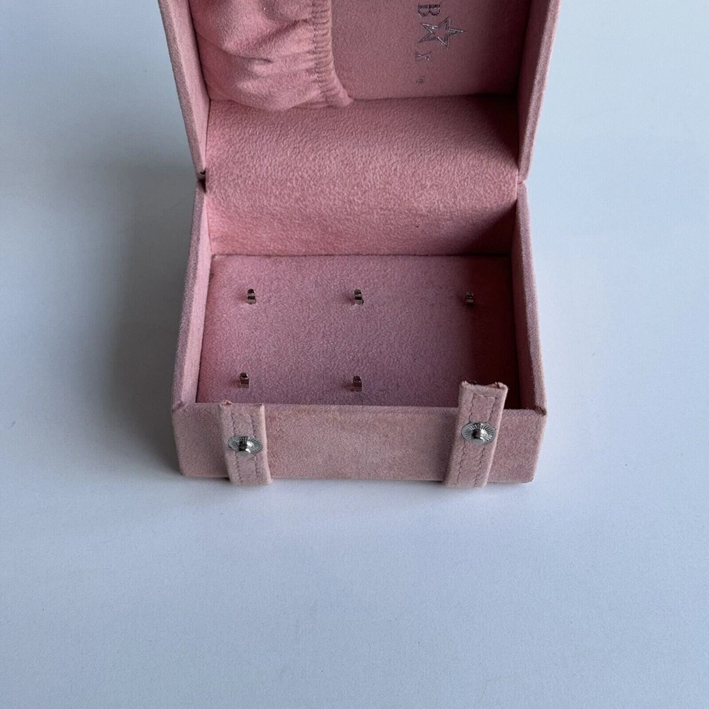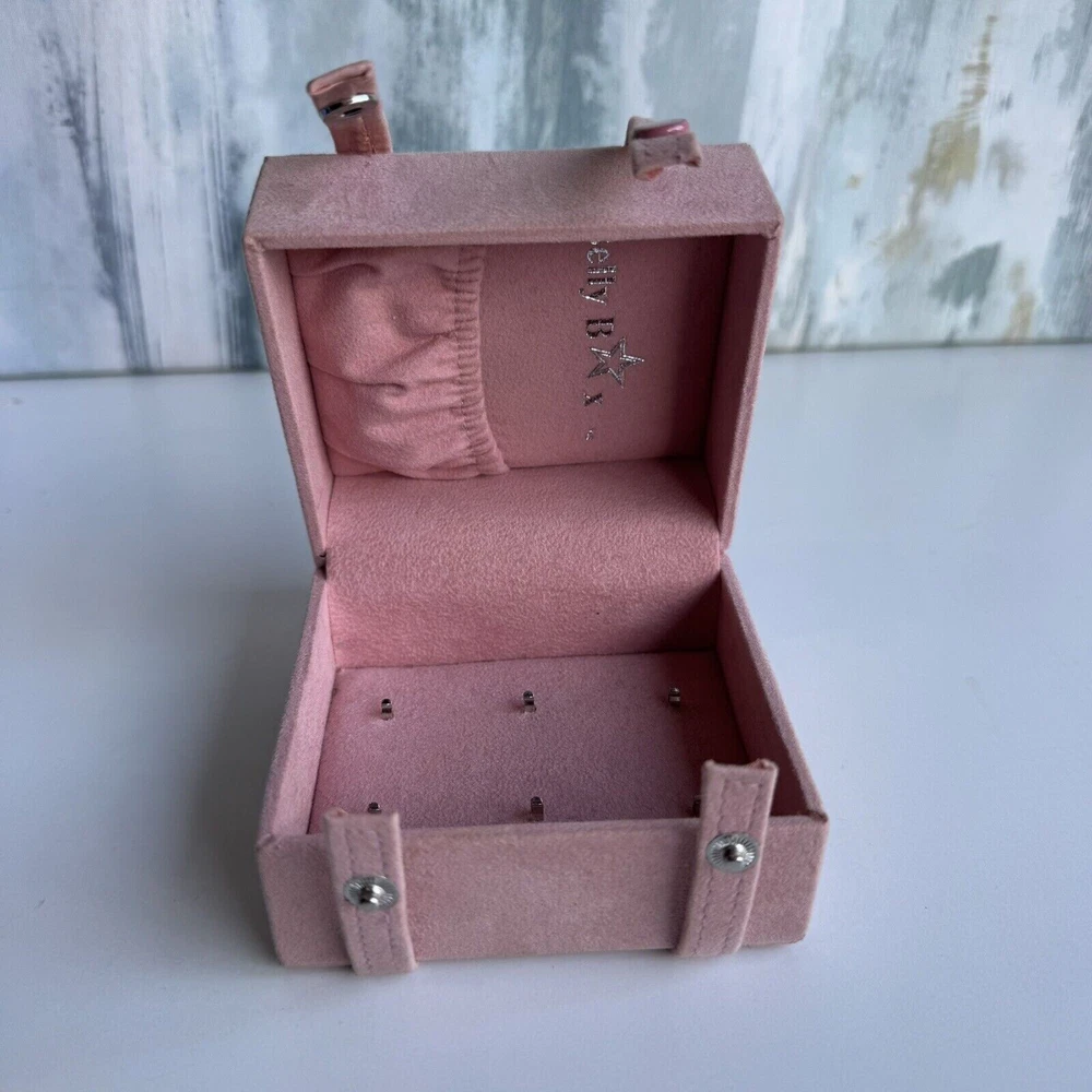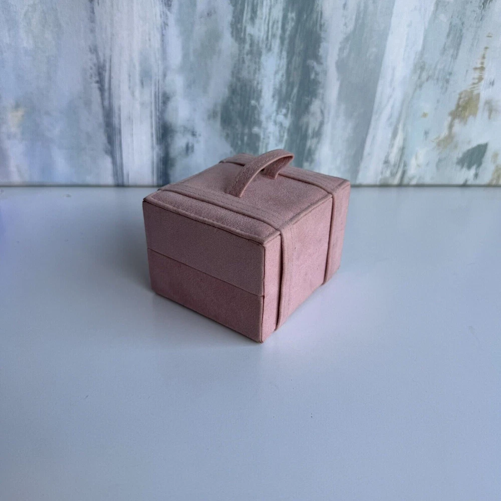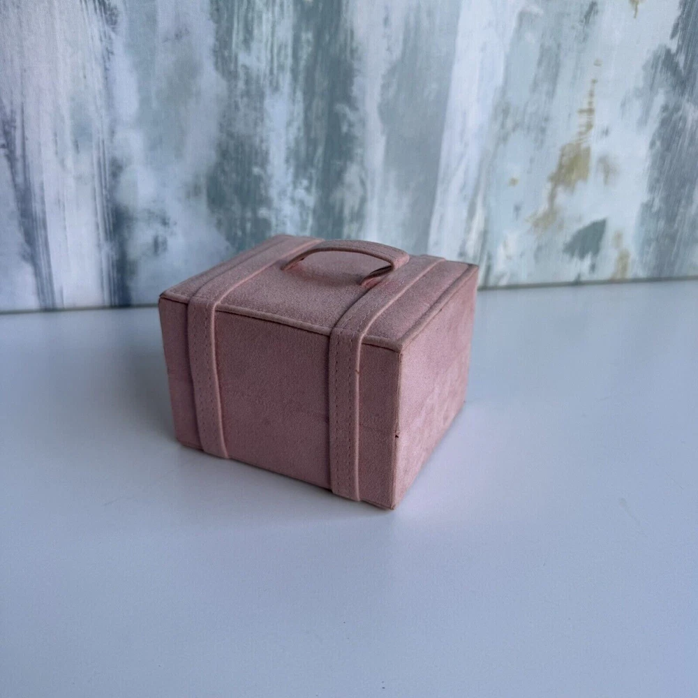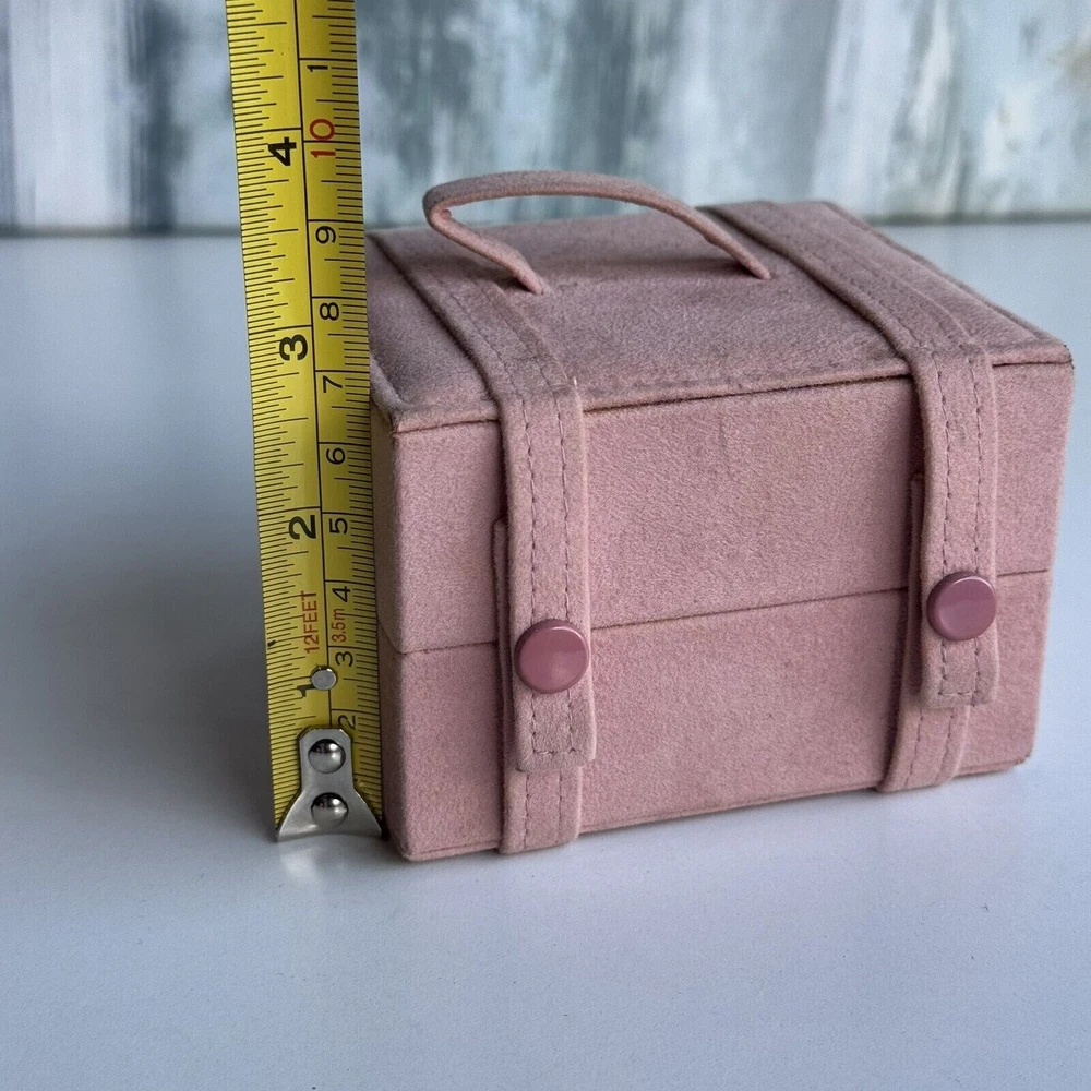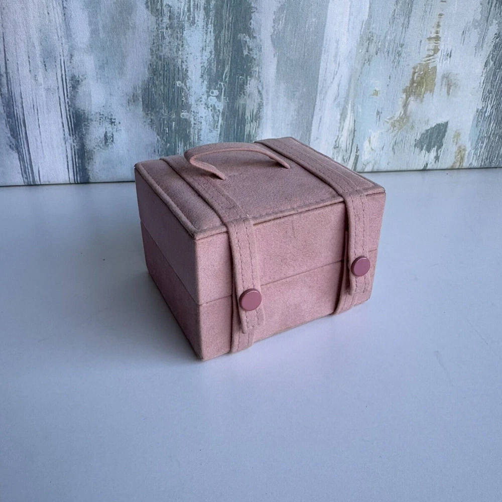 This is a small pink jewelry box with compartments and a snap closure. It is made of faux leather and velvet, suitable for storing various types of jewelry like necklaces, bracelets, and earrings. The travel jewelry case includes small compartments for organization and is designed for women. It is not vintage or personalized, and is suitable for keeping jewelry safe while traveling.n