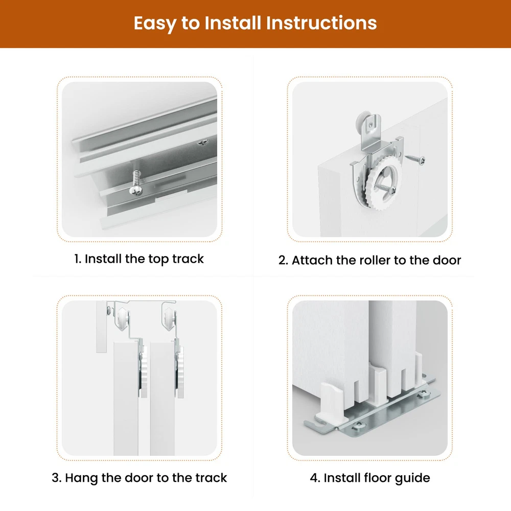 【Material Description】SMARTSTANDARD sliding closet door is made of tempered glass ,PVC film on the surface to prevent scratches and easy to clean,The frosted glass secures privacy while offering natural light. 【Door Sizes】72 "x80" door actual panel size: 2 x 37"(W) x 78 9/16"(H), thickness: 7/8"; The Door size is your door opening size; choose accordingly for the perfect fit. Please note that the door is suitable for door opening heights of 80 inches.(Door Panel Need To Assemble) 【Smooth Track】Our track is designed to be at the top, the track rollers are smooth and noiseless, and the bottom won't scratch the floor or carpet. All track rollers can endure more than 50k opening and closing actions. 【Widely Used】The sliding closet doors with classic design are suitable for most decorating style homes. You can use it in closet/laundry room/storage room/living room/pantries/kitchens and more. Sliding door moves in parallel between the opening and the wall can save space. 【Easy installation】Includes clear instructions with both written explanations and illustrations, making installation a breeze.