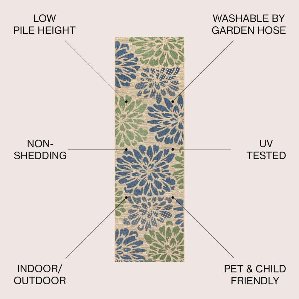 Add some graphic punch to your porch or patio with the bold blooms on our modern floral rug. The large-scale pattern has a geometric effect in a simple palette of leafy green, deep blue and beige. The flatweave design is great for high-traffic spaces indoors too. INDOOR/OUTDOOR DURABILITY: Give your patio, deck or porch an instant makeover with an indoor/outdoor rug; Low-pile synthetic rug fibers are durable for high-traffic spaces like the kitchen, mud room or entry; Perfect for families with STAIN-RESISTANT AND PET-FRIENDLY: This rug is made from synthetic fibers that resist UV fading; The pet-friendly low-pile construction won’t accumulate dirt, and spills clean up easily; It’s been machine-woven so the rug fibers will stay put EASY TO CARE FOR: To wash an outdoor rug, spray the surface with a 5-1 mixture of mild dish soap and water; Then rise thoroughly with a garden hose and hang over a railing to dry thoroughly Flat-weave construction of 100% polypropylene Leafy green and navy flowers on a beige ground
