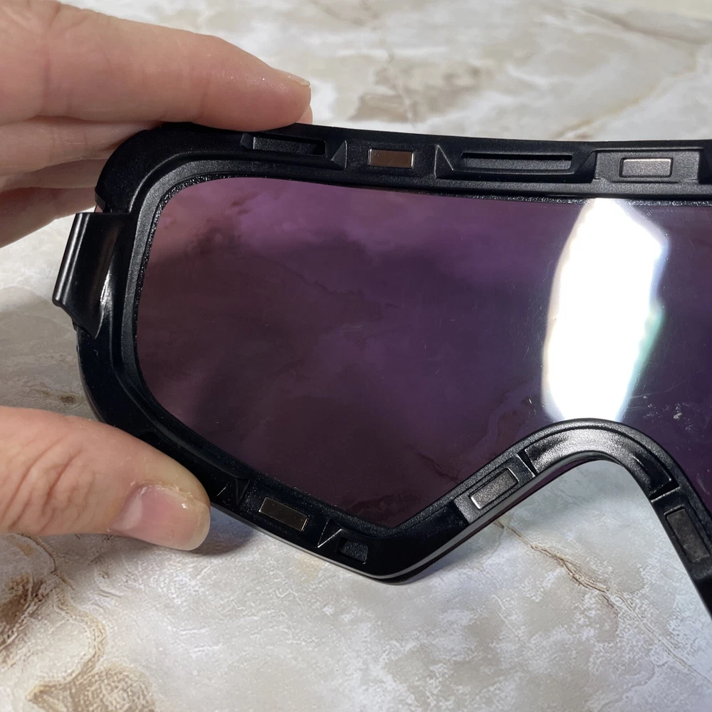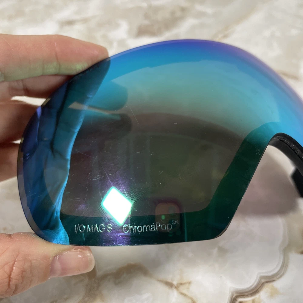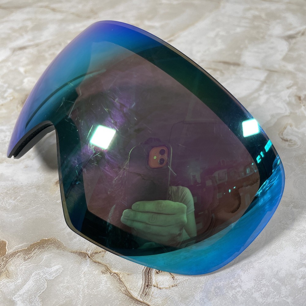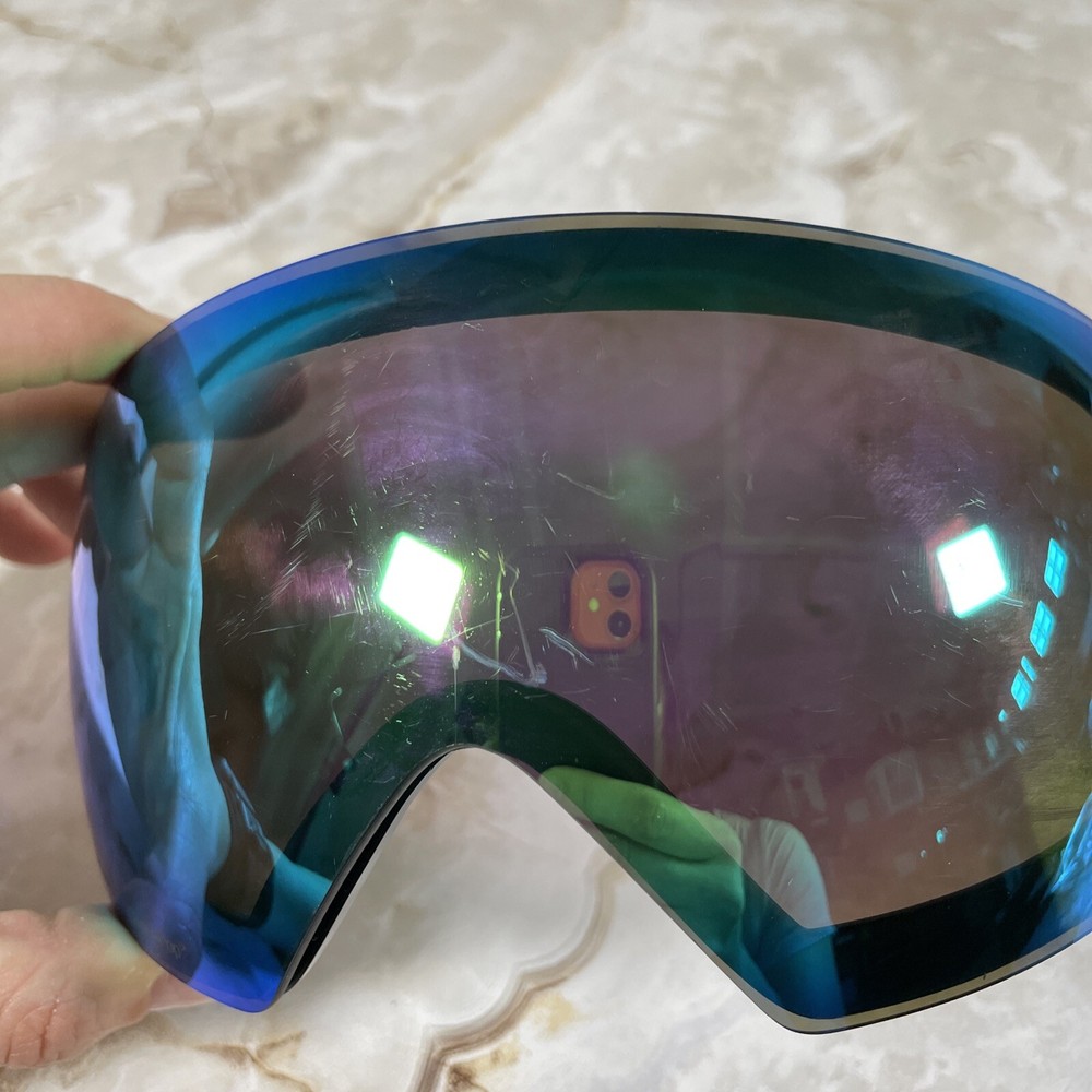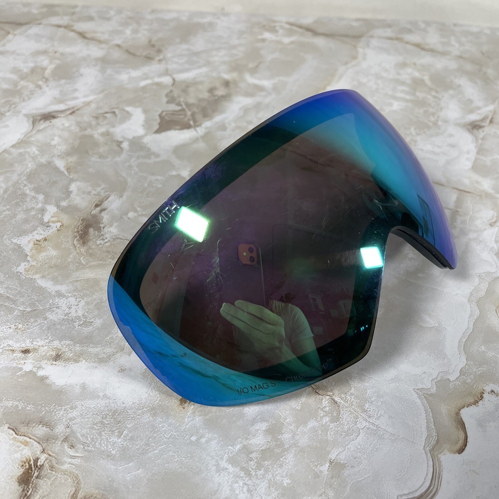 In great condition. Blue/Green mirrored lens with some minor scratches. Magnetic attachment to existing Smith compatible goggles.