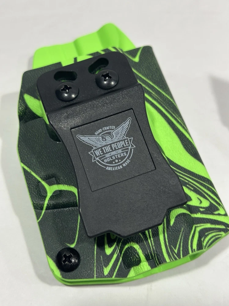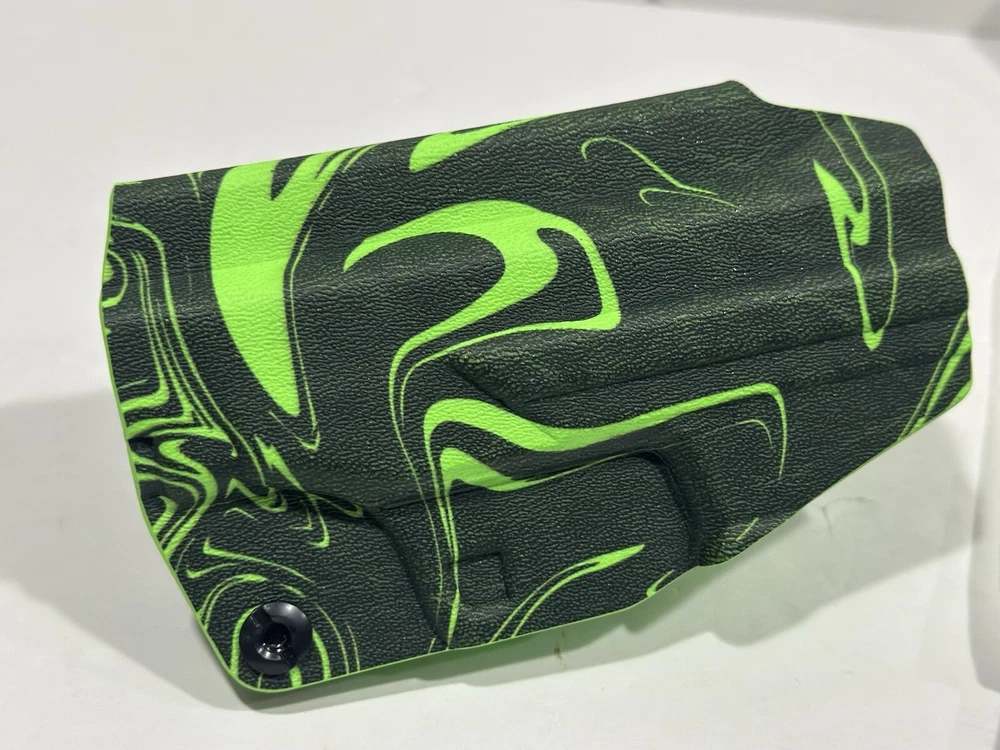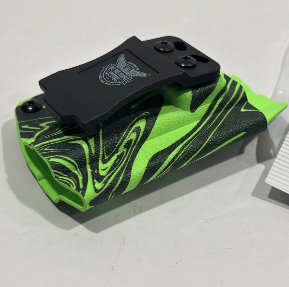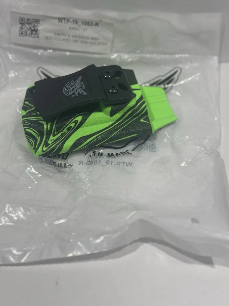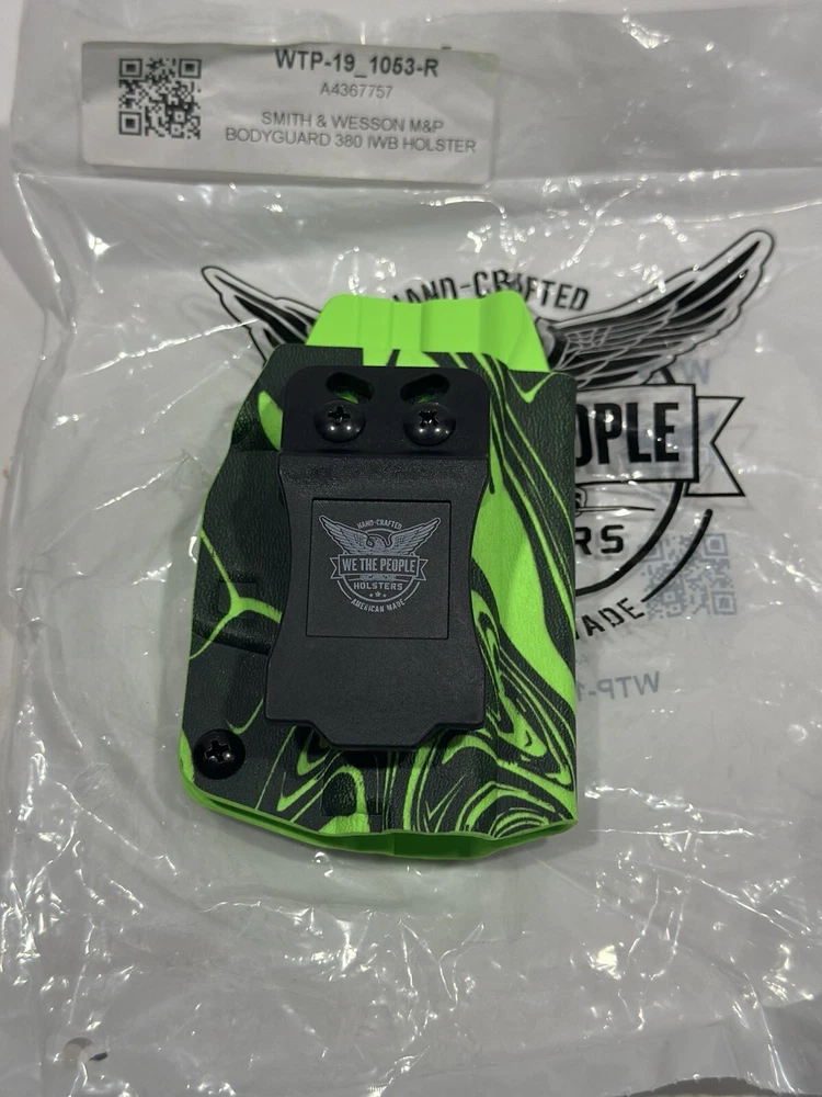 SMITH & WESSON M&P BODYGUARD 380 IWB HOLSTER - Color /Green Ink Swirl This Smith & Wesson M&P Bodyguard 380 holster is a durable, dependable, and form-fitting piece, offering effective concealment and quick, reliable access. Makes it easier to draw and re-holster the gun while keeping your eye on the possible threat or target instead of precious seconds spent searching for the holster. It will also make accidentally re-holstering your gun along with part of your shirt less of an issue Made in the USA Lifetime guarantee Inside the waistband (holster only) Fits a 1.5 inch belt