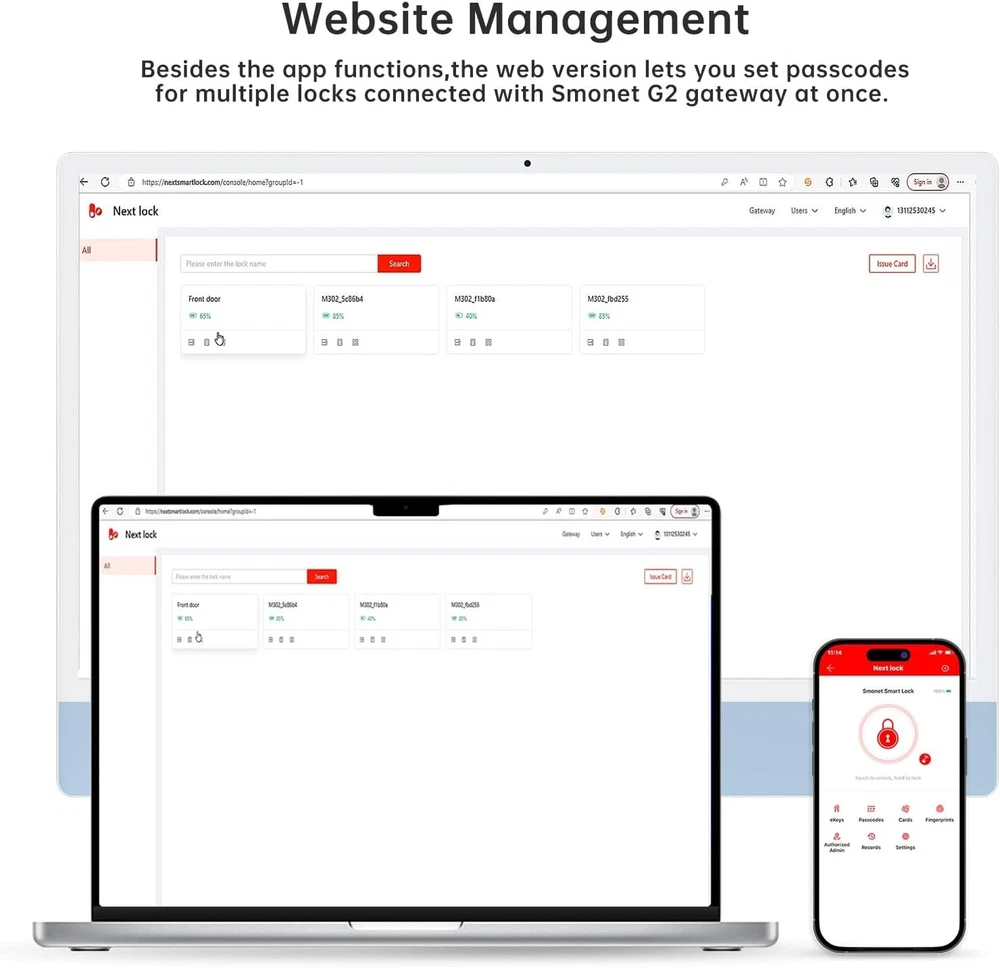 Smart Keyless Entry Door Lock - Fingerprint Electronic Deadbolt Touchscreen Keypad SMONET Biometric Digital Bluetooth Door Lock Smart Deadbolt Compatible with Alexa for Homes and Hotel About this item 8-in-1 Smart Door Lock: Access your smart lock via Fingerprint + App + Web portal + Fobs +Code + eKey sharing + Mechanical key+Voice Control Unlock(Requires SMONET G2 Gateway) App & Web Portal Access: Seamlessly control the smart lock via your smartphone or website. Generate eKeys, manage users, and view records effortlessly. The App & Web are complimentary and offer lifelong use Intelligent Access Management:50 Fingerprints & 250+ User Codes: Grant access remotely with one-time, permanent, scheduled, or recurring codes. Perfect for homes, offices, and hotels Auto-Lock & Privacy Mode: Enjoy added security with one-touch locking, passage mode, and low battery alerts. Anti-peeping, anti-hacking touchscreen keypad ensures robust protection Smart Home Integration: Pair with the gateway (sold separately) for remote access, voice control with Alexa and Google Home, real-time access logs, and smart lock status monitoring Universal Fit: Fits most US standard left or right-handed doors. Simple installation with a screwdriver. Compatible with doors 1.49-1.9'' (38-48 mm) thick. Backset: 2.36''(60mm) or 2.76″(70mm) Ideal for Rental Hosts & Smart Homes: Effortless Syncing & Control, perfect for hotel hosts, property managers, contractors, and smart home enthusiasts. Manage all locks via the app with WiFi remote control (Requires SMONET G2 Gateway) B0CQM7PT1Y