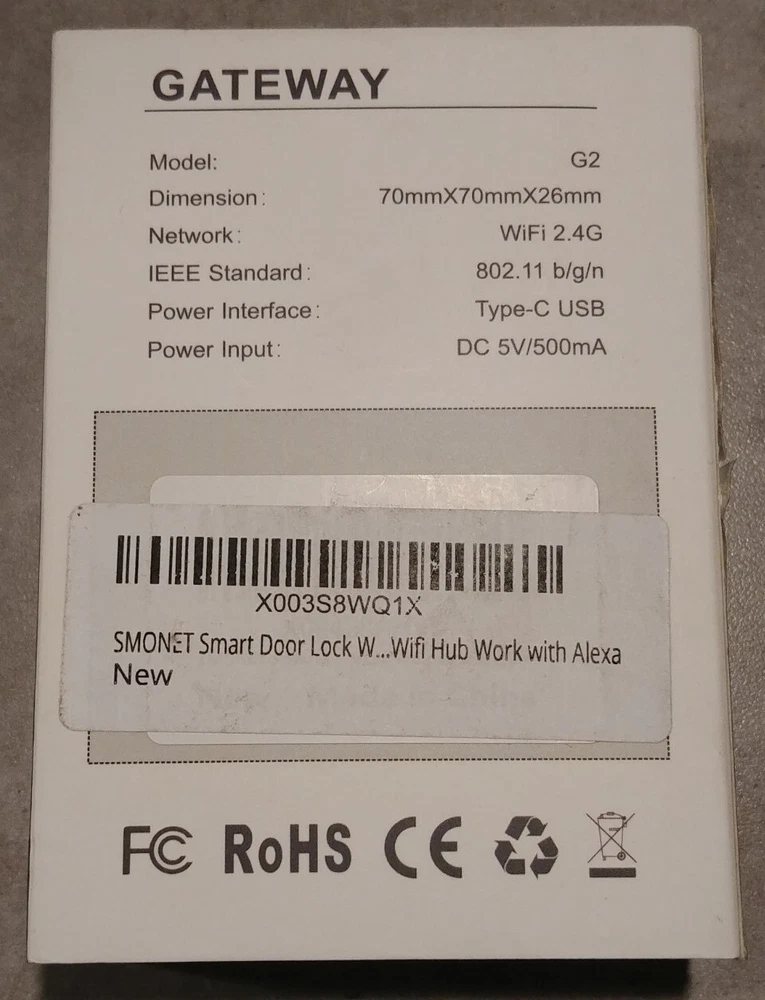 GATEWAY Smart Door Lock WiFi Gateway Keyless Entry 【 Wide Compa tibi lity 】Works for ALL door locks powered with TTLock APP and SMONET Branded Smart Door Lock.(Only support 2.4G WiFi. Does NOT support 5G WiFi) 【 Remotely Co ntrol 】Unlock the door remotely even far away from your home, which is no longer to be limited by the Bluetooth unlocking distance. Read records, modify passcodes, and delete E-key anytime, anywhere. 【 Easy Set Up 】Easy set up within 2 minutes. Please note the distance between the gateway and the smart door lock is no more than 32 ft to ensure a good signal connection. And your smart phone and the gateway must be connected to the same Wi-Fi network when paring the gateway. 【 Multifunc tion WiFi Bridge 】Works with Alexa, reach to voice control via Alexa device. One SMONET gateway can match multiple smart door locks. Please Note: If the login failed in Alexa, please fill in the area code "+1" at front of account. 【 Customer Serv i ce 】30 days Free Return Money-Back & Exchange service, 1 year warranty and Life-time technical support. Any question please feel free to contact us(paring step or installation).