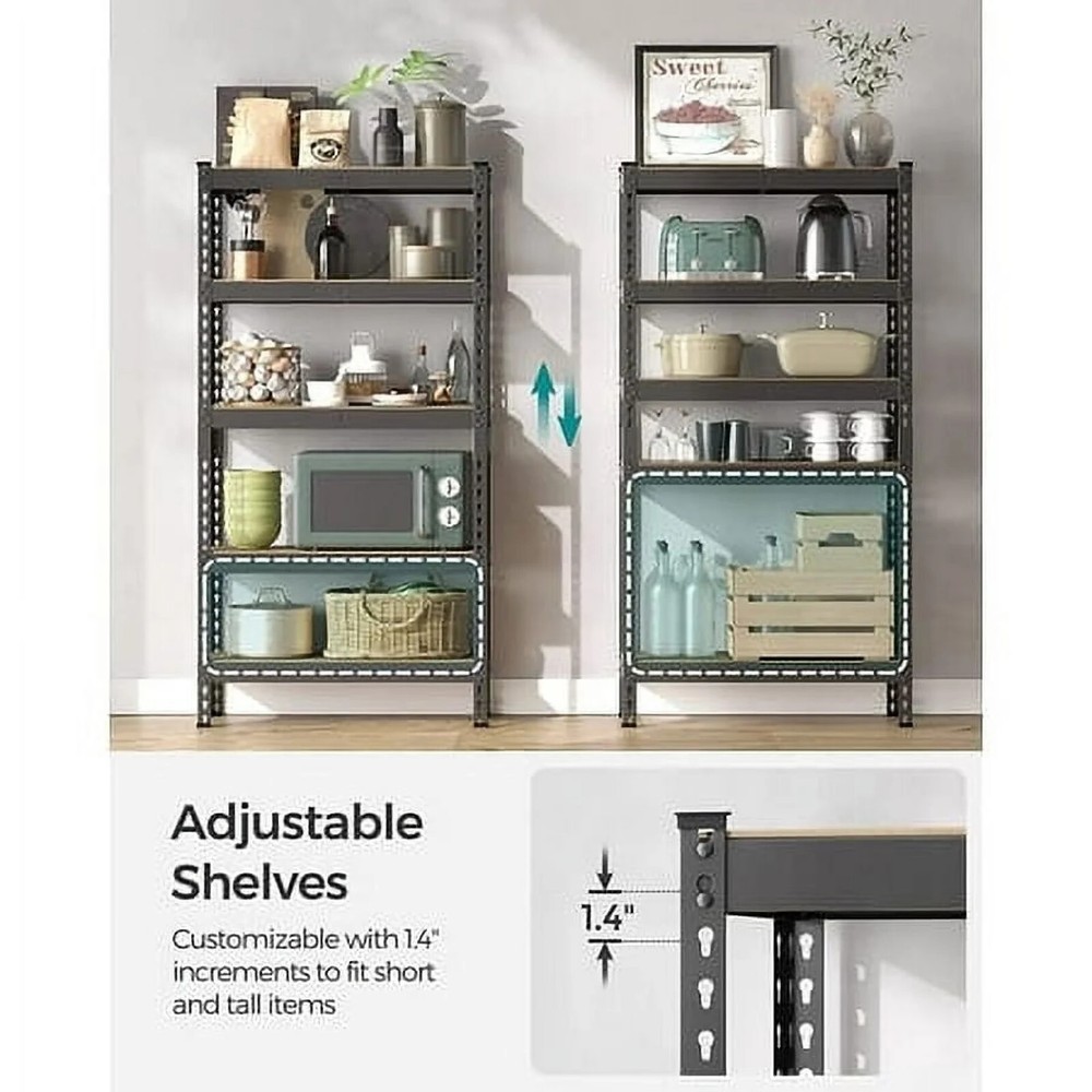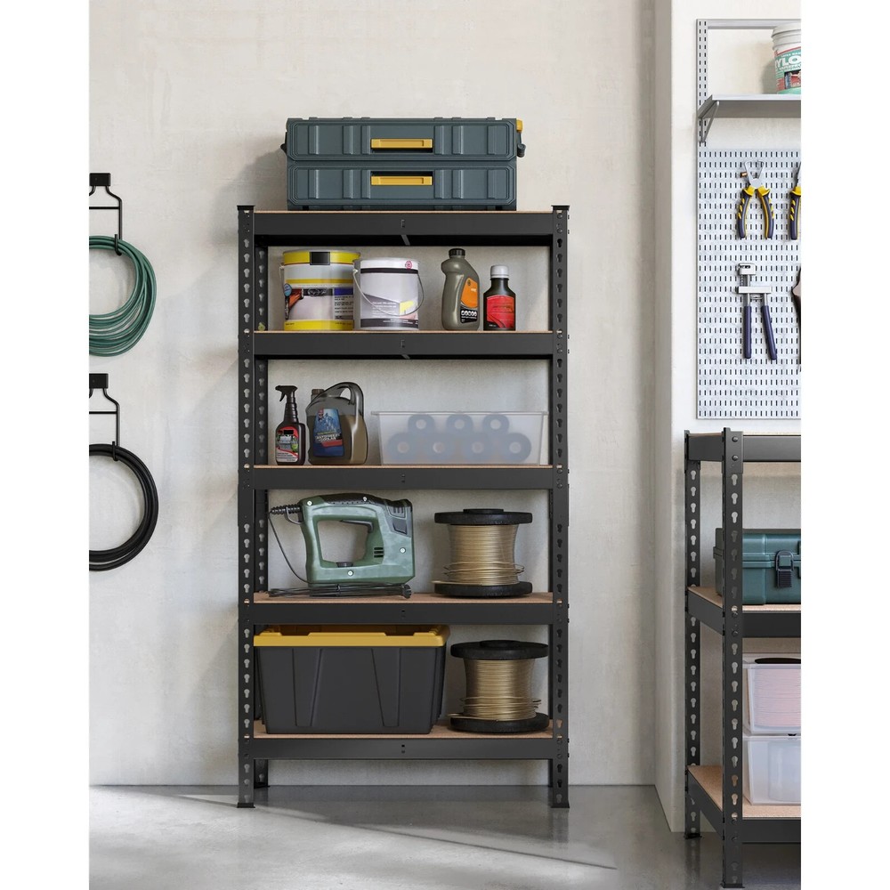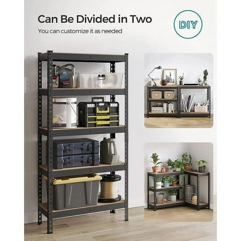 Sturdy and High Load Capacity: Built with a durable steel frame and thick MDF panels, each shelf can hold up to 386 lbs, providing a total weight capacity of 1,929 lbs. Reinforced crossbeams add extra stability, ensuring safe and reliable storage for heavy items. Adjustable Shelves for Versatility: Customize your storage with adjustable shelves, allowing you to change the height in 14" increments. Perfect for storing items of various sizes, including boxes, containers, tools, and sports equipment. Easy Boltless Assembly: This shelving unit is designed for hassle-free, tool-free assembly. Quickly get your items organized and off the floor with its bolt-free design, which also makes disassembly and relocation simple. Convertible 2-in-1 Design: Each unit can be divided into two smaller shelves, offering flexible setup options. Use them side-by-side, in an L-shape, or as separate units in different rooms to suit your space and storage needs. Thoughtful Features for Safety: The unit includes protective foot pads to minimize noise and prevent floor scratches. An anti-tip kit is also included for secure wall attachment, enhancing stability and safety. Specifications: Dimensions: 11.8 x 29.5 x 59.1 inches Maximum Load Capacity: 386 lbs per shelf Material: Steel frame and MDF panels Color: Black This heavy-duty shelving unit is perfect for garages, warehouses, basements, kitchens, or sheds, offering reliable and adaptable storage solutions for all your organization needs.