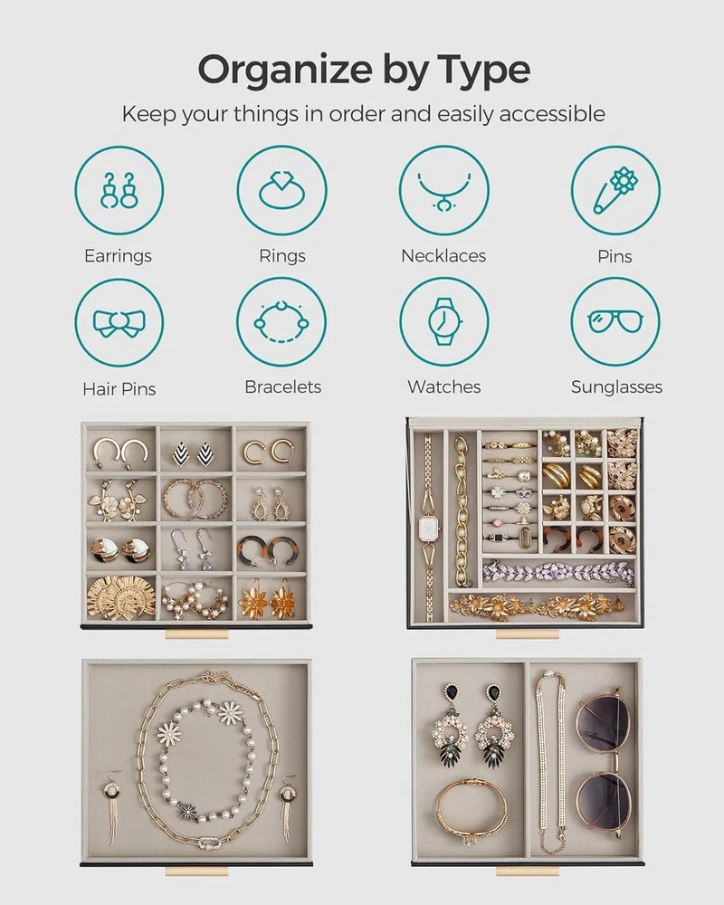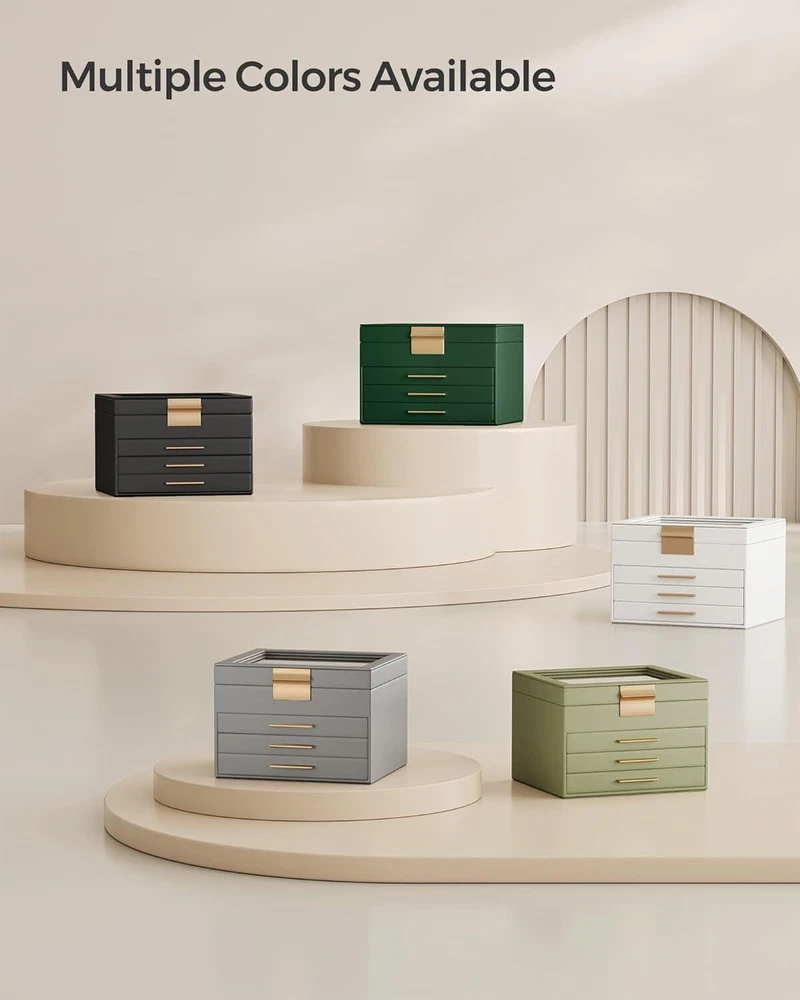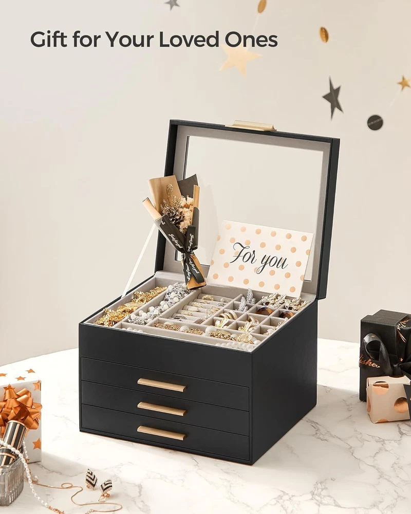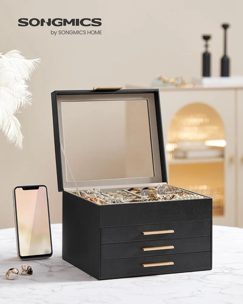 Brand SONGMICS Color Graphite Black + Gold Material Engineered Wood Special Feature Durable, Jewelry Organizer Style Modern About this item [Storage, 4 Layers] Keep all your jewelry organized in this jewelry box—small pieces of jewelry go in the various slots of the top layer, and big jewelry goes in the bottom 3 drawers [Clear Glass Lid] The see-through glass lid of this jewelry organizer allows you to see and find your favorite jewels at a glance while protecting them from dust, keeping your jewelry ready to wear and clean [Chic & Durable] Elegant black and gold colors, shiny metal handles, soft velvet lining, neat stitching, quality PU, and sturdy MDF—all these elements combined make this jewelry case stylish and durable enough for your ever-growing jewelry collection [Perfect Gift Idea] Gift this original design jewelry box to your loved ones for their birthday or anniversary to surprise them! Or, treat yourself to this fancy jewelry box—you deserve it! [Versatile Use] This modern jewelry holder looks nice whether displayed on the dresser of your bedroom or your cloakroom to organize your pins, necklaces, rings, bracelets, and other accessories On Feb 14, 2025 at 17:49:48 PST, seller added the following information: