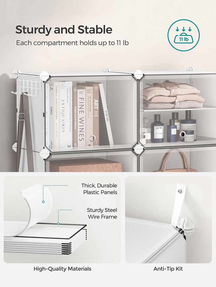 About this item [Storage Aplenty] This versatile plastic shoe storage organizer, able to accommodate up to 40 pairs of shoes, doubles as storage for bags and clothing. Its space-efficient side hooks offer a handy spot to hang hats or dog leashes [Robust and Secure] Crafted with premium connectors, durable plastic panels, and strong steel wire, each slot of this shoe storage cabinet holds up to 11 lb. The provided anti-tip kit ensures safe use in living rooms or bedrooms [Easy Assembly and Disassembly] The included rubber mallet makes assembling this shoe rack quick and easy. This organizer can also be quickly disassembled to store or transport, letting you easily rearrange this around your home [Adaptable and Versatile] Configure this storage unit in different ways. Make it have 2 or 3 separate rows, or even divide it into 2 small shelf units to organize shoes, clothes, or toiletries in your entryway, bathroom, or any other desired space [Ventilated and Easy to Clean] This plastic shoe cabinet features clear doors, providing dust-proof and waterproof protection while allowing easy viewing of shoes inside. Grommets on the doors enable effortless opening and promote ventilation Specifications: Material: ABS Plastic Connector, PP Plastic Panel, Steel Frame Product Size: 12.6"D x 32.7"W x 61.4"H (32 x 83.1 x 156 cm) Interior Size of Each Compartment: 11.8"D x 15.7"W x 11.8"H (30 x 40 x 30 cm) Product Weight: 21.2 lb (9.6 kg) Max. Static Load Capacity per Compartment: 11 lb (5 kg) Total Max. Static Load Capacity: 110 lb (50 kg) Package Contents: 10 x Plastic Panel with Grommet (15.7" x 11.8") 34 x Plastic Panel (15.7" x 11.8") 15 x Plastic Panel (11.8" x 11.8") 2 x Anti-Tip Device 34 x Joint 40 x Plastic Connector 1 x Wire Panel with 5 Hooks 1 x Rubber Mallet 1 x Instructions SONGMICS Notes: For safety, be sure to secure the shoe rack to the wall with the included anti-tip kit. Children are not allowed to climb on or play with the shoe storage cabinet for safety. Do not overload this shoe storage organizer. Do not place the storage unit outdoors for a long time to avoid weathering. Keep the rounded sides of the plastic connectors marked "SONGMICS" facing outwards during assembly. During assembly, ensure that the corners of the panels are fully inserted into the bottom of the connectors for greater stability. Material: Stainless Steel