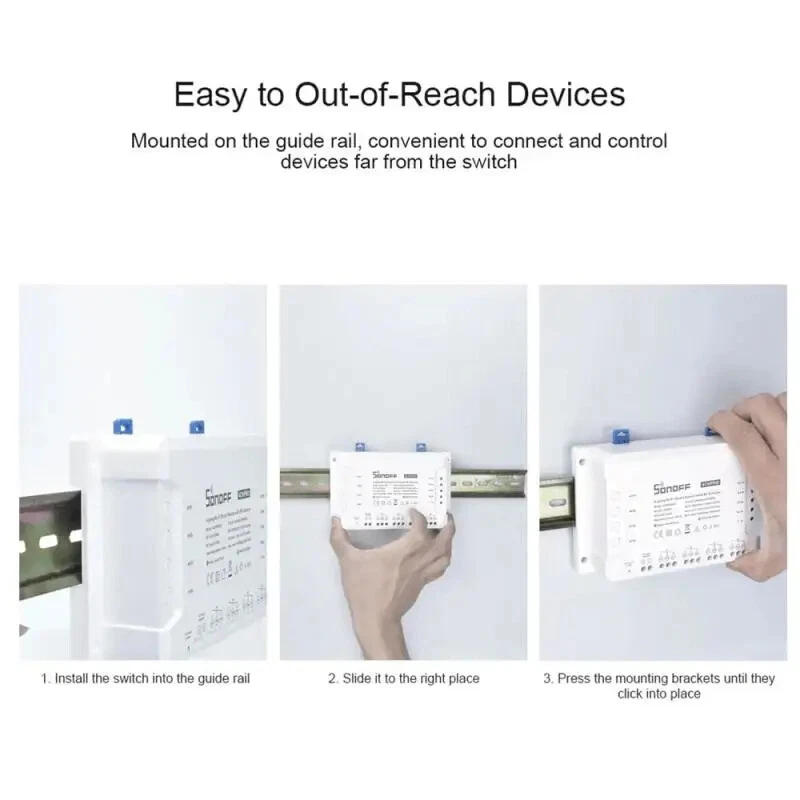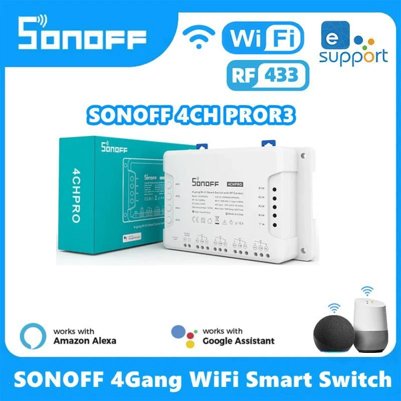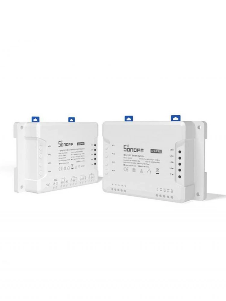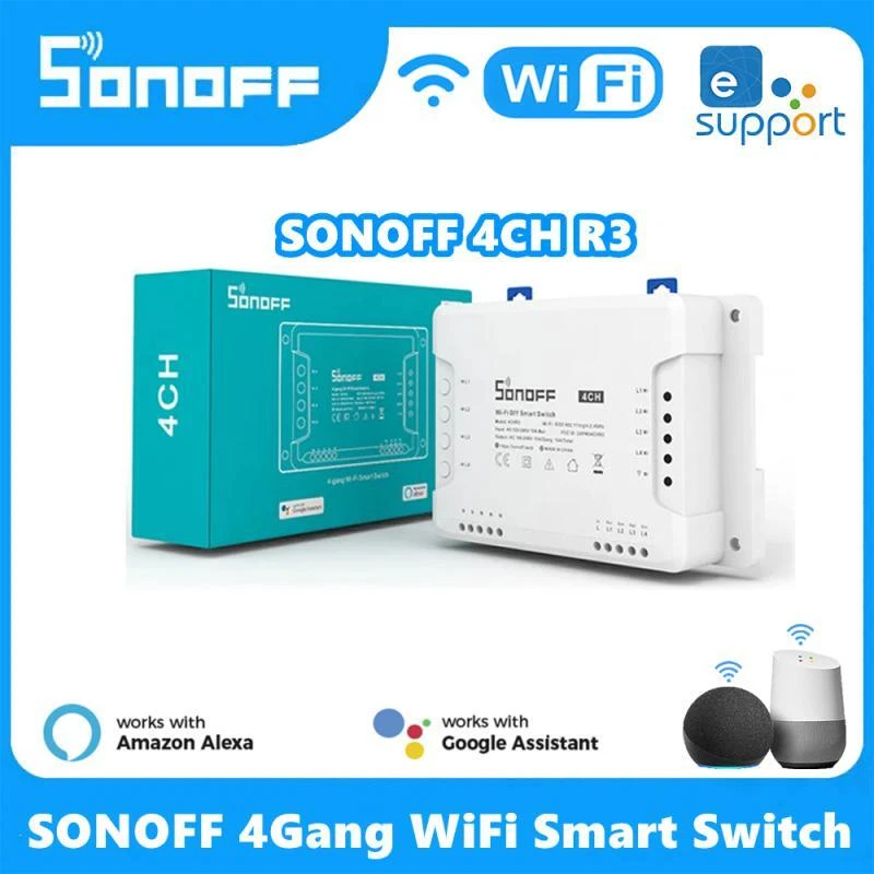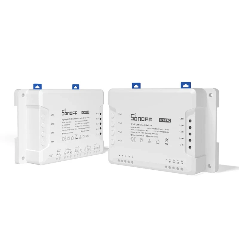 SONOFF 4CH R3/ 4CH PRO R3 4 Gang WiFi Smart Switch Module Inter Lock Inching Lock Mode DIY Switch Ewelink APP Alexa Google home Description: 100% brand new and high quality Sonoff 4CH is an ESP8285 based 4 channel (4-gang) din rail mounting WiFi switch. Sonoff 4CH supports to connect and control 4 home appliances, which can be turned on/off separately by the buttons or iOS and Android APP EweLink. Owning a Sonoff 4CH means you have 4 Sonoff basic WiFi switches integrate together. The enclosure is din rail mount supported! A DIN rail is a metal rail of a standard type widely used for mounting circuit breakers and industrial control equipment inside equipment racks. These products are typically made from cold rolled carbon steel sheet with a zinc-plated or chromated bright surface finish. Sonoff 4CH belongs to Sonoff family, definitely, it bears all the functions basic Sonoff has. In EweLink, you can remote turn on/off from anywhere at any time, set single/repeat/countdown timing schedules to turn on/off at a specified time, share to others so that they can control together. Sonoff 4CH is hacker-friendly that you can flash your firmware without difficulty. After accessing to Google Nest, e-We Link can receive real-time environment data like temperature, humidity from Google Nest, as well as checking if there is anybody home or not. All these can be used to create smart scene to control e-WeLink supported Sonoff devices. Support independently turn on/off 4 home appliances Support to control home appliances by local toggle buttons or APP Support tracking device status and timely remote control through APP Support countdown timing and schedule timing Support one-key sharing device to other user Working modes: inching/interlock/self-locking mode Adjustable time for inching mode: 0.16s Power Supply: 90-250V AC(50/60Hz) / 5-24V DC Max current: 10A/gang Max Power: 2200W/gang Color:white Wireless Standard: Wi-Fi 2.4GHz b/g/n, 433MHz RF Security Mechanism: WEP/WPA-PSK/WPA2-PSK Specifications: Support countdown timing and schedule timing Support one-key sharing device to other user Support tracking device status Timely remote control through APP Independently turn on/off 4 home appliances 4 Channel din rail mounting WiFi switch Package Included: 1 x Sonoff 4CH R3 pro Smart Switch