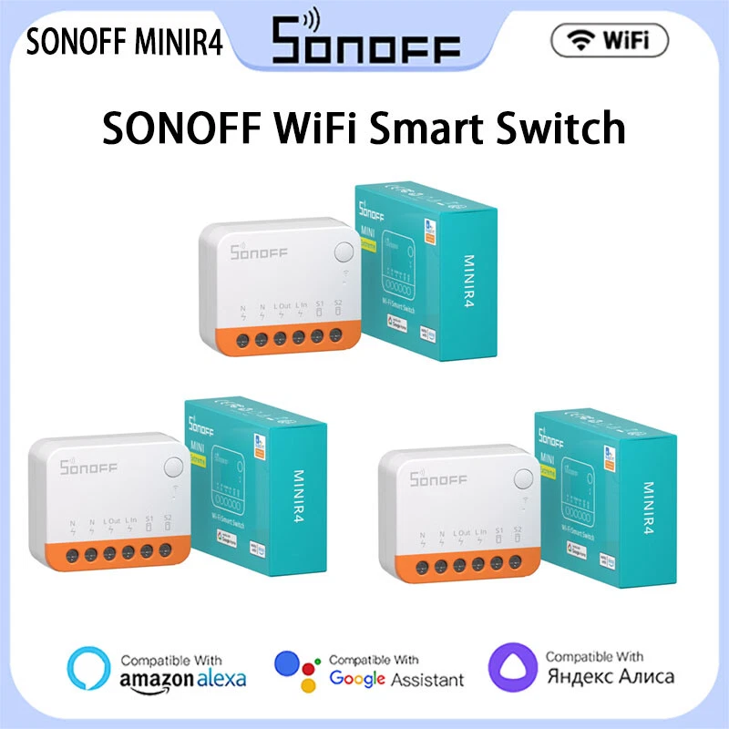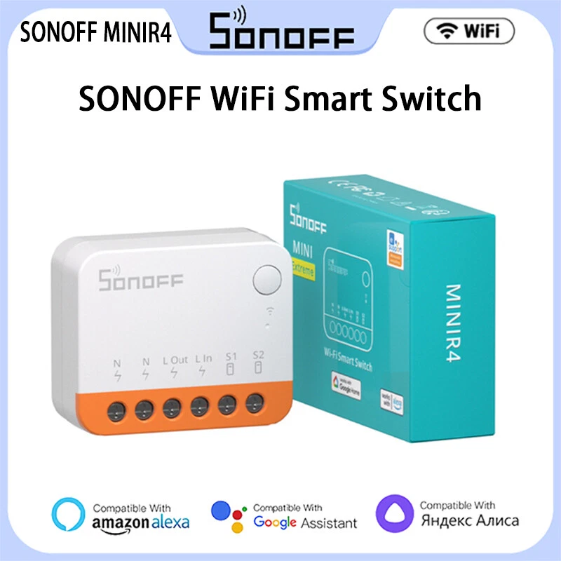 SONOFF MINIR4 WiFi Smart Switch 10A 2-Way Control Mini Extreme Smart Home Relay Support R5 S-MATE Voice Alexa Alice Google Home Description: Model:MINIR4 Dimension:39.5x33×16.8 mm casing material: PC V0 Wifi:IEEE 802.11blg/n 2.4GHz Input:100-240V ~ 50/60Hz 10A Max outputL100-240V ~ 50/60Hz 10A Max Specifications: 【Super Tiny Size】Its compact size allows it to be installed in various mounting boxes, including the smallest European standard. 【External Switch Control】Easily connect to the momentary switch, door exit switch, SPDT switch, latching switch, and even dry contact sensors. 【Detach Relay Mode】MINIR4 has “detach relay” mode, which means the states of external switches and relay are separated, so operating the external switch button won’t affect the relay state. 【eWeLink-Remote Control】MINIR4 is a smart switch with the gateway function of “eWeLink-Remote”. You can add “eWeLink-Remote” sub-devices, R5 and S-MATE, after pairing with MINIR4, both R5 and S-MATE can act as remote controllers to control MINIR4 locally through the eWeLink-Remote signal. 【Safe & Reliable】TÜV, CE, and FCC certifications ensure a safer and more reliable product. Package Included: 1*Smart Switch
