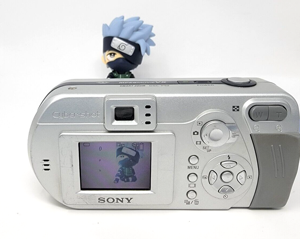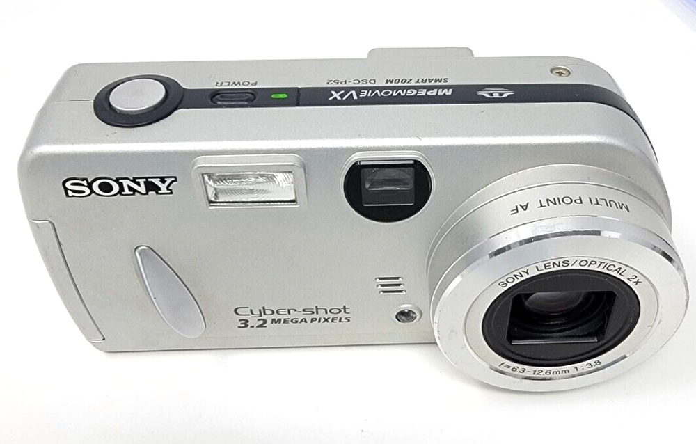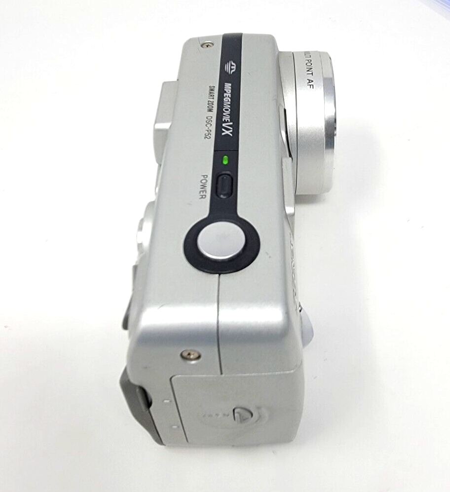 SONY CYBER-SHOT DSC-P52 COMPACT DIGITAL CAMERA 3.2 MP 2x OPTICAL ZOOM SILVER 1.6 Condition is Good. See pictures for condition. New Batteries Installed. Only the items in the pictures are included. No other accessories are included. Fast Shipping. Shipped with USPS Ground Advantage or equivalent