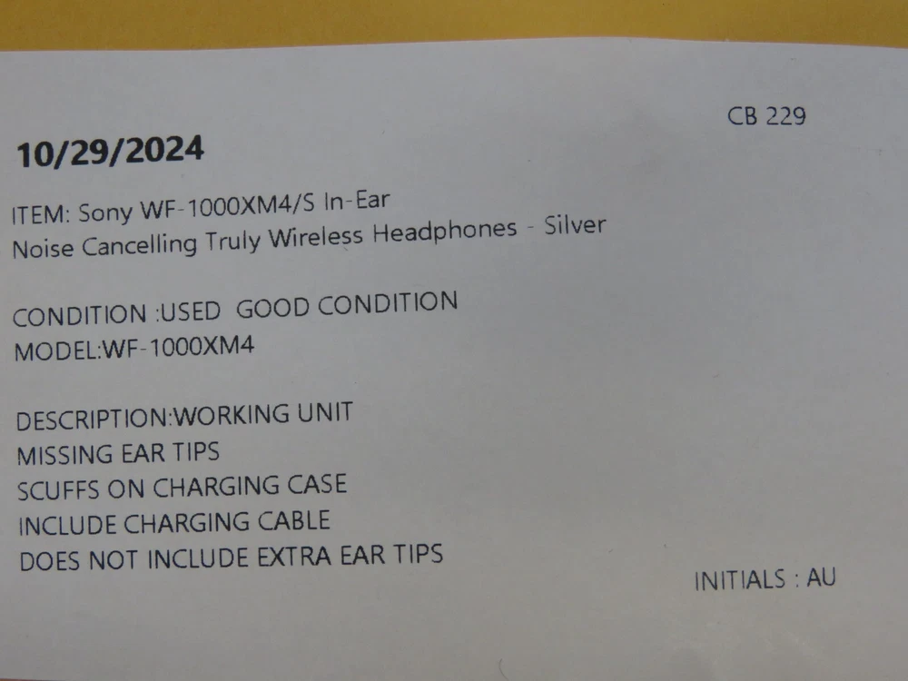 SONY WF-1000XM4 Wireless Earphone Noise cancelling - Silver (WF1000XM4) MISSING EAR TIPS Functional Condition: Tested and Functional. DOES NOT INCLUDE EARTIPS Cosmetic Condition: This is a Used Item and Normal Wear (Scuffs & Scratches) is Expected. Items included in this listing: HEADPHONES CHARGE CASE CHARGE CABLE Items NOT included in this listing: EARTIPS Thank you for Shopping with Us! ENJOY Free Shipping in USA & Low Cost Shipping to CANADA! Terms of Sale NOTE: Our Listings only include items as pictured - Please do not assume any item is included if its not pictured. We will try our best to picture all items included in this listing as well as its cosmetic condition. We Guarantee & Stand Behind our product and commitment to provide you with o nly Original, Branded, OEM & Genuine Products Shipping A complete and correct shipping address is essential. We cannot guarantee the shipping address can be changed after checkout. Sales Tax will be charged to all Canadian & USA Buyers. Combined shipping is not guaranteed. We are unable to change any content of your order based on the eBay checkout note or PayPal message. Customers with shipping addresses outside of the U.S.A and Canada are responsible for all duties and import taxes. Please contact your customs for information Bidding All items are accurately described and pictured. Please ensure you are consciously bidding on the items as described. Payment Payments are expected at the time of purchase or in case of Auctions, at the end of auctions. Payments are managed via eBay Managed Payments Contact Us Your positive feedbacks are extremely valuable to us. If you have any concerns about your order, please contact us through eBay message to resolve any issues before leaving a negative feedback or opening a dispute. We will reply within 24 Hours Return Policy All items are in used condition unless specified.