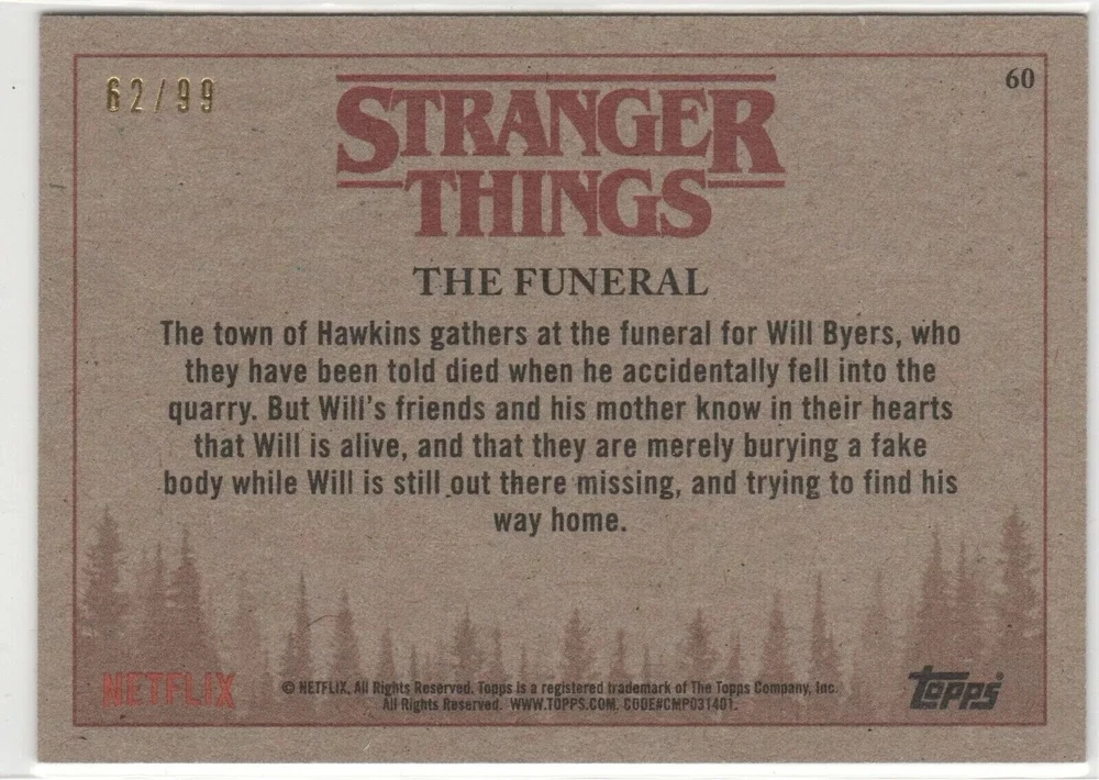 SP Upside Down Blue Parallel 62/99 The Funeral #60 Stranger Things 2018 Season One Netflix chase insert short print personal stock image centering of card may vary compared to listed image