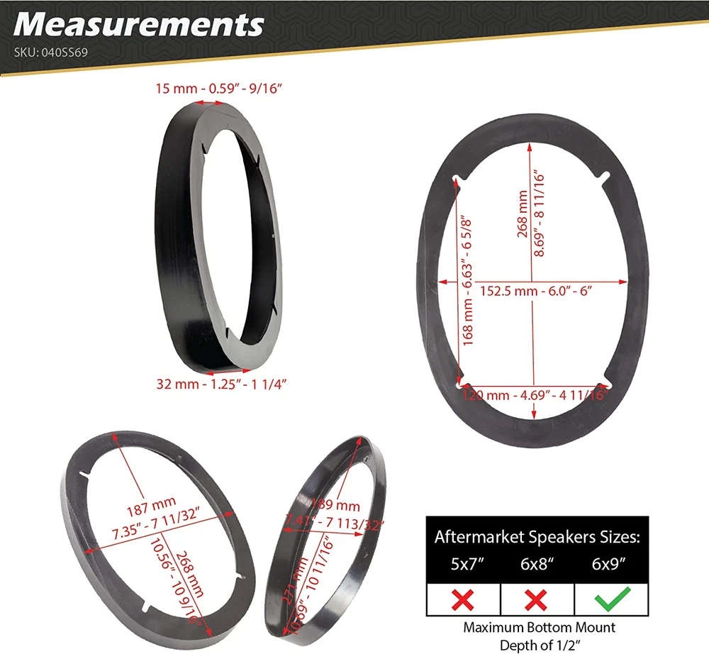 Store New Arrivals Add to Favorite View Feedback Contact SS69 Universal 1.25" Angled 6 X 9" Speaker Spacer (1 Pair),Black Description Item model number SS69 Style SS69 Number of Items 2 Power Source Corded Electric Country of Origin China Warranty Type Limited Lifetime Woofer Diameter 9 Inches Vehicle Service Type Car, Truck Controller Type Remote Control Unit Count 1.0 Count Speaker Size 9 Inches Material Acrylonitrile Butadiene Styrene (ABS) Includes MP3 player? No Pattern Name Spacer Package Type Standard Packaging Model Name SS69 Recommended Uses For Product vehicle Is Discontinued By Manufacturer No Specific Uses For Product vehicle audio system upgrade, speaker replacement in various vehicle makes and models Speaker Maximum Output Power 100 Watts Water Resistance Level Not Water Resistant Item Weight 5.9 ounces Special Feature Durable Weight 1.06 Pounds Mounting Type Wall Mount Color black Surround Sound Channel Configuration 1.0 Compatible Devices Smartphone Speaker Type Speaker Adapter Global Trade Identification Number 00033991987777 Is Waterproof FALSE Audio Output Mode Stereo Audio Driver Size 6 Inches Product Dimensions 15.5"D x 12"W x 1.5"H Upgrade Your Speaker: Angled face that adds 1-1/4" (32mm) and tapers to 9/16" (14mm). Adapters enable you to upgrade your vehicle specific factory speakers with aftermarket speakers into the factory locations Speaker Compatibility: Fits most 6" x 9" aftermarket speakers with a maximum top mount diameter of 6" (152.5mm) x 8 11/16" (268mm). See Measurements Image to verify that your speakers will fit in these adapters Vehicle Compatibility: Fits most Import and Domestic vehicles with factory 6" x 9" speakers. See Measurements Image to verify that these adapters will fit your vehicle Quality Materials: High-grade ABS materials precision designed for a gapless fit between the speaker and the adapter providing a long lasting, secure fit Buy With Confidence: Backed by Scosche's Tech Support and Limited Warranty For 40 years, Scosche has been producing high quality, affordable Car Stereo Dash Kits, Vehicle Wiring Harnesses, Adapters, Interfaces, Amplifier Wiring Kits, Cables and other 12V installation accessories. We know how you feel about your vehicle, so we will not design, engineer or deliver a product that does not meet our extremely high standards. When you purchase a Scosche installation accessory, we have you covered. We offer Tech support which means our knowledgeable tech team is available to answer any product questions you may have for as long as you own the product. We are so confident in our product quality that we back all Scosche 12V installation accessories with a Limited Warranty. ABOUT US We offer the best prices around on high quality products. Our E-store includes media such as books, movies, music and games while offering electronics, toys, sporting apparel, clothing, tools, general home, garden items and more. SHIPPING We are always working hard to ensure your package arrives as soon as possible. Please understand that some factors like weather, high postal traffic, and the performance of shipping companies are outside of our control. We offer free shipping to the lower 48 states and ship within 2 business days of payment, usually sooner. We do not accept P.O. Boxes. Please provide a physical address. For shipping outside of the continental USA, we only use eBay's Global Shipping Program.The item is shipped to KY and then sent to the rest of the world. International customers are responsible for all duties and taxes. Continue to check out in order to calculate costs for shipping the item to your country. Messages regarding eBay's Global Shipping Program MUST be directed at eBay EXCLUSIVELY. RETURNS We offer a 30-Day Return Policy on items which you are not completely satisfied with. You have the option for a full-refund or an exchange of the item. No returns are available on items shipped outside of the USA. PAYMENT We accept PayPal. CONTACT US This page content is yet to come Please ad us to your favorite seller and visit again later Thank You CUSTOMER SATISFACTION We try our very best to make sure every customer is completely satisfied. If there's a problem, message us! We're happy to help. WE ACCEPT Copyright © 2021 AutoDS. | All Rights Reserved