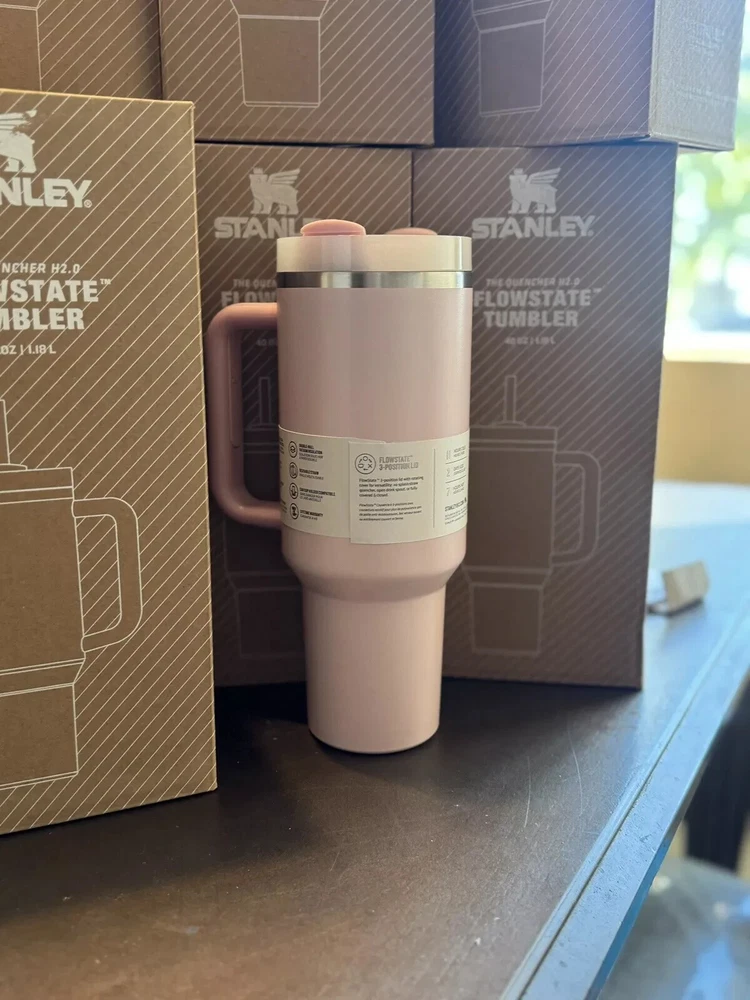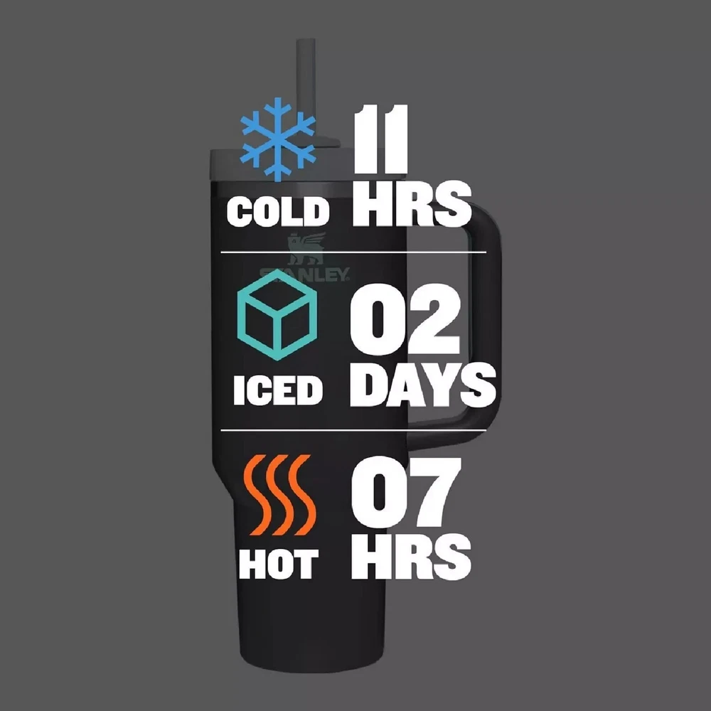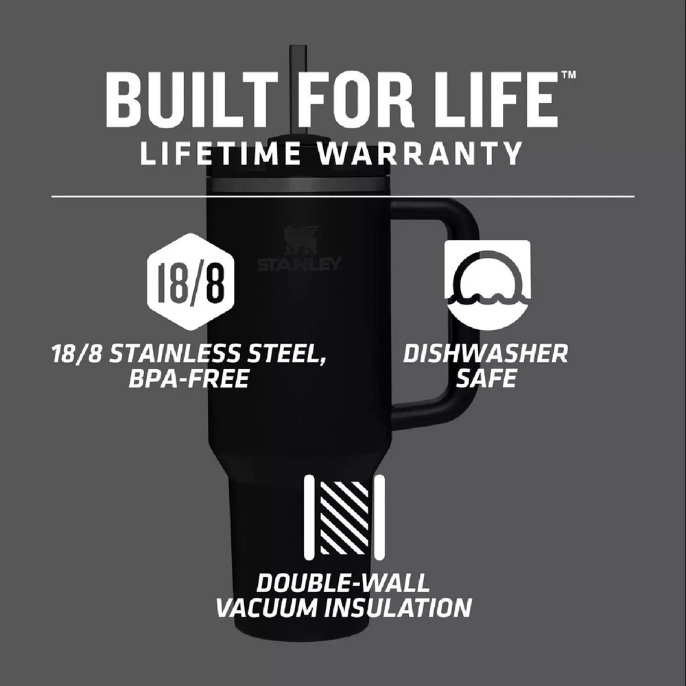 Constructed of recycled stainless steel for sustainable sipping, our 40 oz Quencher H2.0 offers maximum hydration with fewer refills. Commuting, studio workouts, day trips or your front porchyou’ll want this tumbler by your side. Thanks to STANLEY’s vacuum insulation, your water will stay ice-cold, hour after hour. The advanced FlowState lid features a rotating cover with three positions: a straw opening designed to resist splashes while holding the reusable straw in place, a drink opening, and a full-cover top. The ergonomic handle includes comfort-grip inserts for easy carrying, and the narrow base fits just about any car cup holder.