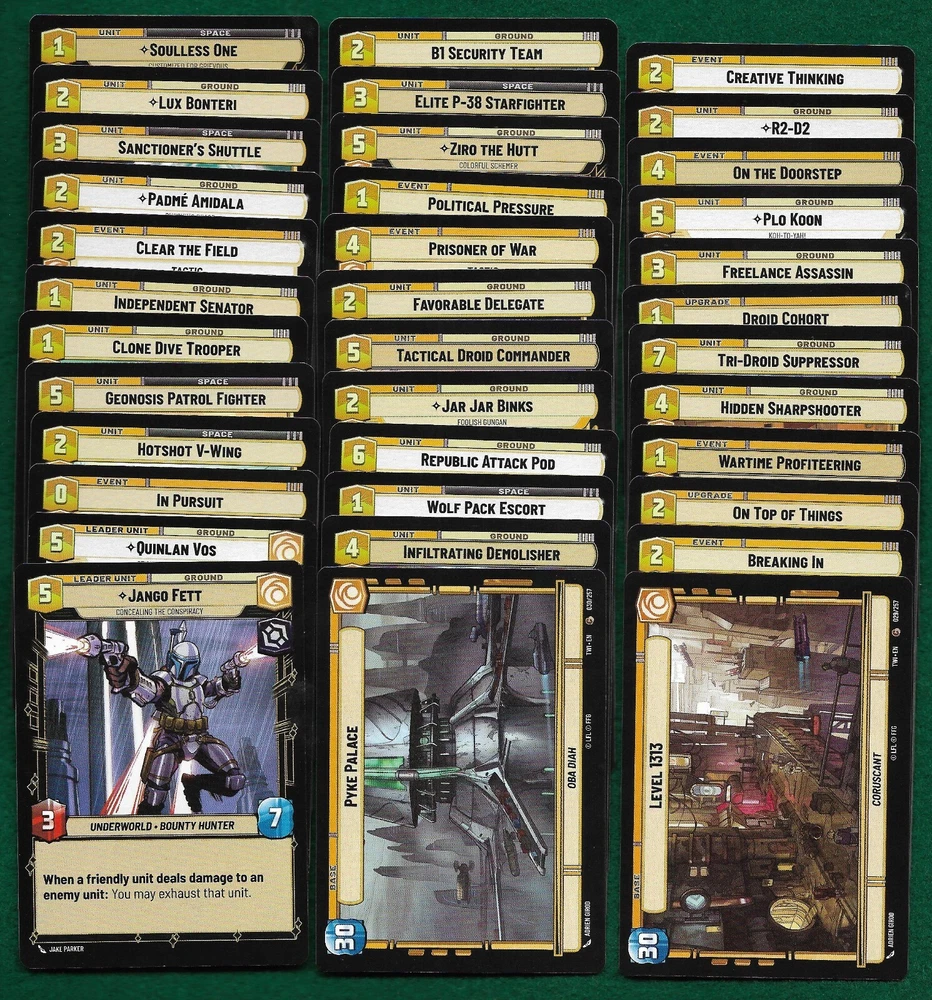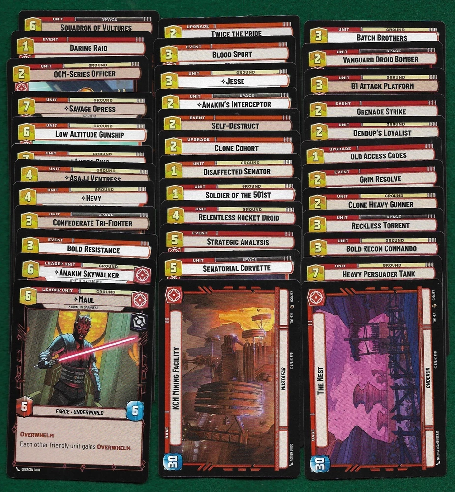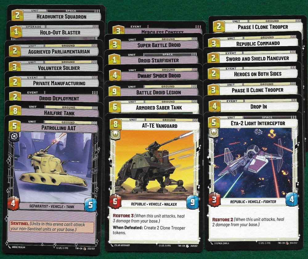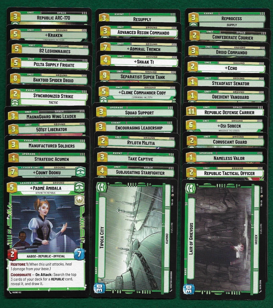 Up for a BUY IT NOW is a complete 166 card set of the basic common and uncommon cards within the bigger TWILIGHT OF THE REPUBLIC set. Please look at the pictures to see the cards that are included. All cards listed are pack fresh and have never been played. Thanks for looking.