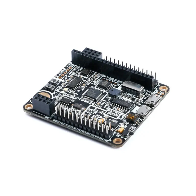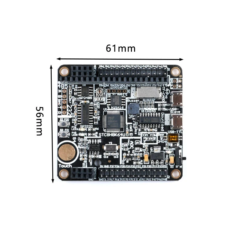 A development board is a circuit board used for embedded system development, including Central processor Memory, input devices, output devices, data paths/buses, and external resources A series of hardware components such as source interfaces. Development board - generally developed by embedded system developers based on Users can customize their own requirements or research and design them by themselves. The development board is for beginners to understand and Learn the hardware and software of the system, as well as the basic integrated development environment provided by some development boards And software source code and hardware schematics. Common development boards include 51, ARM, FPGA DSP development board. In addition to integrating CPU, FPGA, DSP, etc., the hair board also needs to compare Improve input and output interfaces, such as keyboard and LCD, program download interface, memory (RAM ), FIashROM, power module, etc. Text introduction to development board functions: basic function Design highlights Features: 1 STC8 series 48 pin STC8H8K64U 9 SPI TF card holder (high-end mini version) 2. All I0 are exported 10 Buzzer (ultra small patch passive) 3 on-board 5v-3.3v LDO step-down circuit 11 485 communication function (industrial dedicated communication) 4 Fused overcurrent protection circuit 12 232 serial communication circuit (conventional communication) 5 USB-TTL CH340 download chip 13 USB 2.0 function USB slave interface Support USB to serial computer communication USB direct download is also supported 6 Two independent mechanical keys 14 - capacitive touch buttons 7 22.1184MHz chip 5032 high-precision external main frequency crystal oscillator 15 W25X16 2M external FLASH memory chip 8 2 LED I0 controls -1 red -1 green 16 AT24C02 external EEPROM memory chip Extension interface A NRF24L01 2.4g wireless module interface B ESP 8266 WIFI module interface C Bluetooth 4.0 module interface D VS1053 music module interface E W5500 Network Module Interface On Dec 19, 2023 at 22:28:06 PST, seller added the following information:
