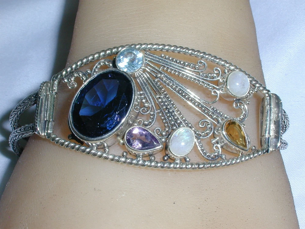 Add a touch of exotic elegance to your wardrobe with this stunning Bali bracelet. Crafted from bold sterling silver, this bracelet features a beautiful chain style adorned with A large sparkling blue quartz gemstone- plus topaz, Moonestones, Amethyst and Citrine sotnes. The bracelet is 7 3/4" to 8 3/4" long and is perfect for any occasion. The piece is made with 925 metal purity and is a wonderful addition to any fine jewelry collection. The bracelet's unique style and design reflect the beauty of Bali, making it a must-have for anyone who loves exotic fashion. Don't miss out on the opportunity to add this beautiful bracelet to your collection. DESCRIPTION: Hallmarked: 925 Weight: 28.67 Grams Width: 1 1/4" wide by 2 3/8" across the Centerpiece the band has a double chain and a toggle clasp Length: Can be worn from 7 3/4 to 8 3/4" long It looks just stunning on the Wrist! Free US domestic shipping , international shipping is available at actual first class rates. Please see my other listings for more great jewelry.