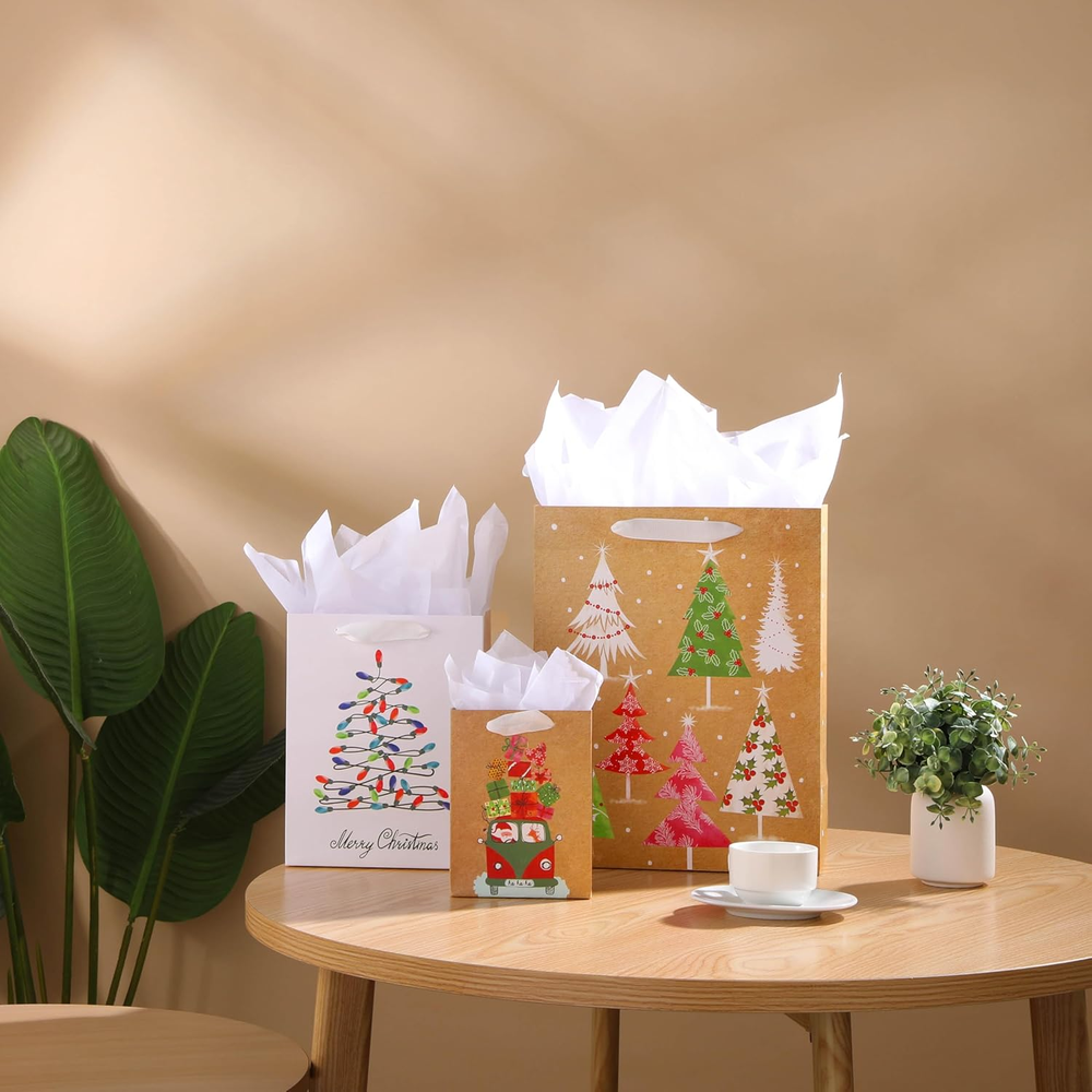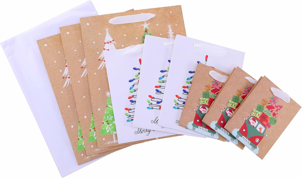Assorted Sizes-- Large bags:13" * 10.2" * 5.5", Medium bags: 9" * 7" * 4", Small bags:6.3" * 4.7" * 2.4". 3 bags for each design, 9 bags in total. 18 sheets of white tissue paper in total. These assorted Sizes of Christmas holiday theme gift bags are perfect for birthday treat bags, goodie bags, party bags, gift bags, party favor bags, holiday gift bags, Xmas Gift Bags, retail bags, and more. Product Description Christmas Gift Wrappings - Wrap the Holidays in Vibrant Cheer! Add to Cart Add to Cart Add to Cart Add to Cart Add to Cart Customer Reviews 4.8 out of 5 stars 60 4.8 out of 5 stars 98 4.7 out of 5 stars 86 4.8 out of 5 stars 100 4.7 out of 5 stars 386 Price $9.99 $ 9 . 99 $13.99 $ 13 . 99 $9.59 $ 9 . 59 $12.99 $ 12 . 99 $18.99 $ 18 . 99 Size 13" 13", 9" 13", 9", 6" 13", 9", 6" 13", 11", 9" Count 3 6 9 9 24 Dessign 3 6 3 3 6 Tissue Paper 9 red tissue paper 12 white tissue paper 18 white tissue paper 18 white tissue paper 24 white tissue paper Material cardstock cardstock cardstock cardstock kraft paper SUNCOLOR Charming Christmas Gift Bags for Joyful Giving Wrap your gifts in festive style with our gift bags, Impress and make every present memorable. SUNCOLOR Luxurious Christmas Boxes for Perfect Presents Impress with our elegant Christmas gift boxes, enhances your holiday gifting. SUNCOLOR Festive Christmas Tissue Paper for Every Gift Add the final touch with our Christmas tissue paper. Make each gift extra special this season. 1 Gift Bags 2 Gift Boxes 3 Tissue Paper The video showcases the product in use. The video guides you through product setup. The video compares multiple products. The video shows the product being unpacked.