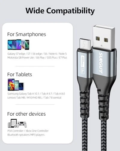 SUNGUY Micro USB Cable 1FT[3Pack], 18W Short USB to Micro USB Cable Fast Charging USB 2.0 Data Sync Nylon Braided for Samsung Galaxy S7 Edge S6, Power Bank, Android Phone, PS4 Specifications - Color: Gray - Length:1ft /0.3m - Connector: standard micro usb ; - Support fast charging QC2.0 QC 3.0; - USB 2.0,data transfer speed up to 480 Mbps Compatible with : - Samsung Galaxy S7/S7 Edge / S6 / S6 Edge / S4 / A5 A7 A9, Note 4 5 Tab pro A S2,etc; - Motorola Moto G4 / G4 Plus / G4 Play / G5S / G5s Plus / G5 / G5 Plus / E4 Plus / E4 ; - Huawei P9 Lite / P10 Lite /Mate 10 Lite / Mate 8 /Honor 7X ; - LG V10 / G4 / Stylo 2 / Stylo 3 Plus / G Pro 2 / G Flex2; - SONY Xperia Z5 / Xperia Z3 / Xperia Z3 Compact ; - Nokia 6 / 5 / 3; - Lonve Blue 16GB MP4/MP3 - Amazon Kindle Fire HD and HDX; - And more smart devices with Micro USB Connector. SUNGUY 12 Month Warranty - If there is any problem with the cable used during the warranty time, please contact us for replacement or refund via Amazon email or SUNGUY Customer Support email (Artificial damage except). Package Contents: 3 Pack 1ft Micro USB Cables šćSupport Fast ChargećThe micro usb cable support QC 3.0/2.0 fast charging, deliver up to 18W(max) power. 1ft micro usb cable is short design. Ideal for short-distance charging, easy to carry. šćUSB 2.0 Data TransferćSUNGUY USB Micro Cable support up to 480Mbps data transfer. High speed transfer HD movies, songs, files or photos. ā ļøAttention! Not work for Lightning and USB Type C devices. š”ćDurable and FlexiblećSUNGUY usb charger cable lead end adopt high quality standard micro connecter, perfectly plug into the charge port of your devices; Aluminum constructed connectors have reinforced flexible jacket necks to reduce damage from bending, more durable, flexible, wear-resistant and pull- resistant. š±ćWide CompatibilityćCompatible with Samsung Galaxy S7 / S7 Edge / S6 / S6 Edge / S4 / A5 A7 A9 / Tab 4, Motorola Moto X / E4 / E4 Plus / G5 / G5 Plus / G5S / G5S Plus,Sony Xperia Z3 / Z5, Mp3, E-Readers, HTC, LG, tablets and more devices with micro connector. š¢ćWhar You GetćYou will receive 3 Pack 1 Feet Micro USB Cable. If any questions please contact us via Amazon Email or SUNGUY Customer Support Email. Shipping from the USA All of our products are shipped from the USA, ensuring quick delivery to your destination. Payment We offer the following payment methods: PayPal, credit card, bank transfer, and eBay's secure payment system. Free Shipping & Free Returns Shipping within the USA is FREE. Additionally, any return is absolutely free for you. Risk-Free Purchase You have the option to return an item within 30 days without any justification. We cover the return shipping costs! Fast Shipping We ship immediately upon receipt of payment. Generally, the package is delivered within 2-3 days in the USA. If it takes longer, we will contact you. Quality and Costs Made in Europe, USA, China No customs fees or additional charges Total satisfaction guarantee Invoice with declared VAT available upon request in .pdf format Feedback Your feedback is very important to us. After you pay for your purchase, you will automatically receive positive feedback from us.